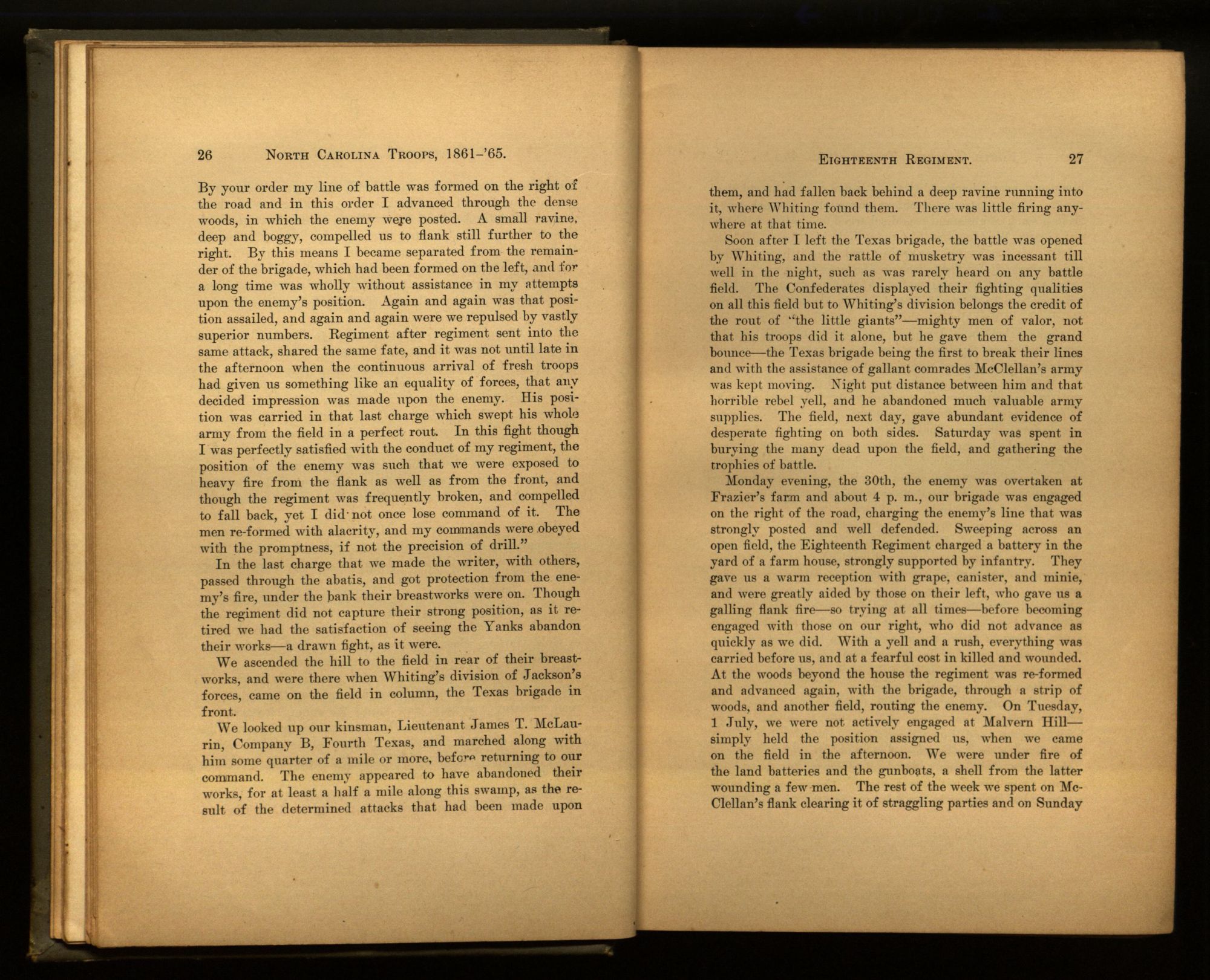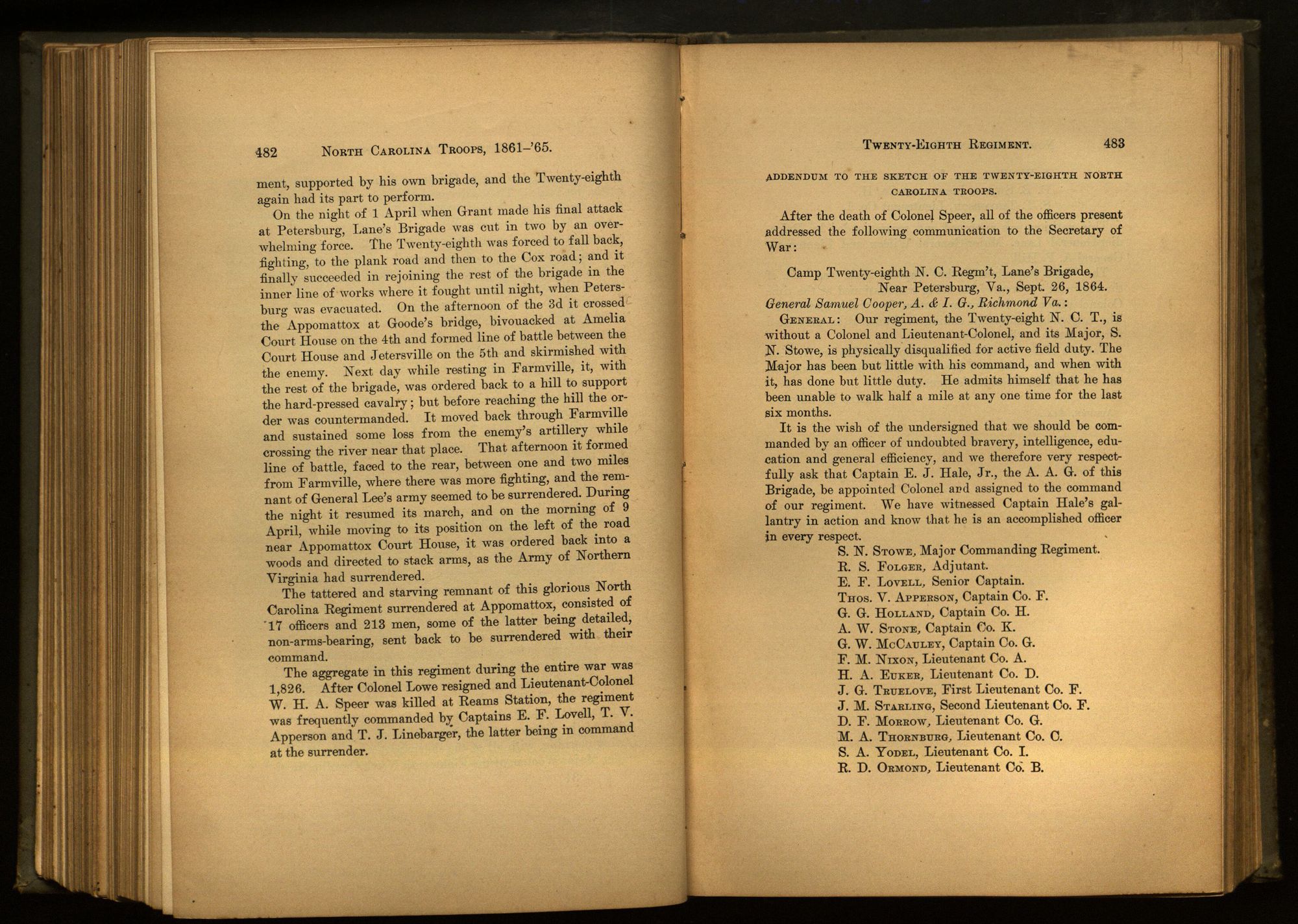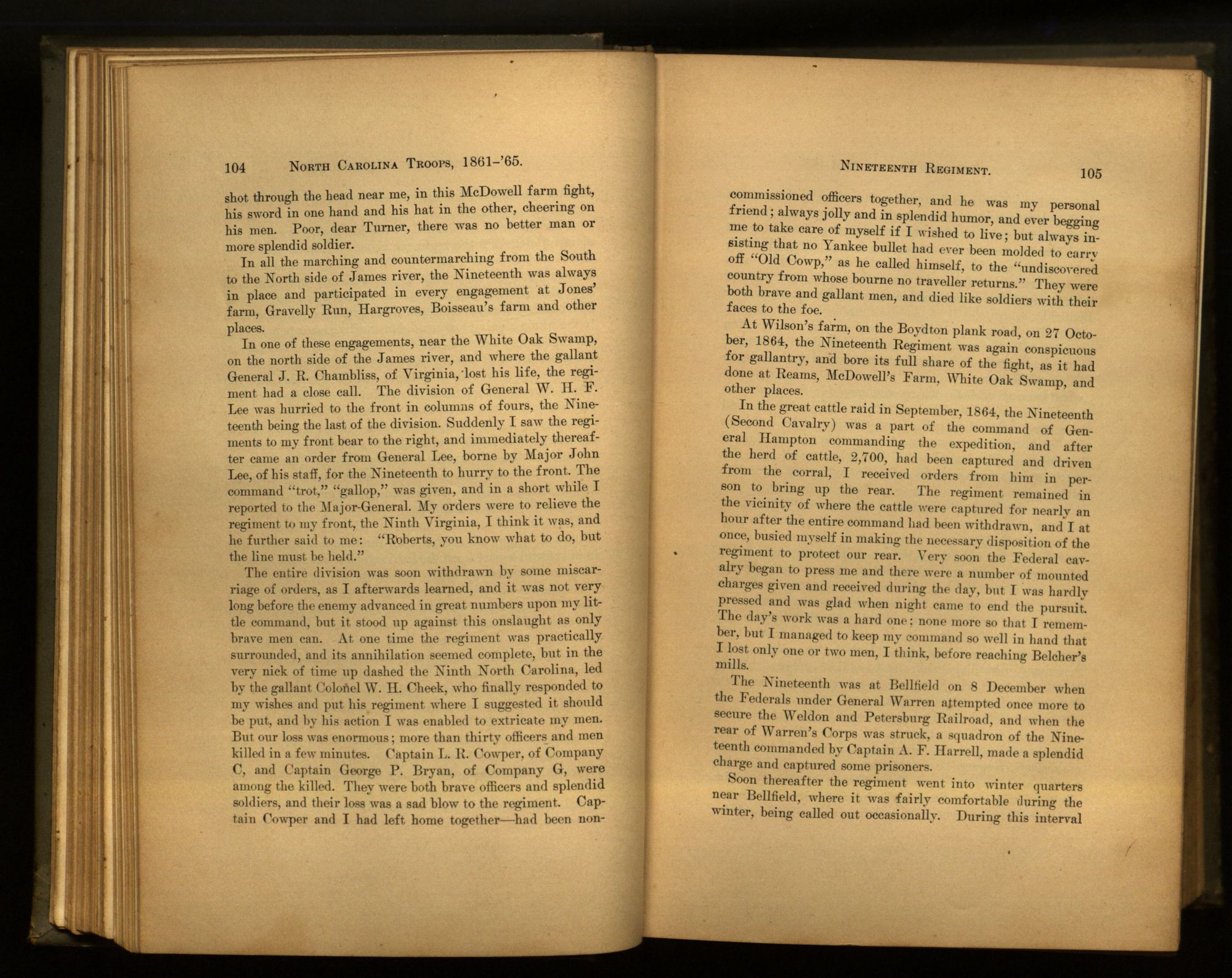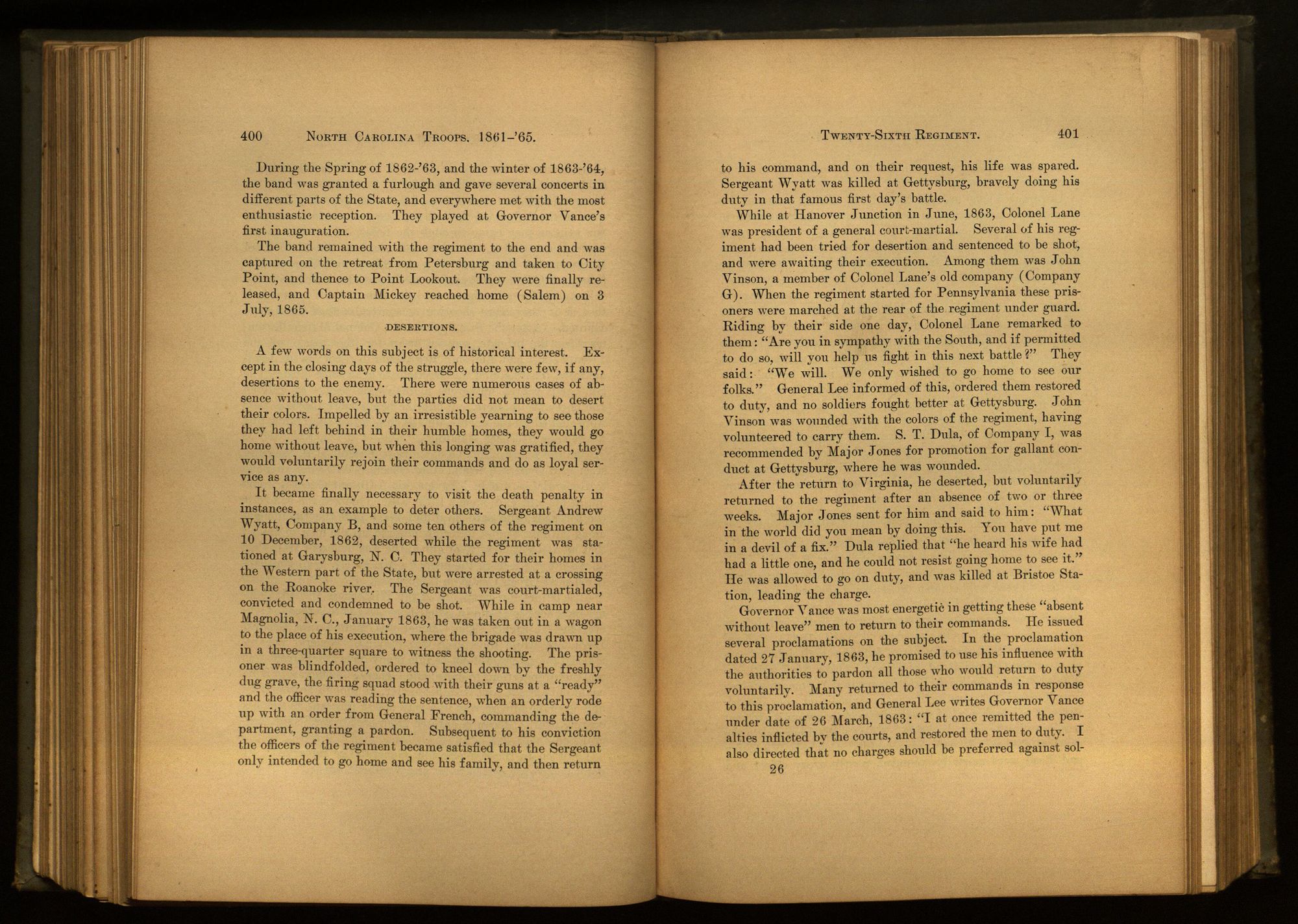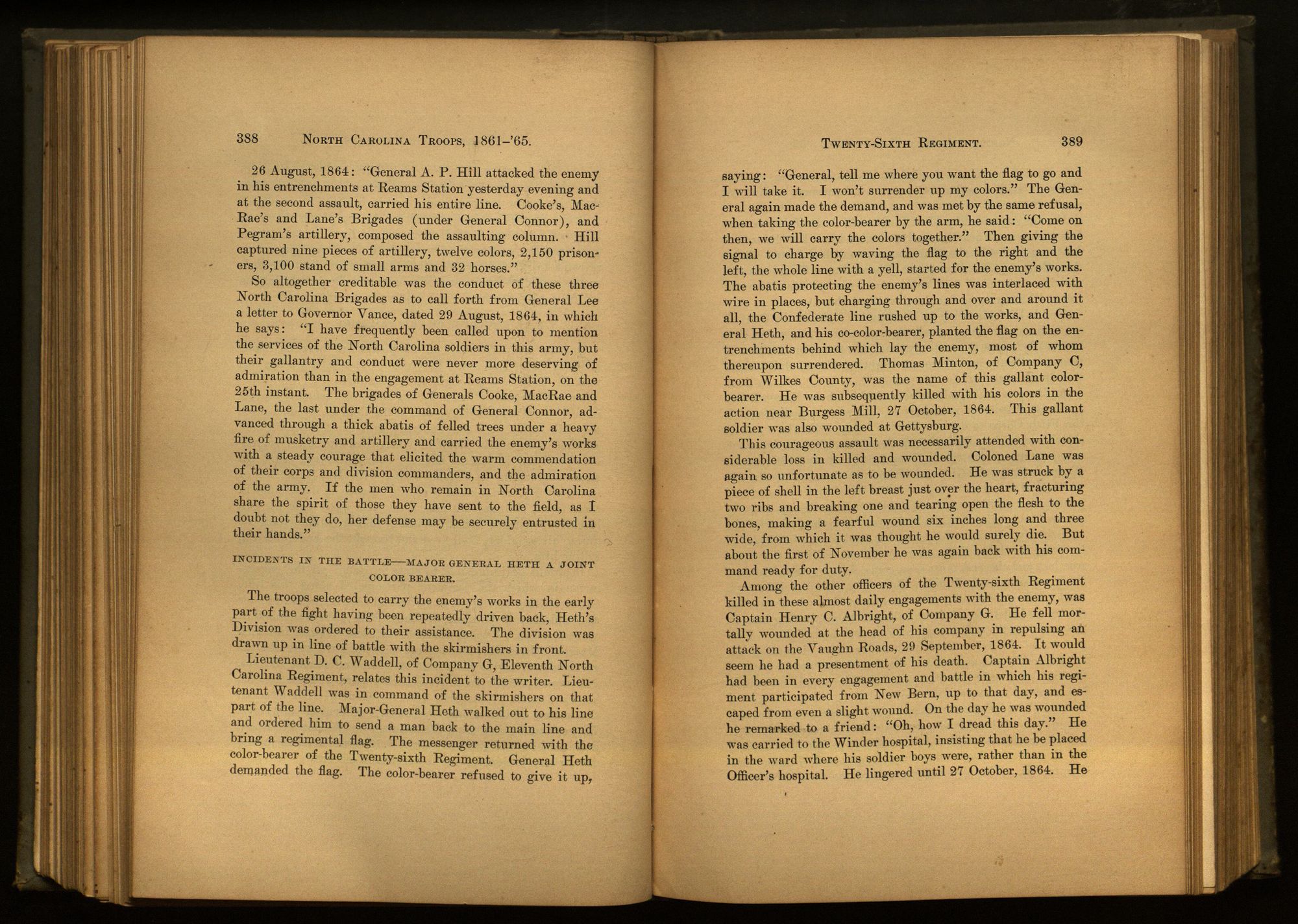 Histories of the several regiments and battalions from North Carolina, in the great war 1861-'65. Written by members of the respective commands. Ed. by Walter Clark. Pub. by the state. Wendell, N.C. (Rte. 2, Box 28A, Wendell 27591) Broadfoot's Bookmark, 1982. 5 v., ill., ports., maps ; 24 cm. Cover title: First at Bethel, farthest to the front at Gettysburg and Chickamauga, last at Appomattox. Spine title: North Carolina regiments, 1861-'65. Reprint. Originally published: [Raleigh, N.C.] : E.M. Uzzell, 1901. Includes indexes.