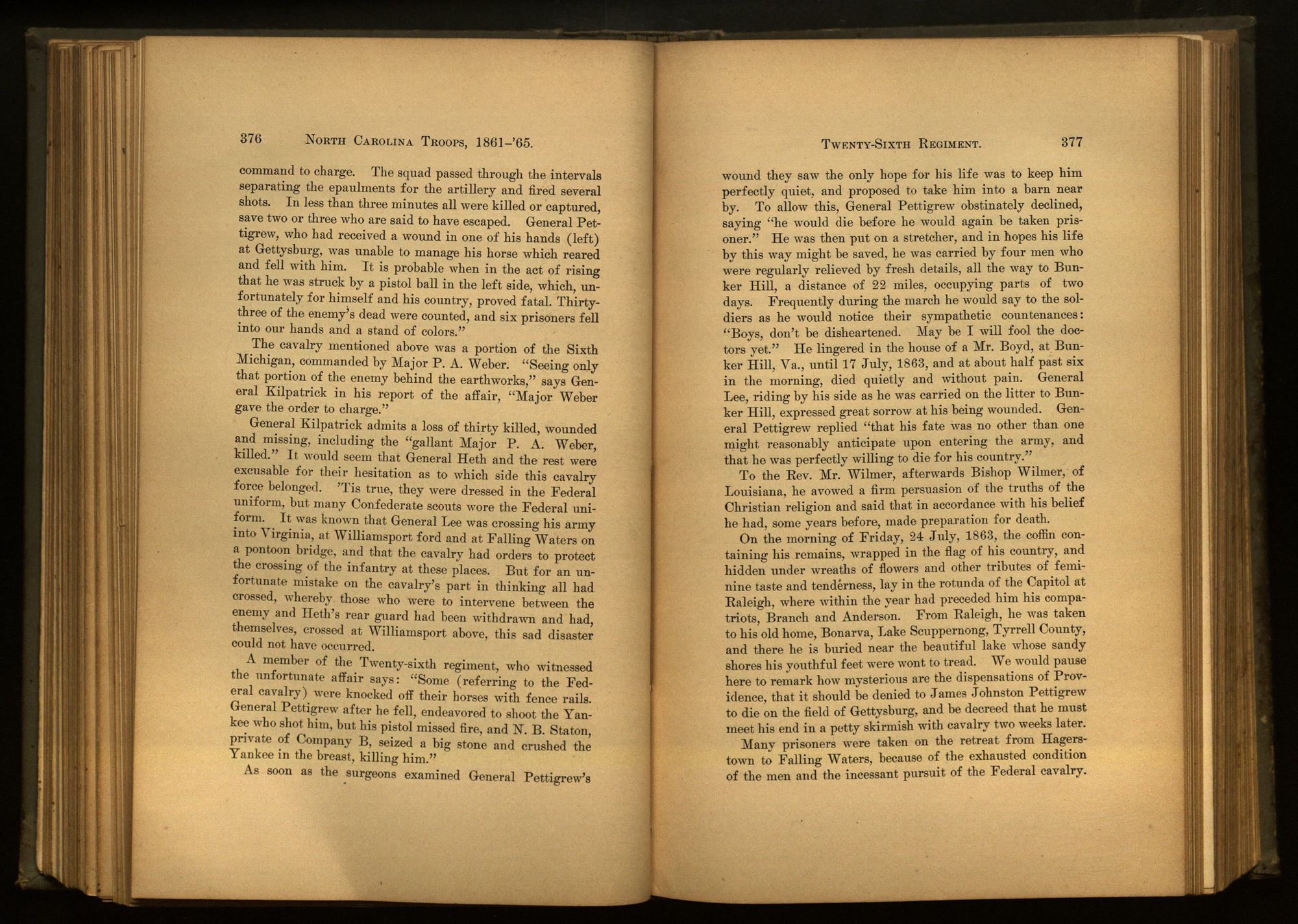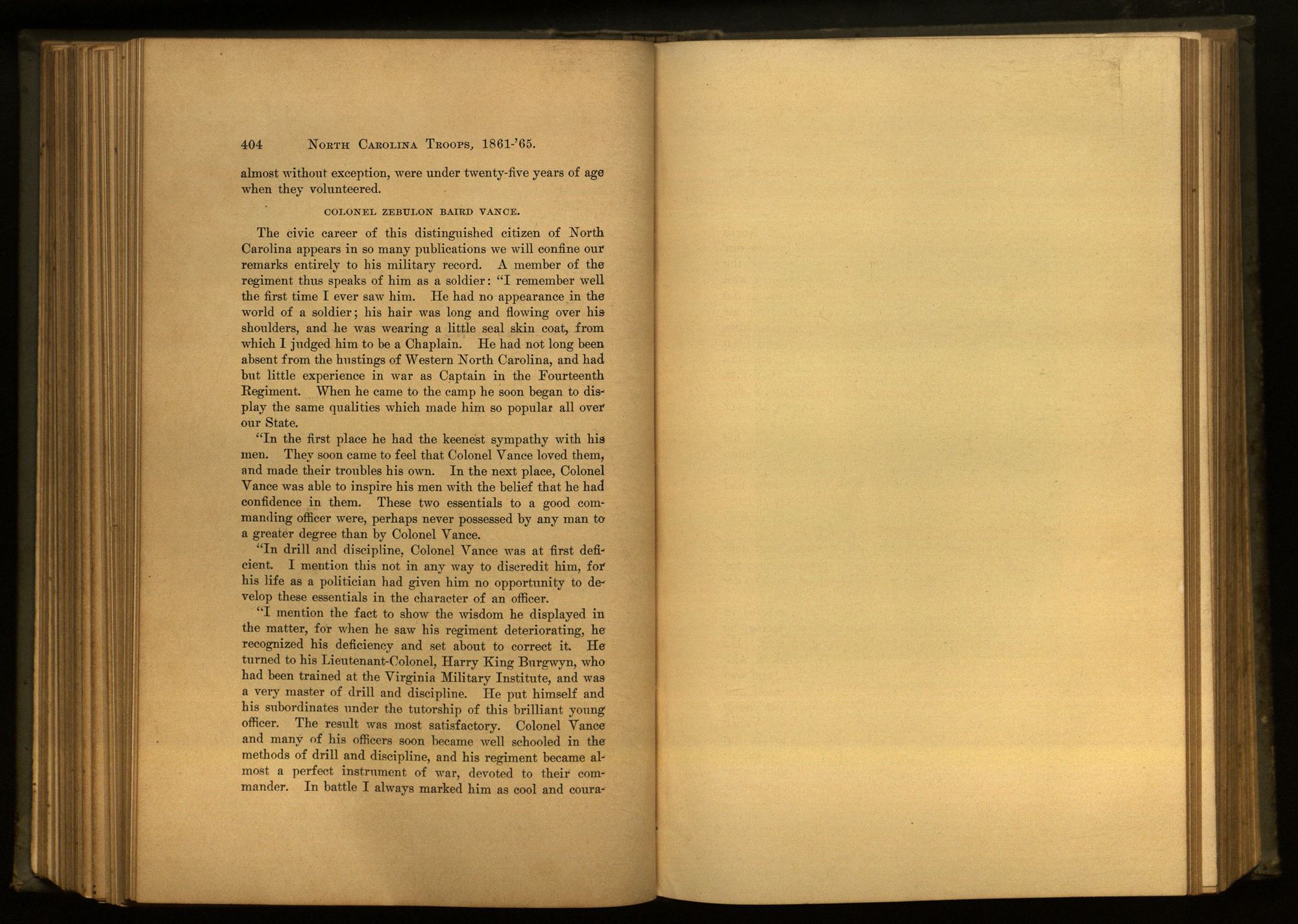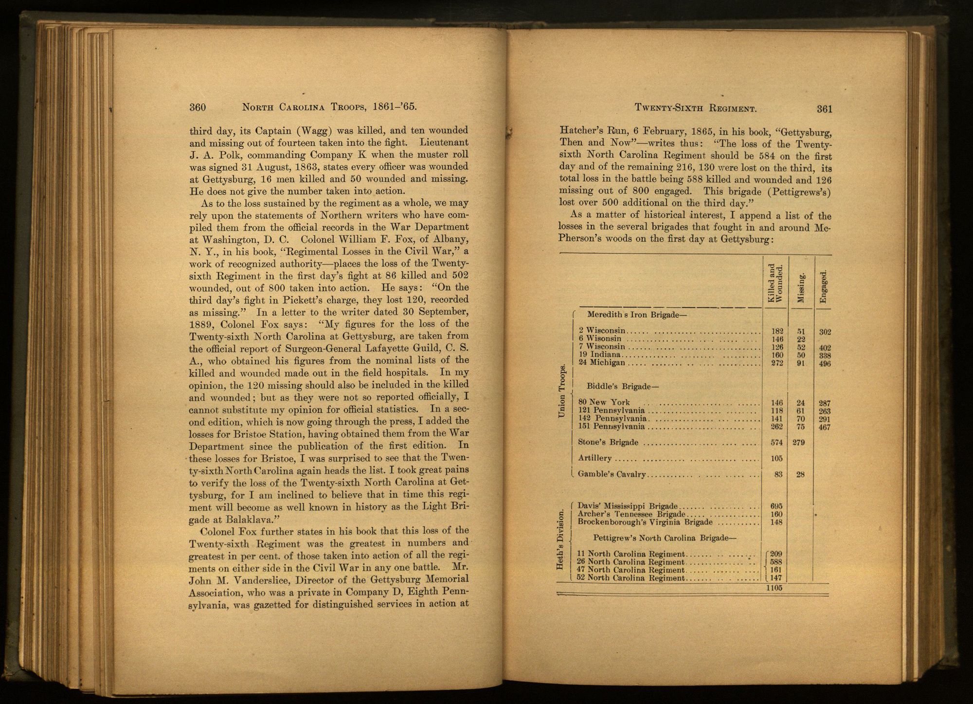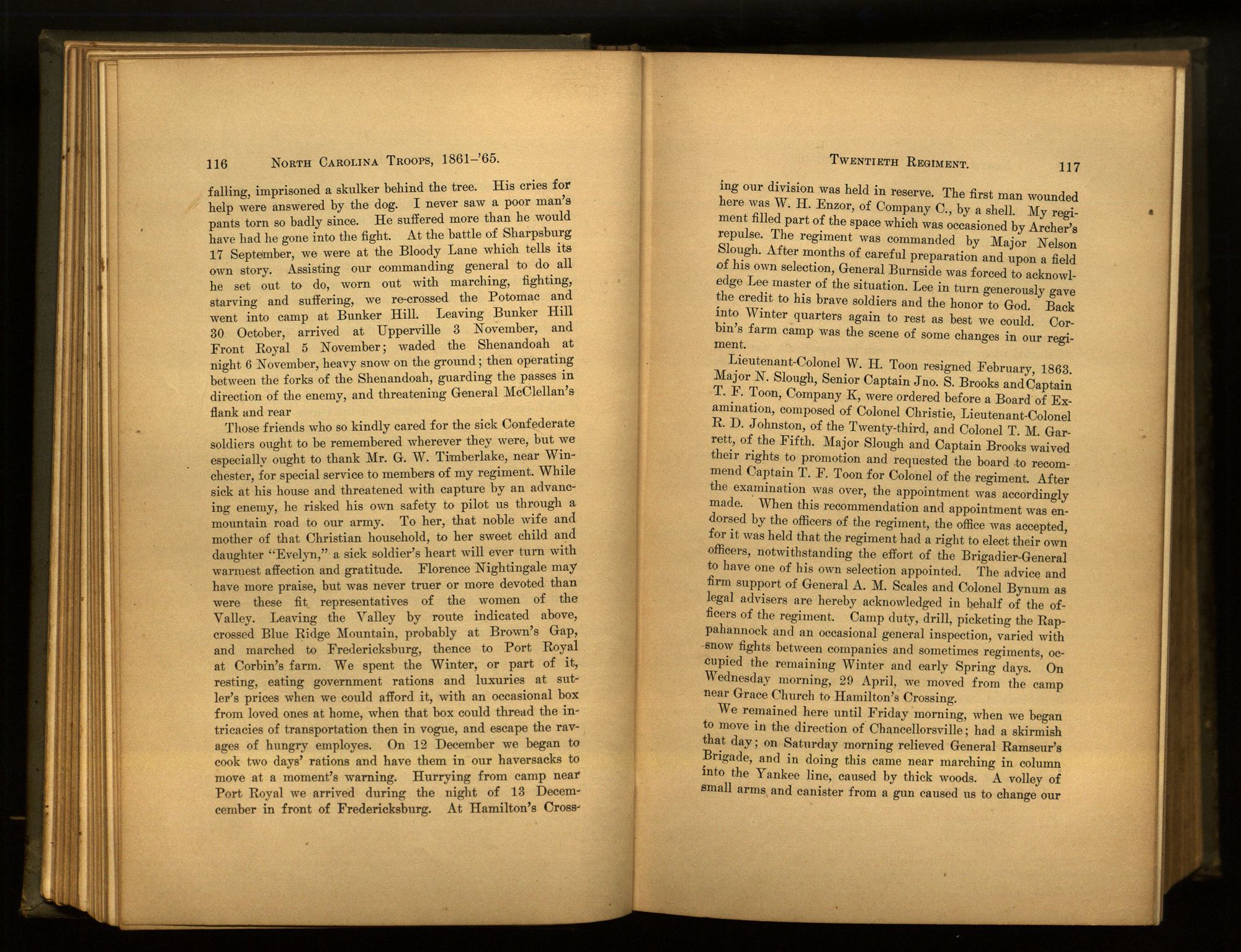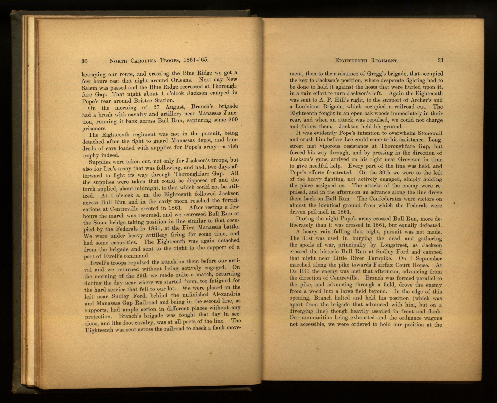 Histories of the several regiments and battalions from North Carolina, in the great war 1861-'65. Written by members of the respective commands. Ed. by Walter Clark. Pub. by the state. Wendell, N.C. (Rte. 2, Box 28A, Wendell 27591) Broadfoot's Bookmark, 1982. 5 v., ill., ports., maps ; 24 cm. Cover title: First at Bethel, farthest to the front at Gettysburg and Chickamauga, last at Appomattox. Spine title: North Carolina regiments, 1861-'65. Reprint. Originally published: [Raleigh, N.C.] : E.M. Uzzell, 1901. Includes indexes.