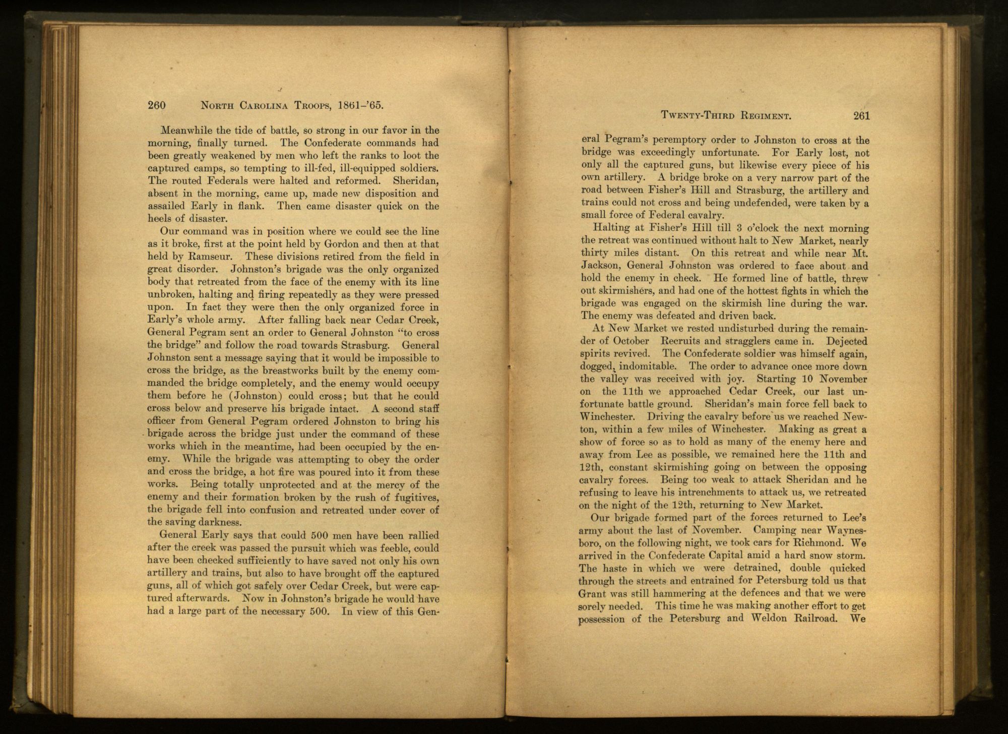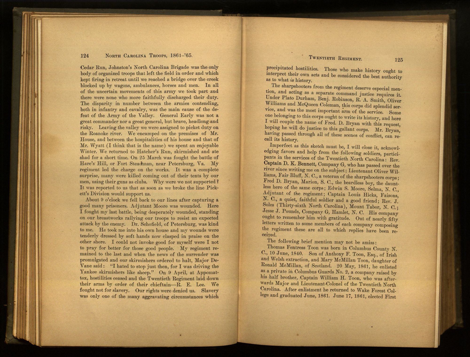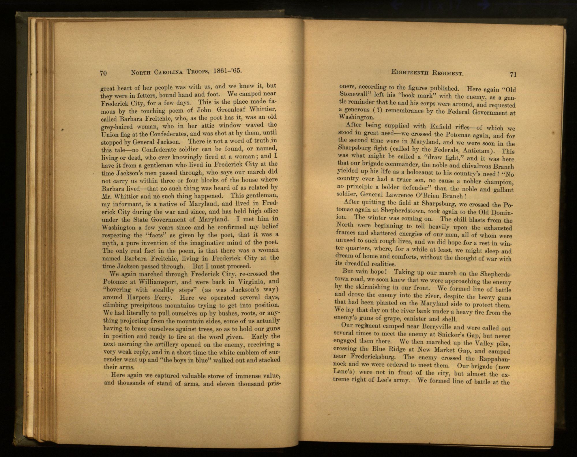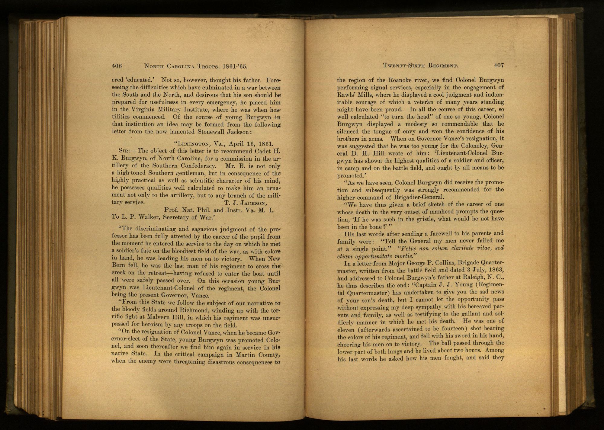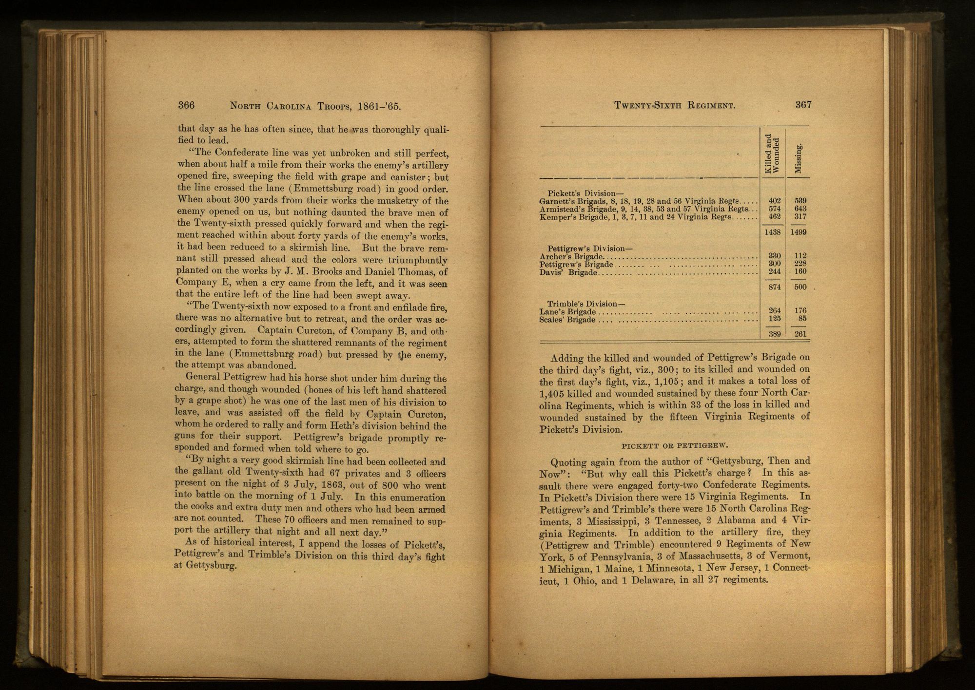Histories of the several regiments and battalions from North Carolina, in the great war 1861-'65. Written by members of the respective commands. Ed. by Walter Clark. Pub. by the state. Wendell, N.C. (Rte. 2, Box 28A, Wendell 27591) Broadfoot's Bookmark, 1982. 5 v., ill., ports., maps ; 24 cm. Cover title: First at Bethel, farthest to the front at Gettysburg and Chickamauga, last at Appomattox. Spine title: North Carolina regiments, 1861-'65. Reprint. Originally published: [Raleigh, N.C.] : E.M. Uzzell, 1901. Includes indexes.