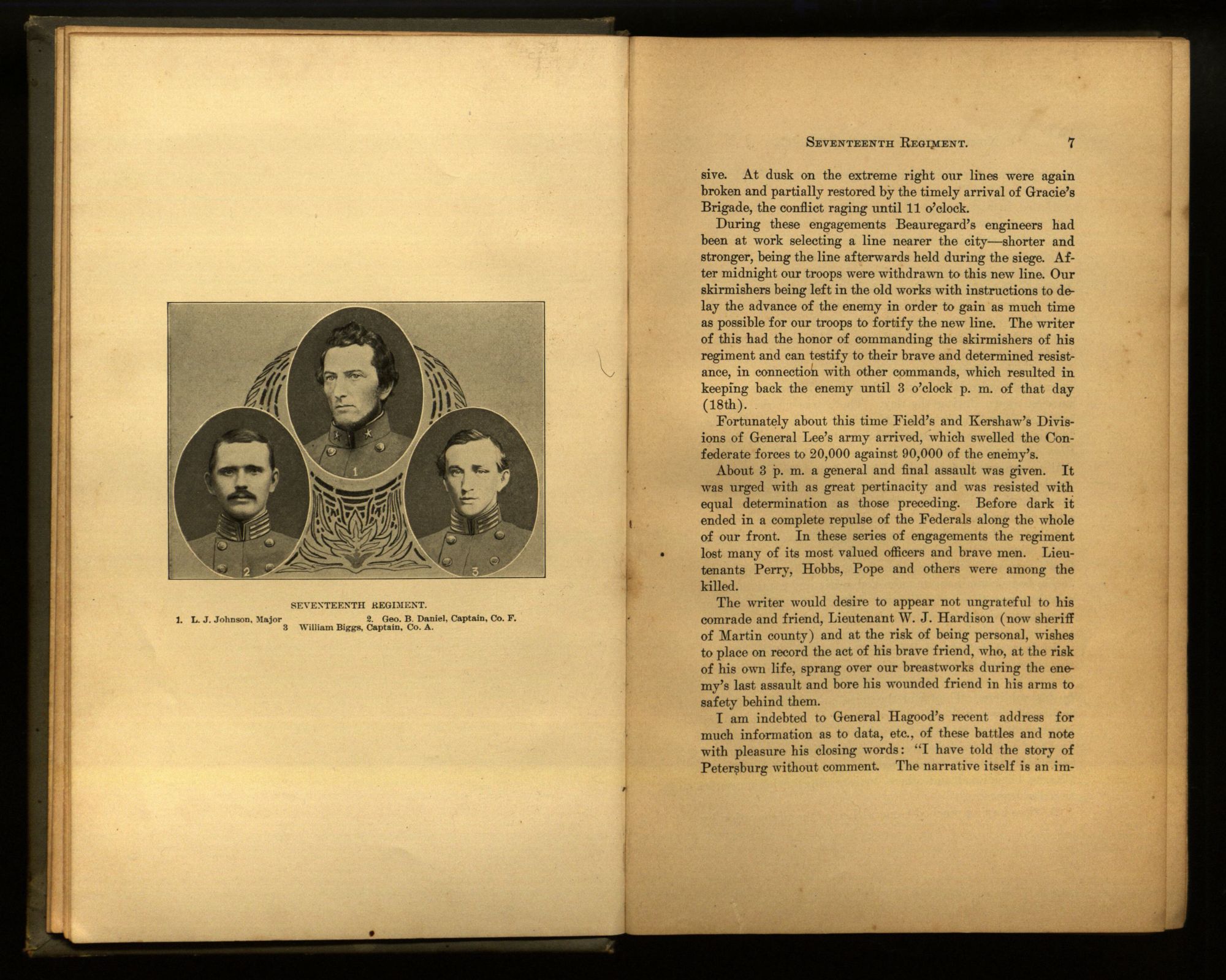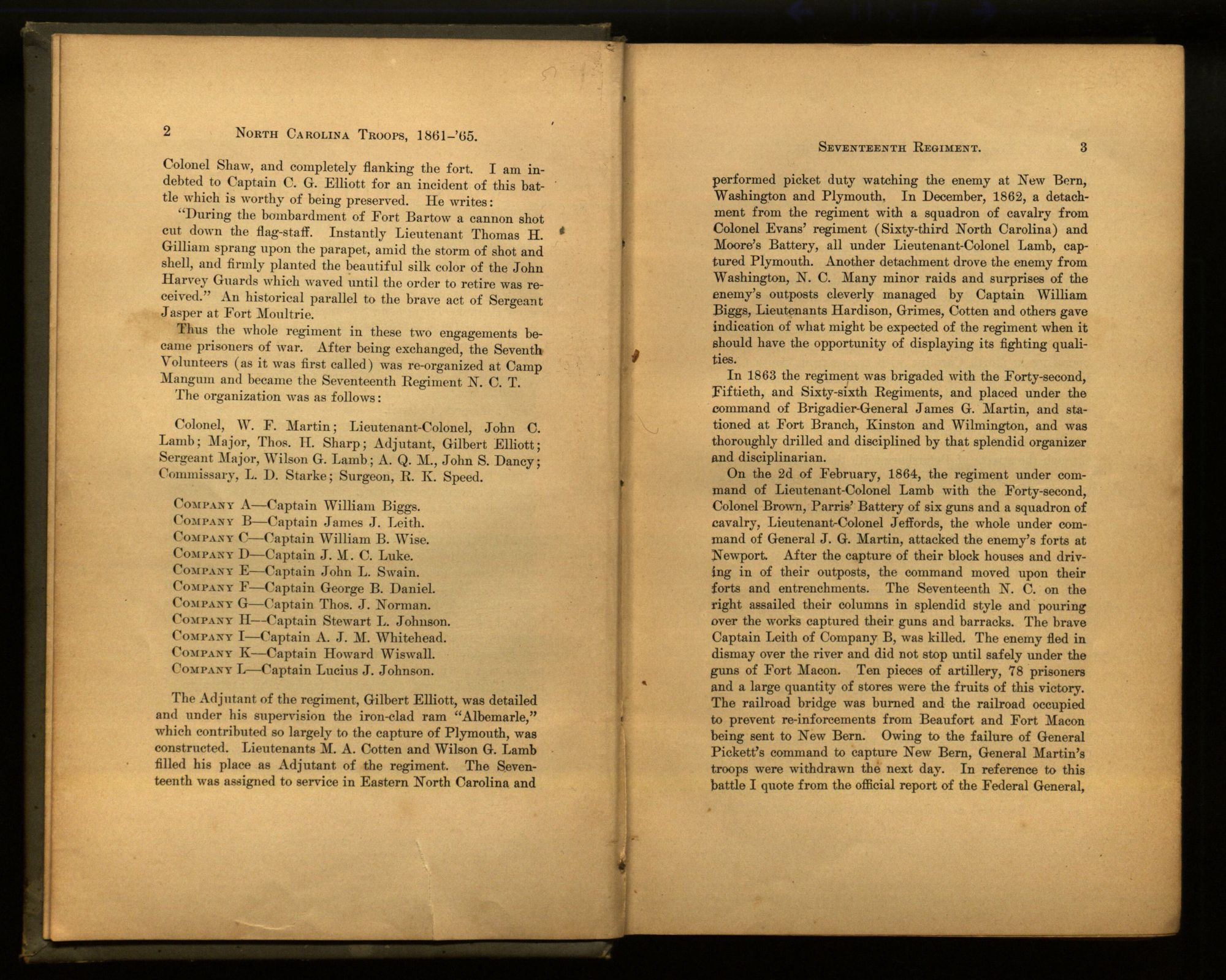 The Adjutant of the regiment, Gilbert Elliott, was detailed and under his supervision the iron-clad ram "Albemarle," which contributed so largely to the capture of Plymouth, was constructed. Lieutenants M. A. Cotten and Wilson G. Lamb filled his place as Adjutant of the regiment. The Seventeenth was assigned to service in Eastern North Carolina and