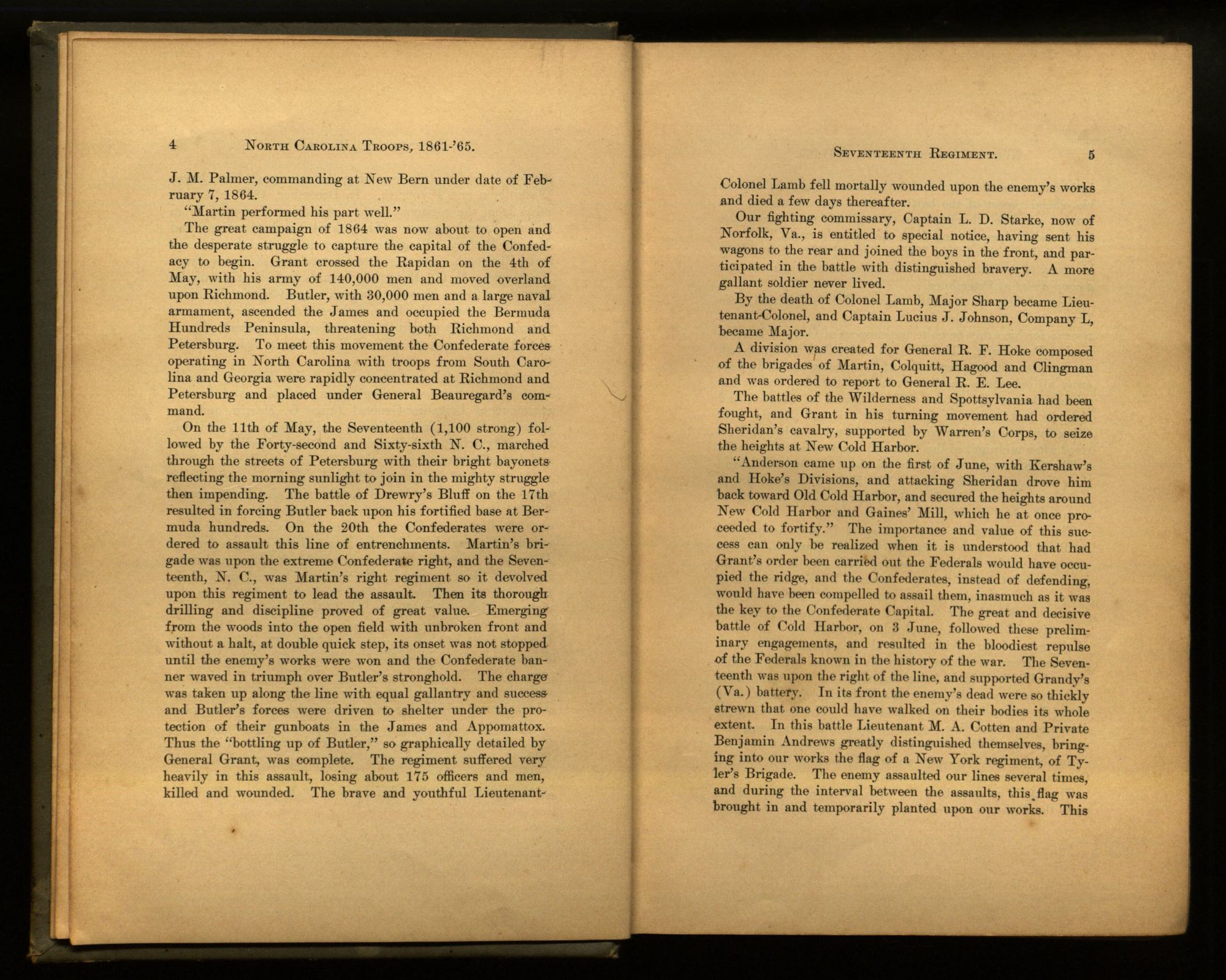 "Anderson came up on the first of June, with Kershaw's and Hoke's Divisions, and attacking Sheridan drove him back toward Old Cold Harbor, and secured the heights around New Cold Harbor and Gaines' Mill, which he at once proceeded to fortify." The importance and value of this success can only be realized when it is understood that had Grant's order been carried out the Federals would have occupied the ridge, and the Confederates, instead of defending, would have been compelled to assail them, inasmuch as it was the key to the Confederate Capital. The great and decisive battle of Cold Harbor, on 3 June, followed these preliminary engagements, and resulted in the bloodiest repulse of the Federals known in the history of the war. The Seventeenth was upon the right of the line, and supported Grandy's (Va.) battery. In its front the enemy's dead were so thickly strewn that one could have walked on their bodies its whole extent. In this battle Lieutenant M. A. Cotten and Private Benjamin Andrews greatly distinguished themselves, bringing into our works the flag of a New York regiment, of Tyler's Brigade. The enemy assaulted our lines several times, and during the interval between the assaults, this, flag was brought in and temporarily planted upon our works. This