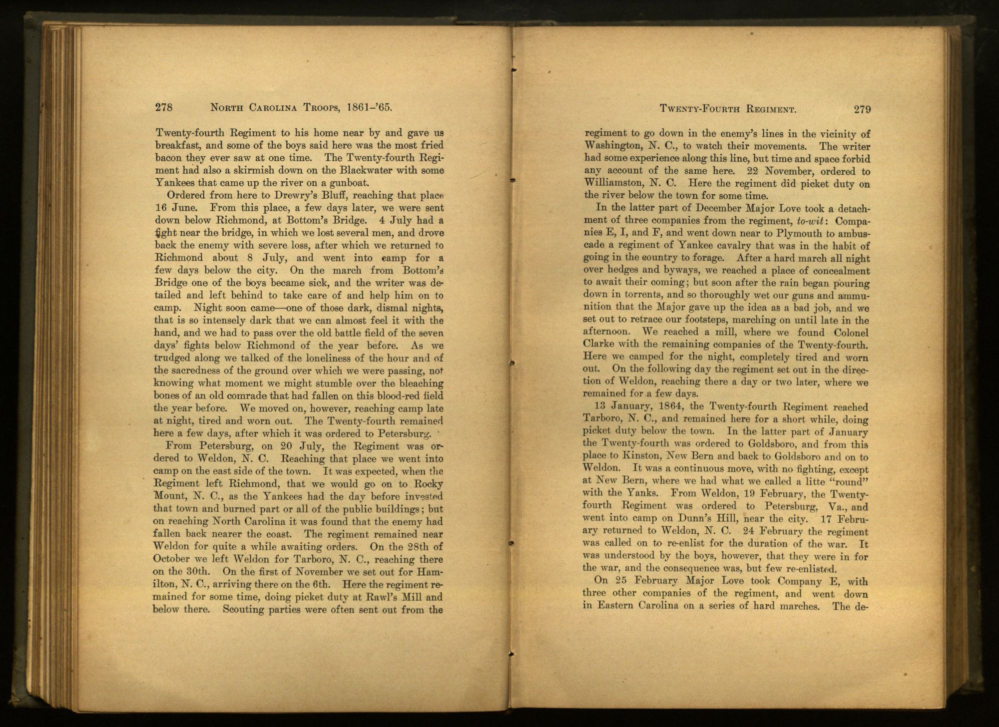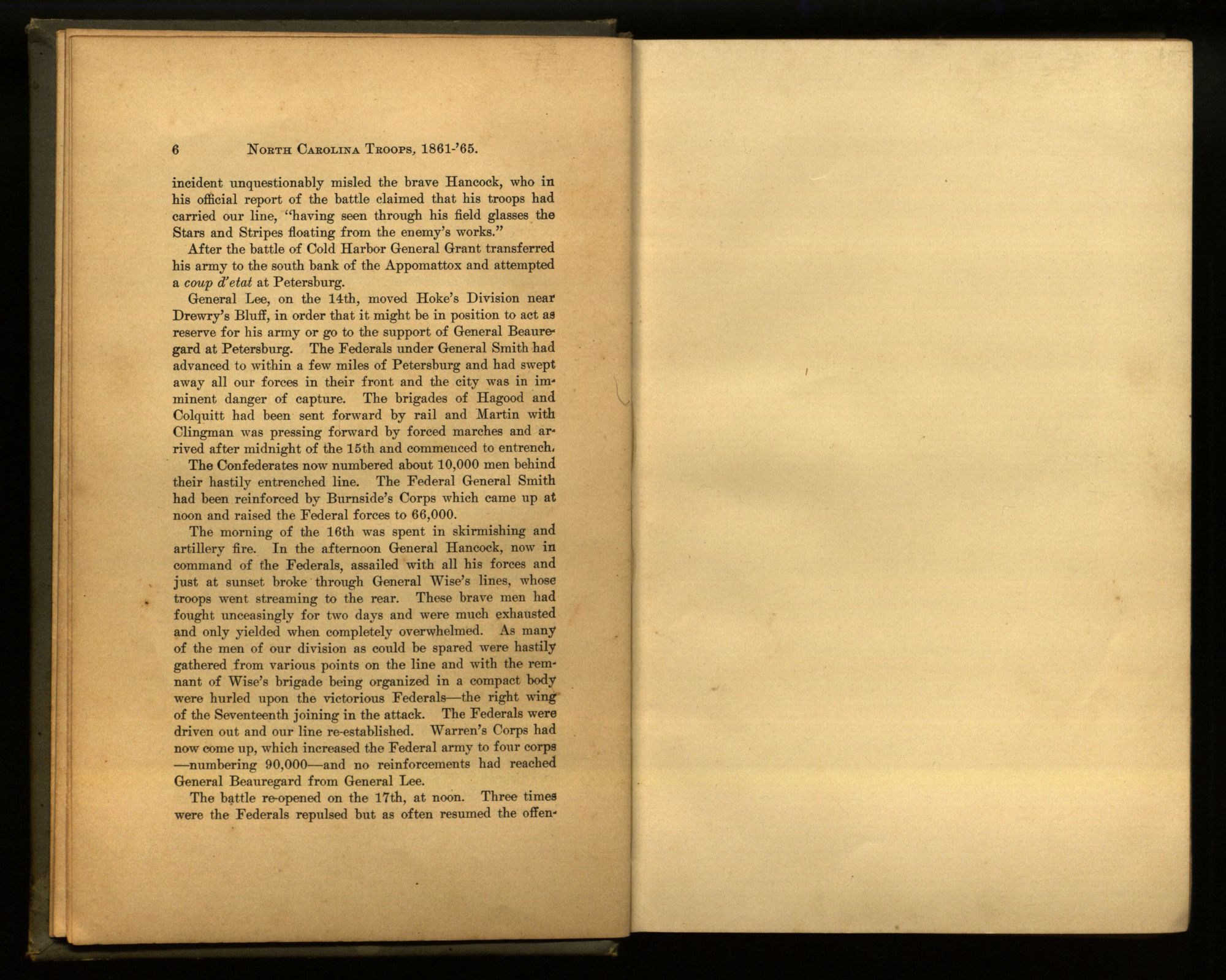 In April orders came to proceed to Weldon, N. C., and then to Plymouth, N. C., to relieve General Hoke, who was threatening Little Washington. After two weeks the brigade was hurried off via Tarboro to Petersburg, Va., which was threatened by General Butler on the north side of the Appomattox.