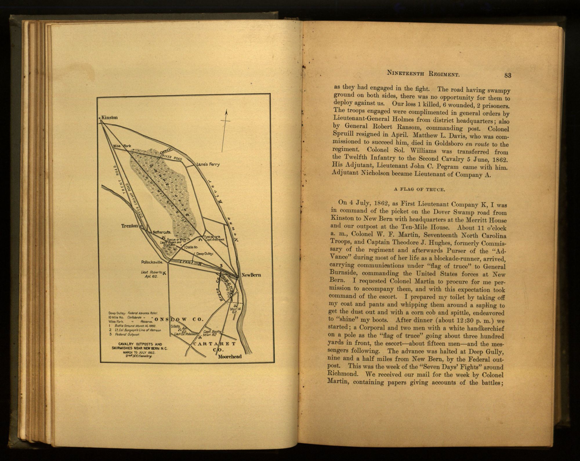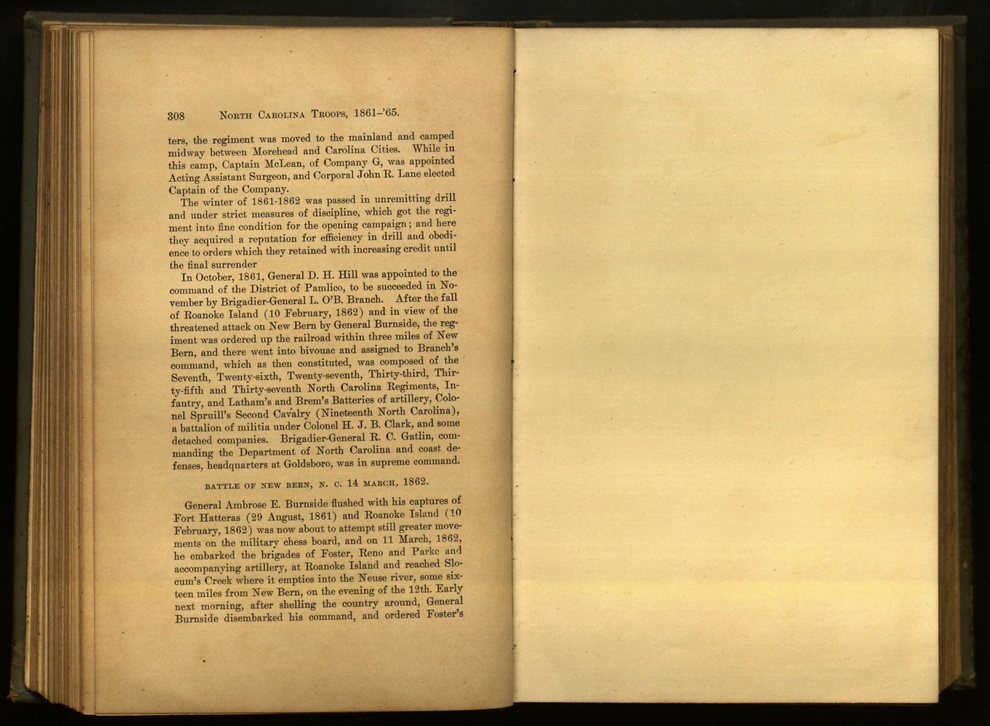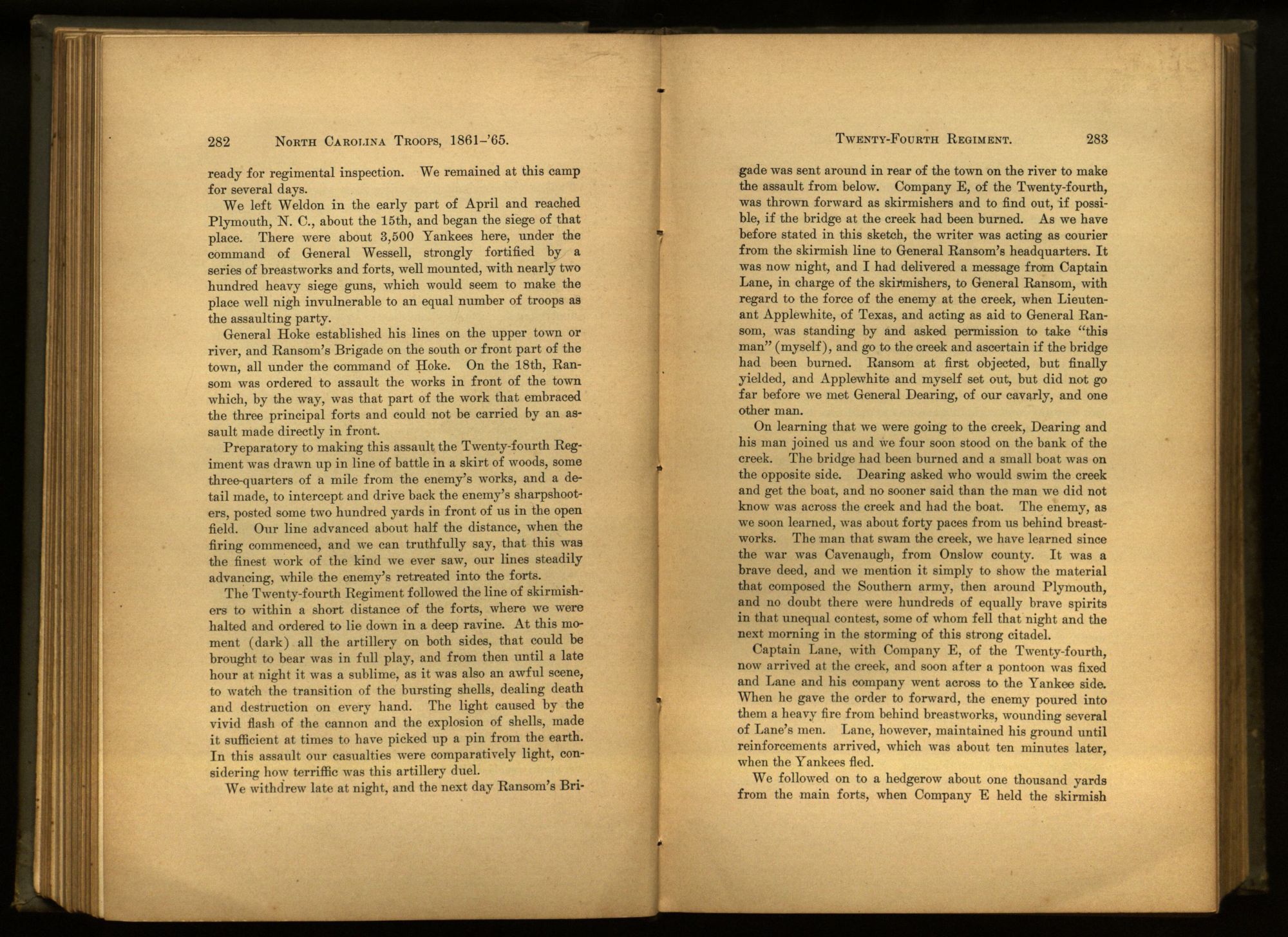 performed picket duty watching the enemy at New Bern, Washington and Plymouth. In December, 1862, a detachment from the regiment with a squadron of cavalry from Colonel Evans' regiment (Sixty-third North Carolina) and Moore's Battery, all under Lieutenant-Colonel Lamb, captured Plymouth. Another detachment drove the enemy from Washington, N. C. Many minor raids and surprises of the enemy's outposts cleverly managed by Captain William Biggs, Lieutenants Hardison, Grimes, Cotten and others gave indication of what might be expected of the regiment when it should have the opportunity of displaying its fighting qualities.