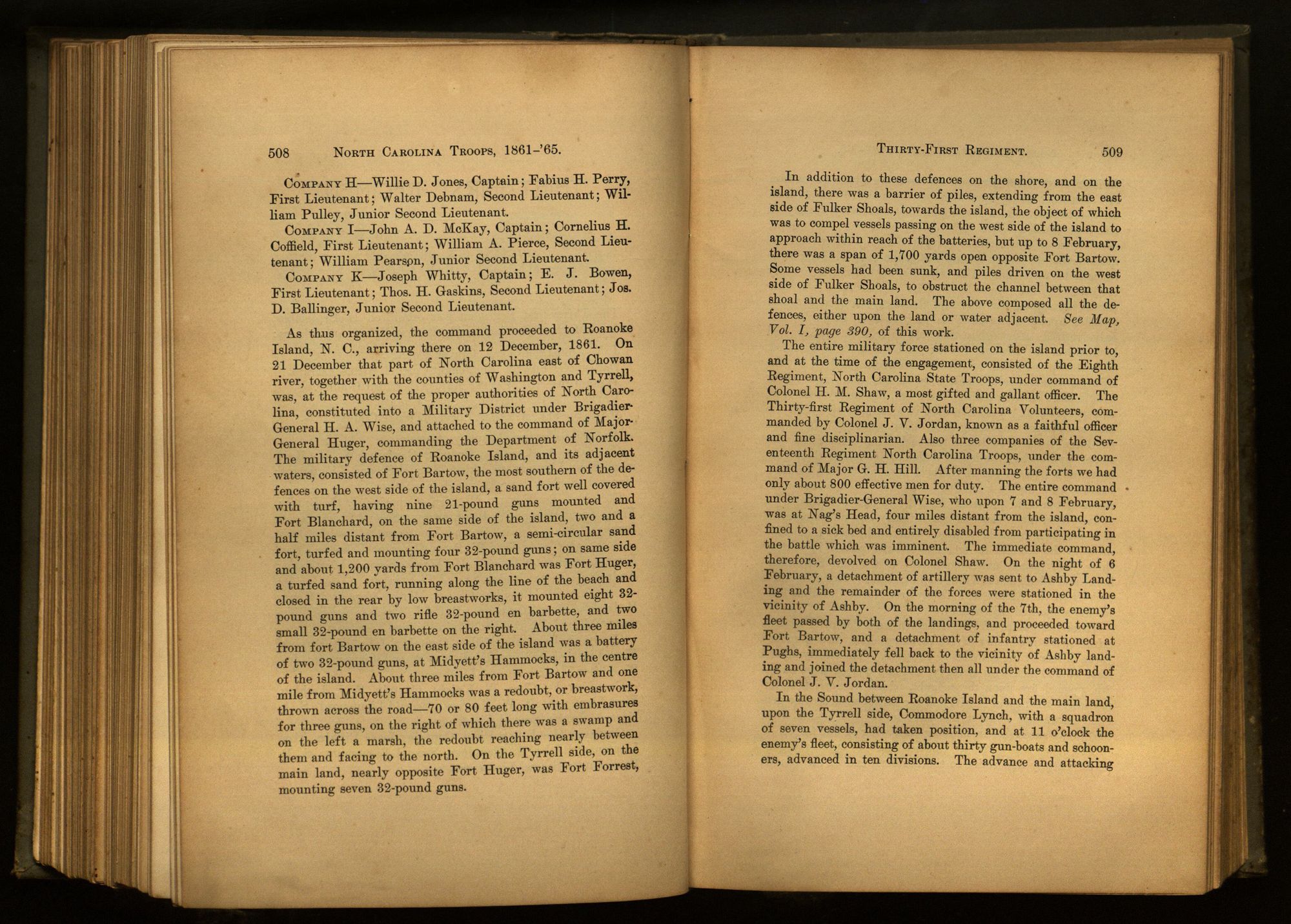 Fort Clark, commanded by Captain John C. Lamb, a mile up the beach, and Fort Hatteras, near the inlet, under the immediate command of Colonel Martin, constituted the defenses of Hatteras Inlet. The garrison, numbering less than 1,000 men, was attacked by the overwhelming land and naval forces of the Federal, and after an heroic defense surrendered as prisoners of war. Shortly thereafter the enemy, under General Burnside, moved upon Roanoke Island. The two companies constituting the balance of the Seventh Regiment garrisoned Fort Bartow, and, under the splendid leadership of Captain Fearing and Lieutenant C. G. Elliott, the latter afterwards the gallant and efficient Adjutant General to Generals Martin and Kirkland, succeeded by the accurate fire of their guns in keeping back the Federal fleet, and only surrendered after the landing of the Federal troops upon another part of the island, pushing back the Confederates under