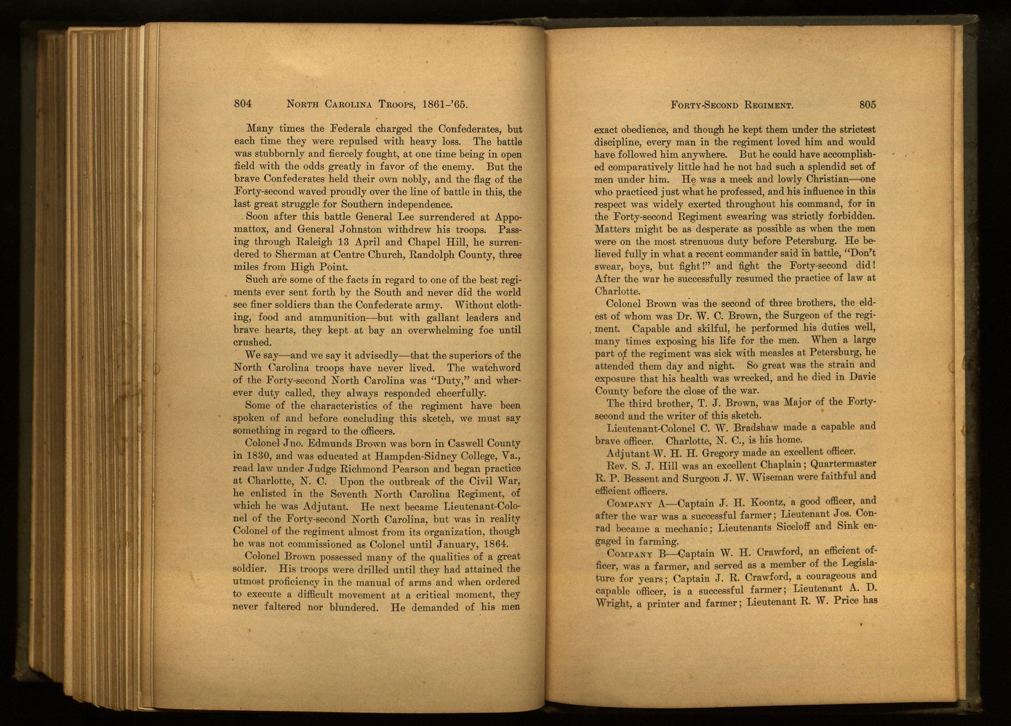 Colonel Brown was the second of three brothers, the eldest of whom was Dr. W. C. Brown, the Surgeon of the regiment. Capable and skilful, he performed his duties well, many times exposing his life for the men. When a large part of the regiment was sick with measles at Petersburg, he attended them day and night. So great was the strain and exposure that his health was wrecked, and he died in Davie County before the close of the war.