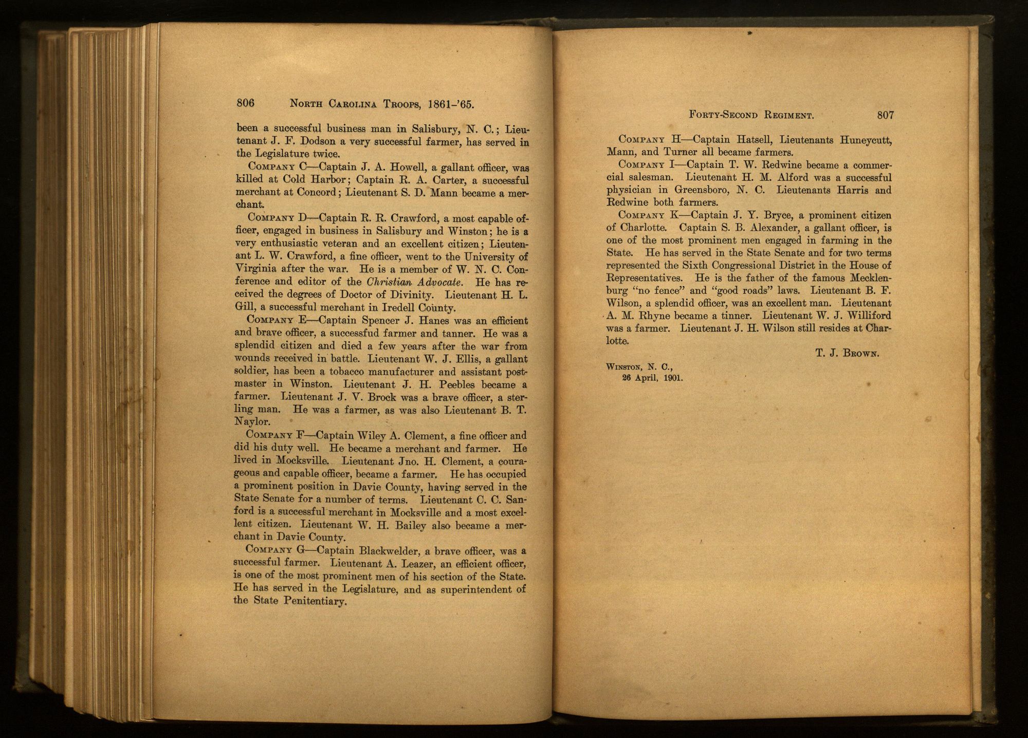 COMPANY E-Captain Spencer J. Hanes was an efficient and brave officer, a successfud farmer and tanner. He was a splendid citizen and died a few years after the war from wounds received in battle. Lieutenant W. J. Ellis, a gallant soldier, has been a tobacco manufacturer and assistant post-master in Winston. Lieutenant J. H. Peebles became a farmer. Lieutenant J. V. Brock was a brave officer, a sterling man. He was a farmer, as was also Lieutenant B. T. Naylor.