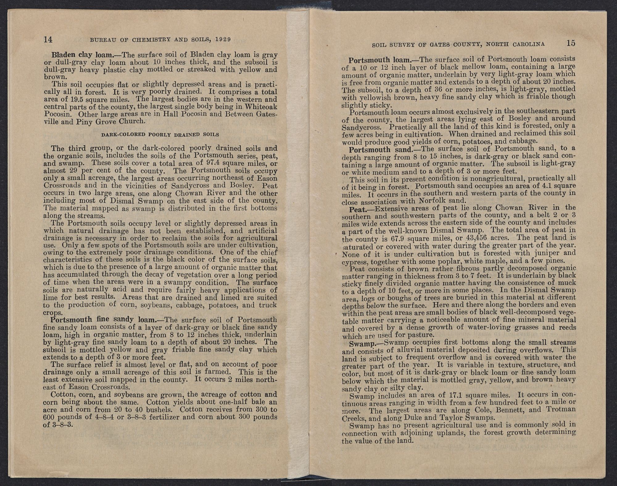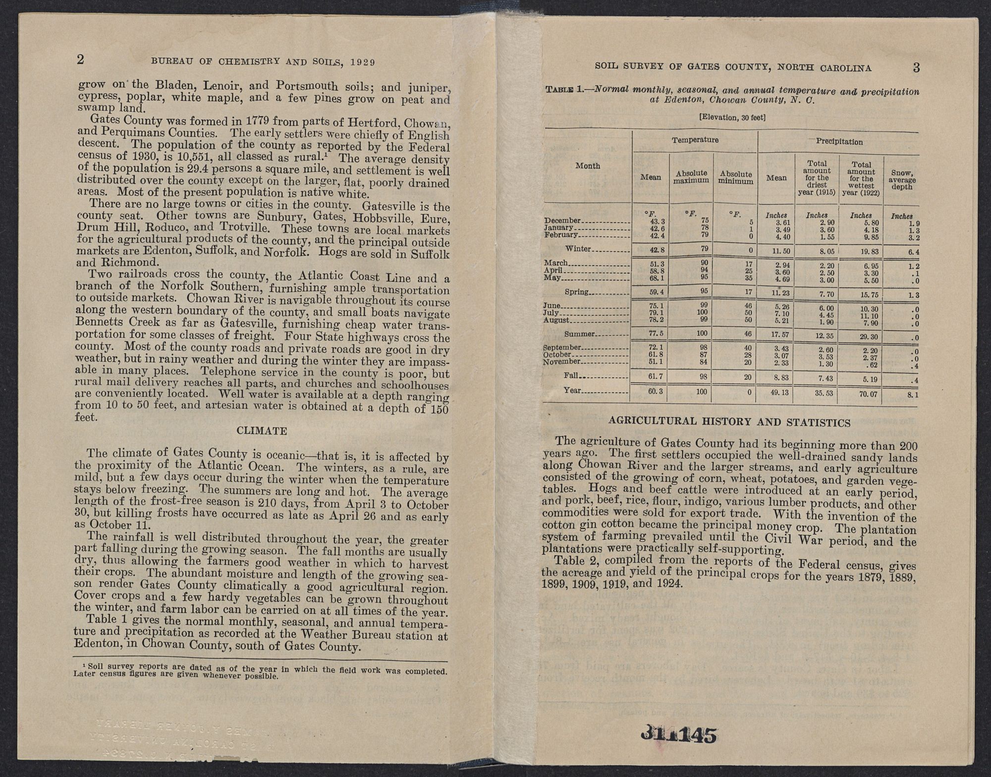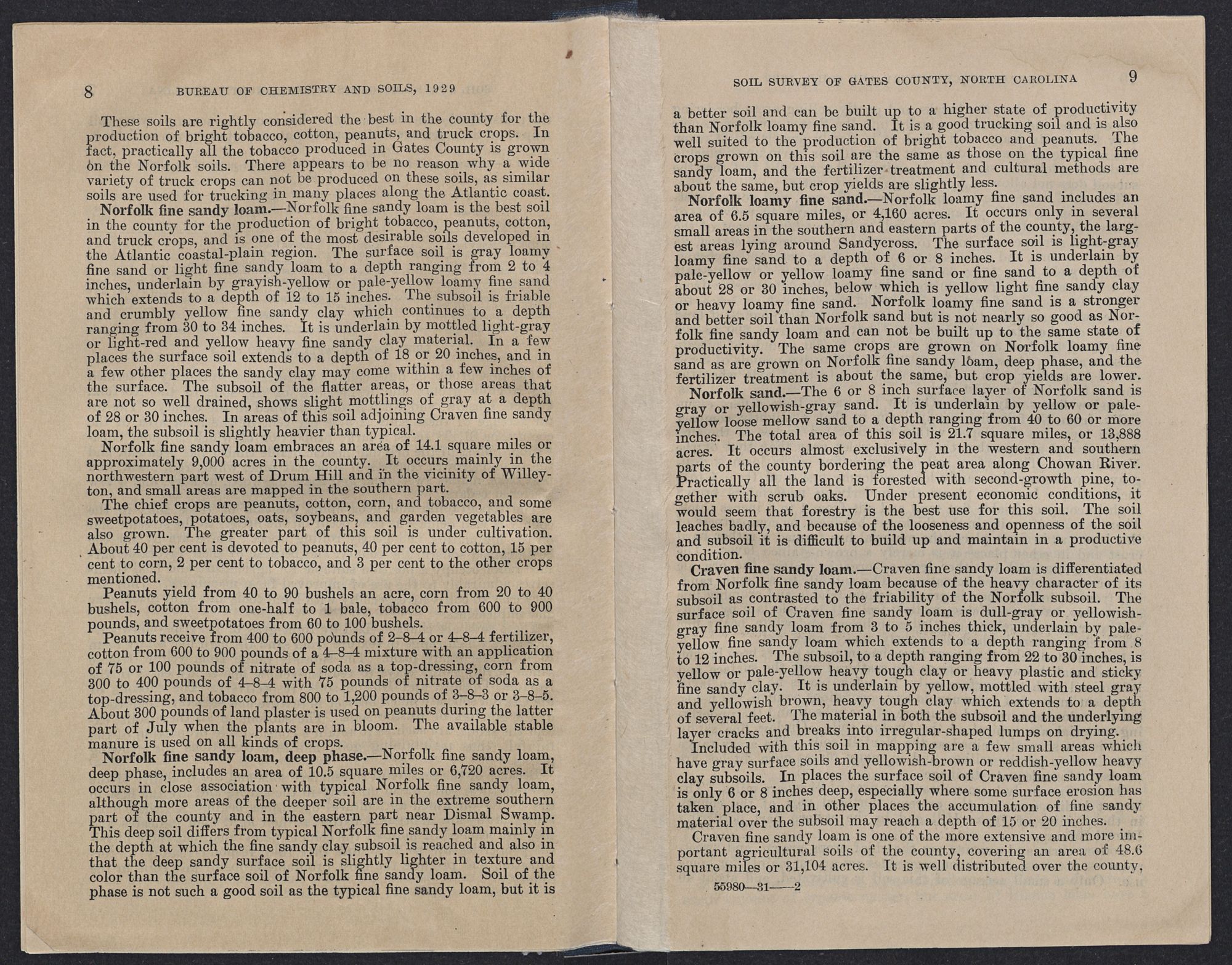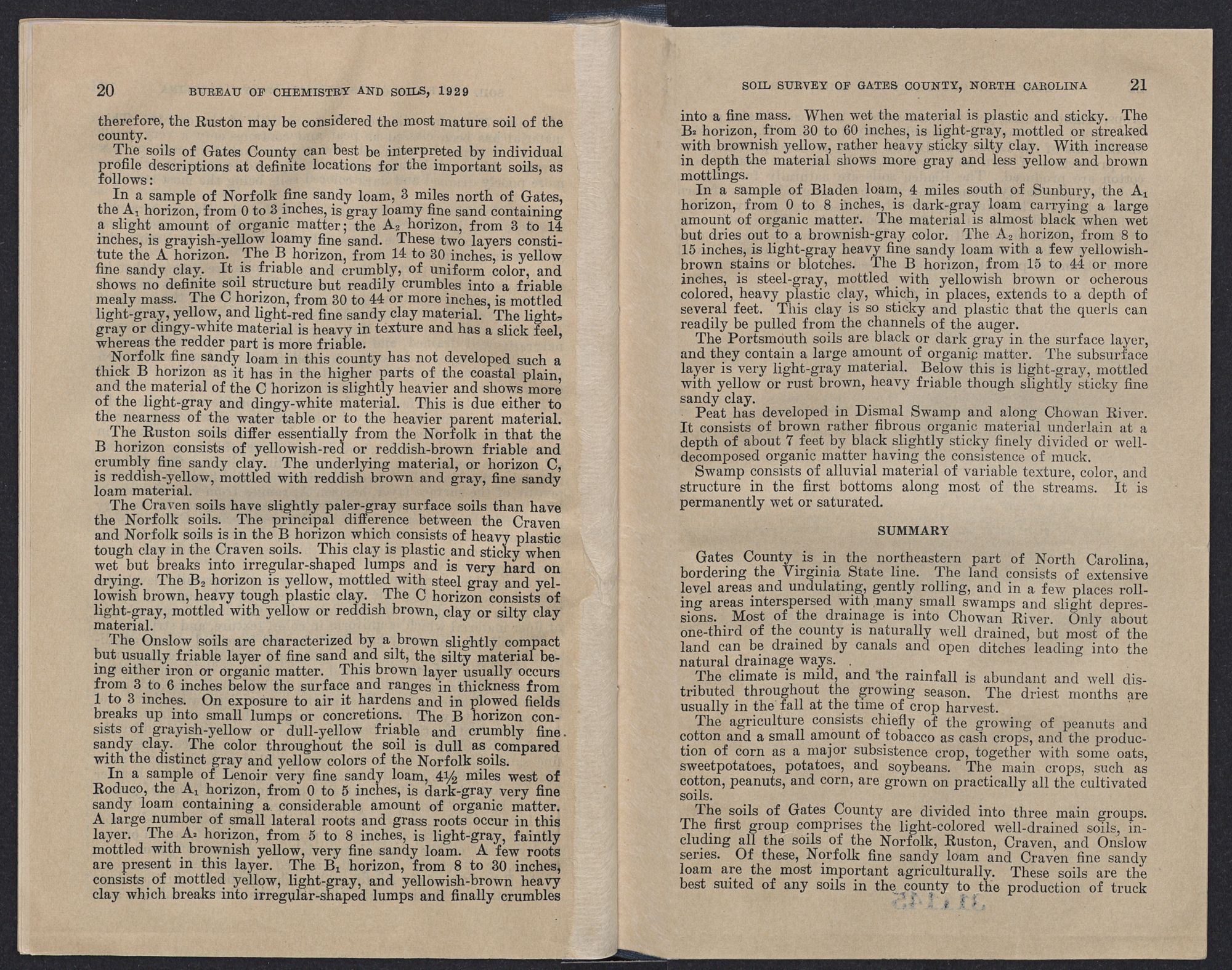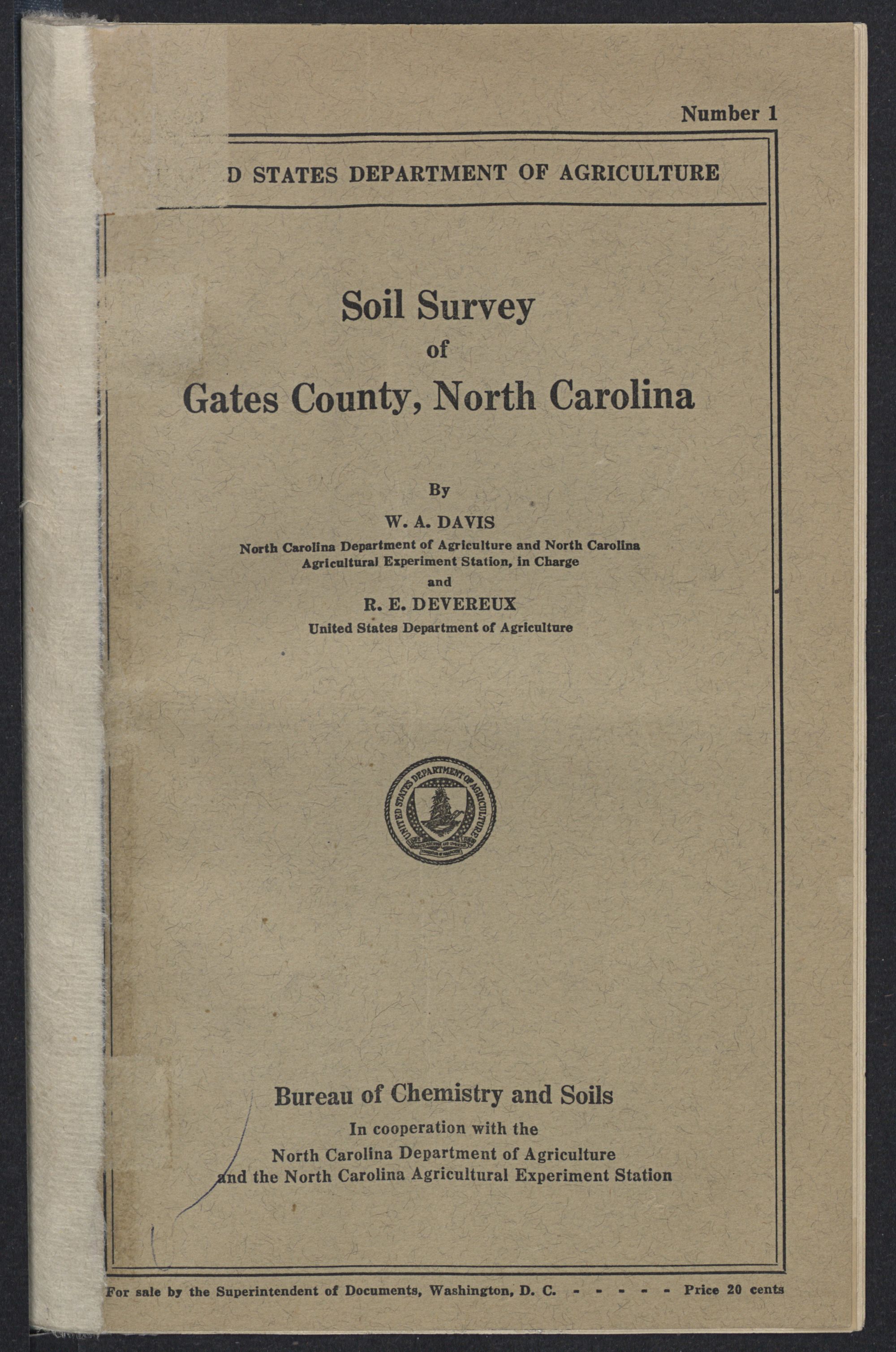 Soil survey of Gates county, North Carolina. By W. A. Davis and R. E. Devereux. Washington : [U. S. Govt. print. off., 1931] 22 p. 2 maps (1 fold.) 24 cm. (U. S. Dept. of agriculture. Bureau of chemistry and soils. [Soil survey report] Series 1929, no. 1) Cover-title. In cooperation with the North Carolina Department of agriculture and the North Carolina Agricultural experiment station.