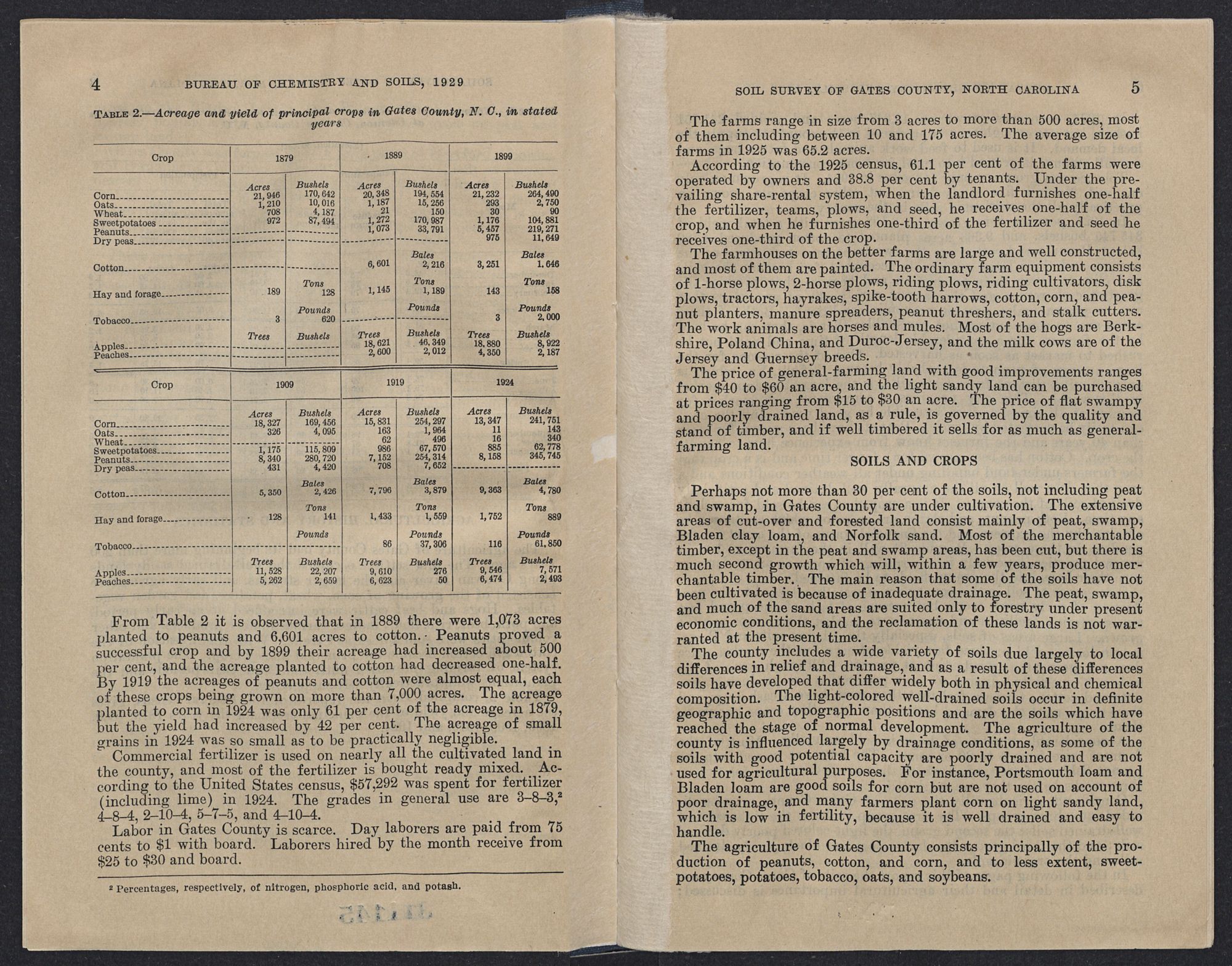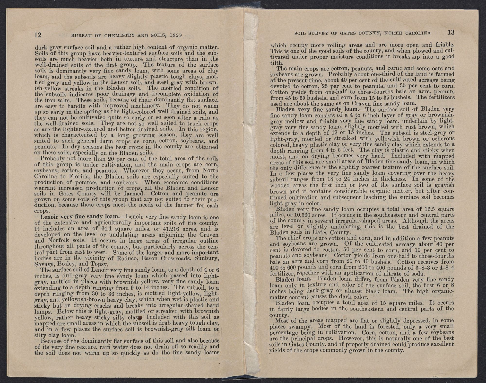 The following crops and varieties of each are recommended as adapted to Gates County soils: Cotton—Mexican Big Boll, Carolina-Foster,