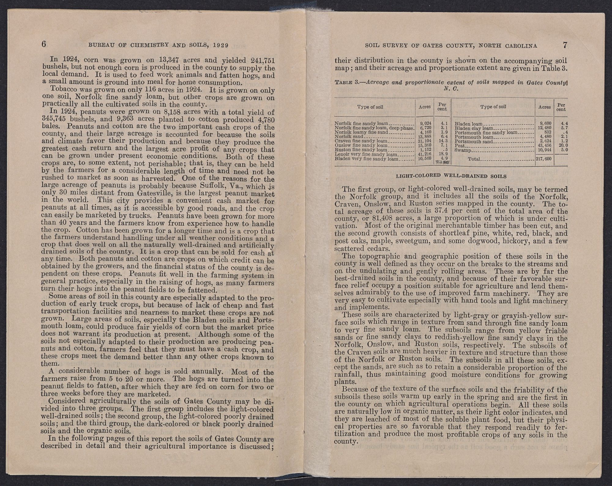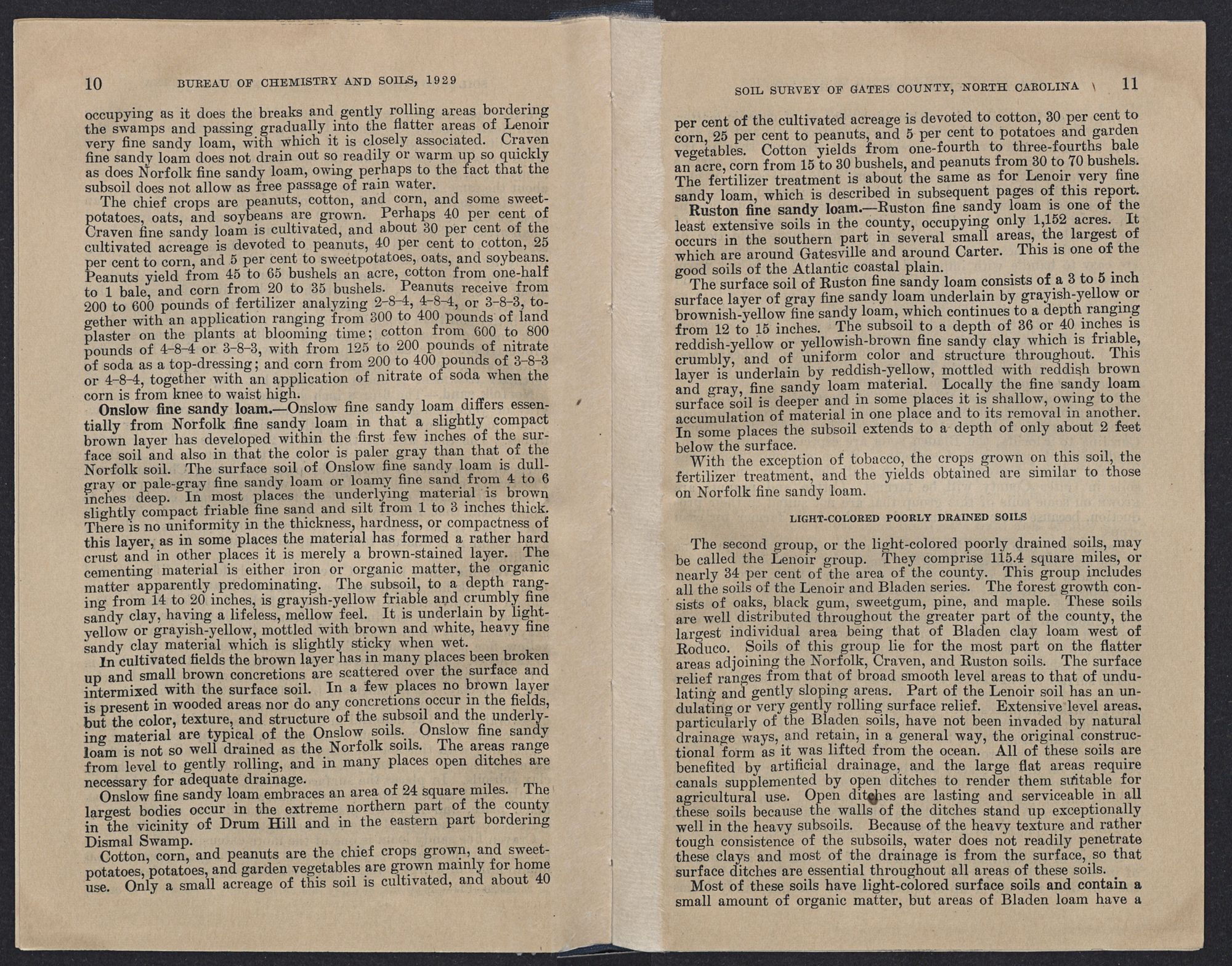 The soils of Gates County are divided into three main groups. The first group comprises the light-colored well-drained soils, including all the soils of the Norfolk, Ruston, Craven, and Onslow series. Of these, Norfolk fine sandy loam and Craven fine sandy loam are the most important agriculturally. These soils are the best suited of any soils in the county to the production of truck