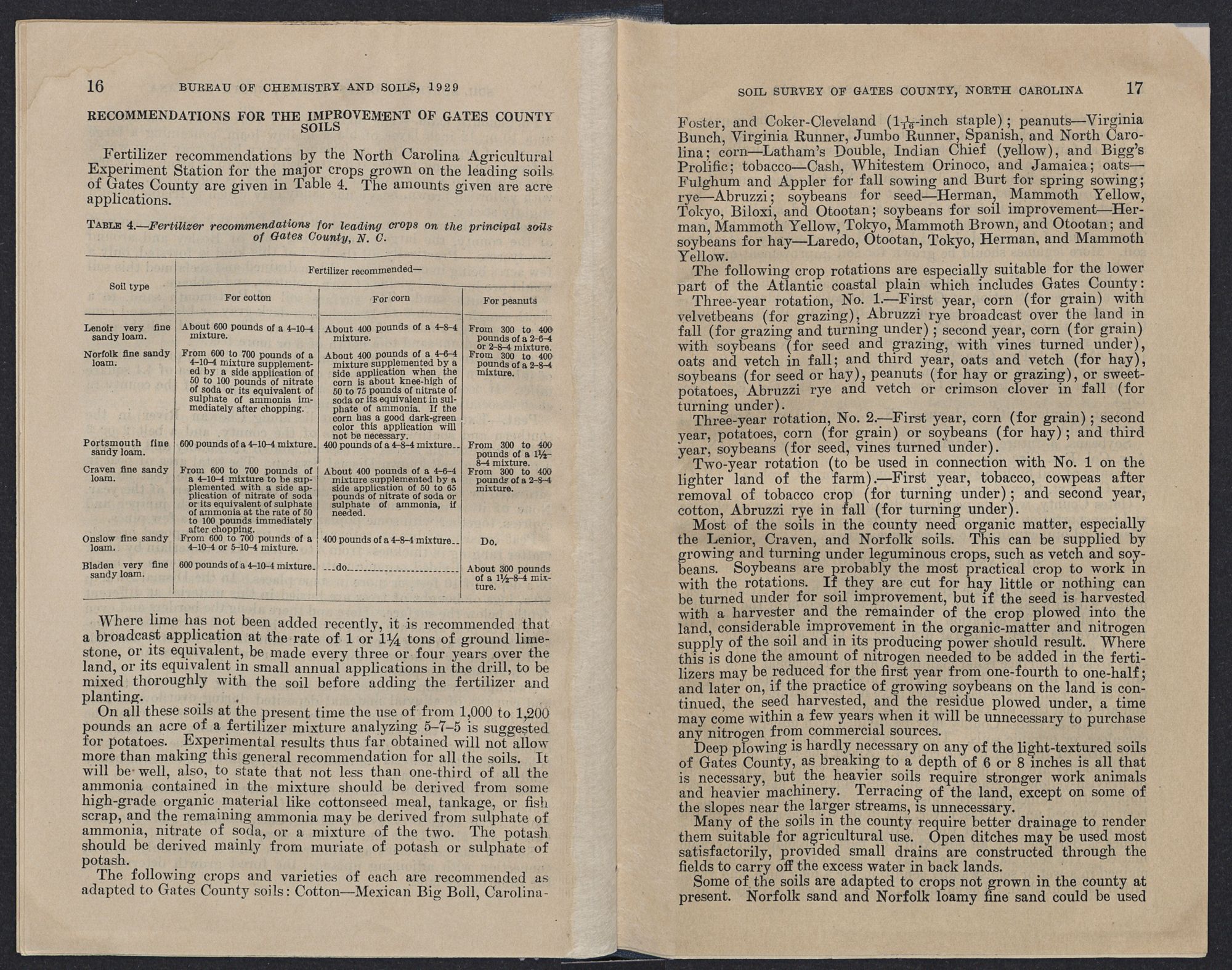 Fertilizer recommendations by the North Carolina Agricultural Experiment Station for the major crops grown on the leading soils of Gates County are given in Table 4. The amounts given are acre applications.