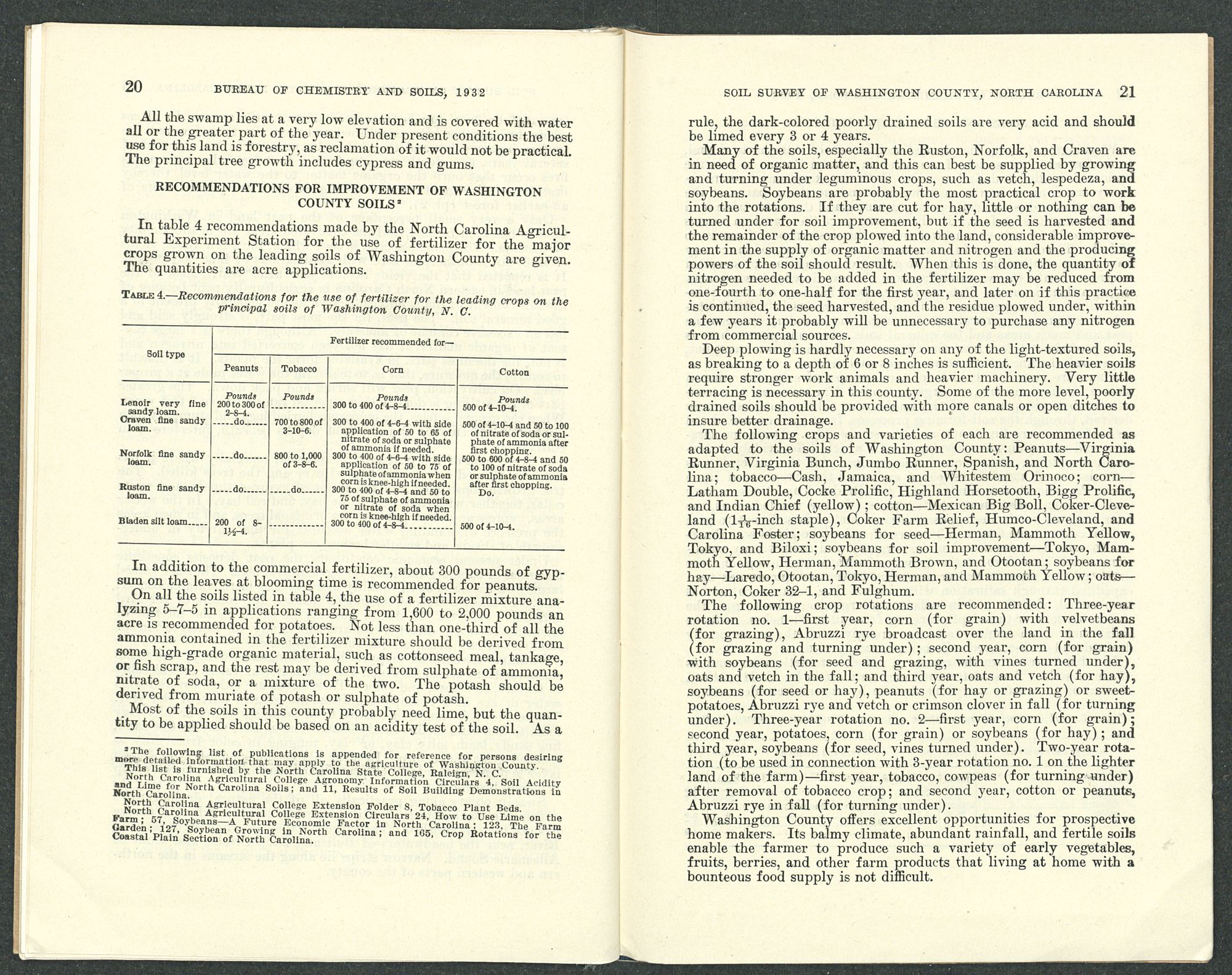 RECOMMENDATIONS FOR IMPROVEMENT OF WASHINGTON COUNTY SOILS2In table 4 recommendations made by the North Carolina Agricultural Experiment Station for the use of fertilizer for the major crops grown on the leading soils of Washington County are given. The quantities are acre applications.