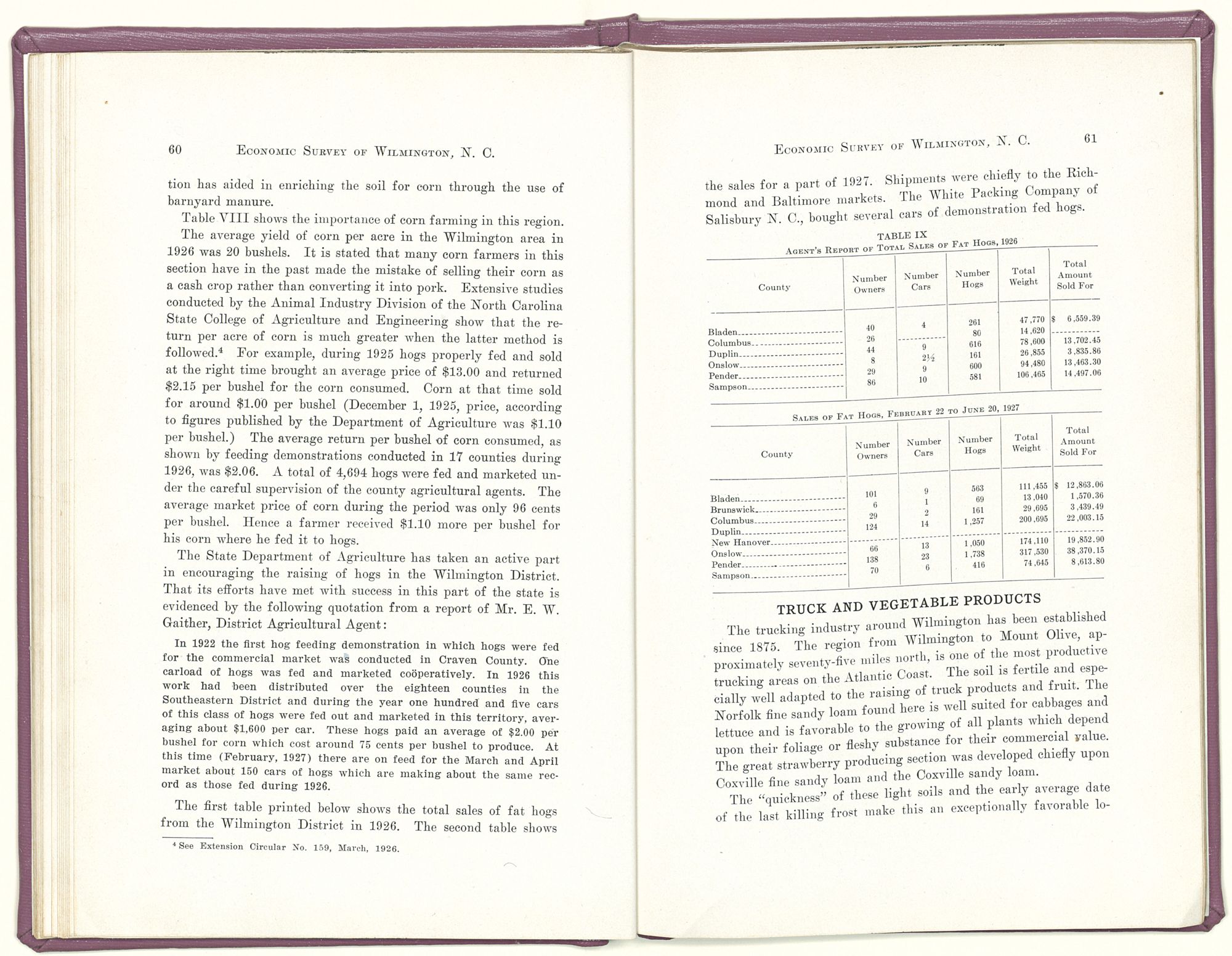 In view of the subsequent development of trucking, this discussion of 1906 may be now regarded as prophecy partly fulfilled, but in the opinion of these present investigators, the trucking possibilities of New Hanover and surrounding counties have much greater promise for the future than has yet been realized.