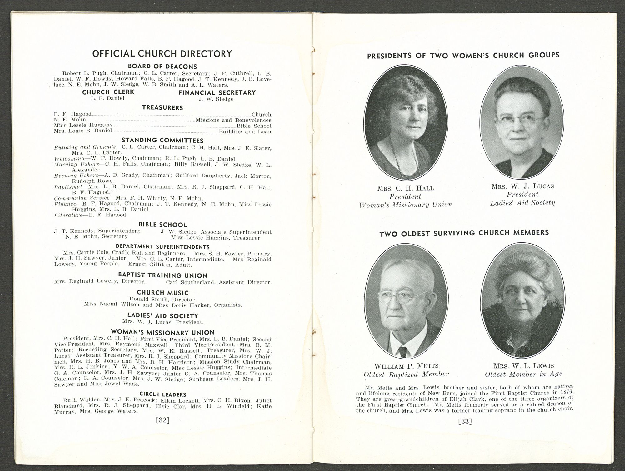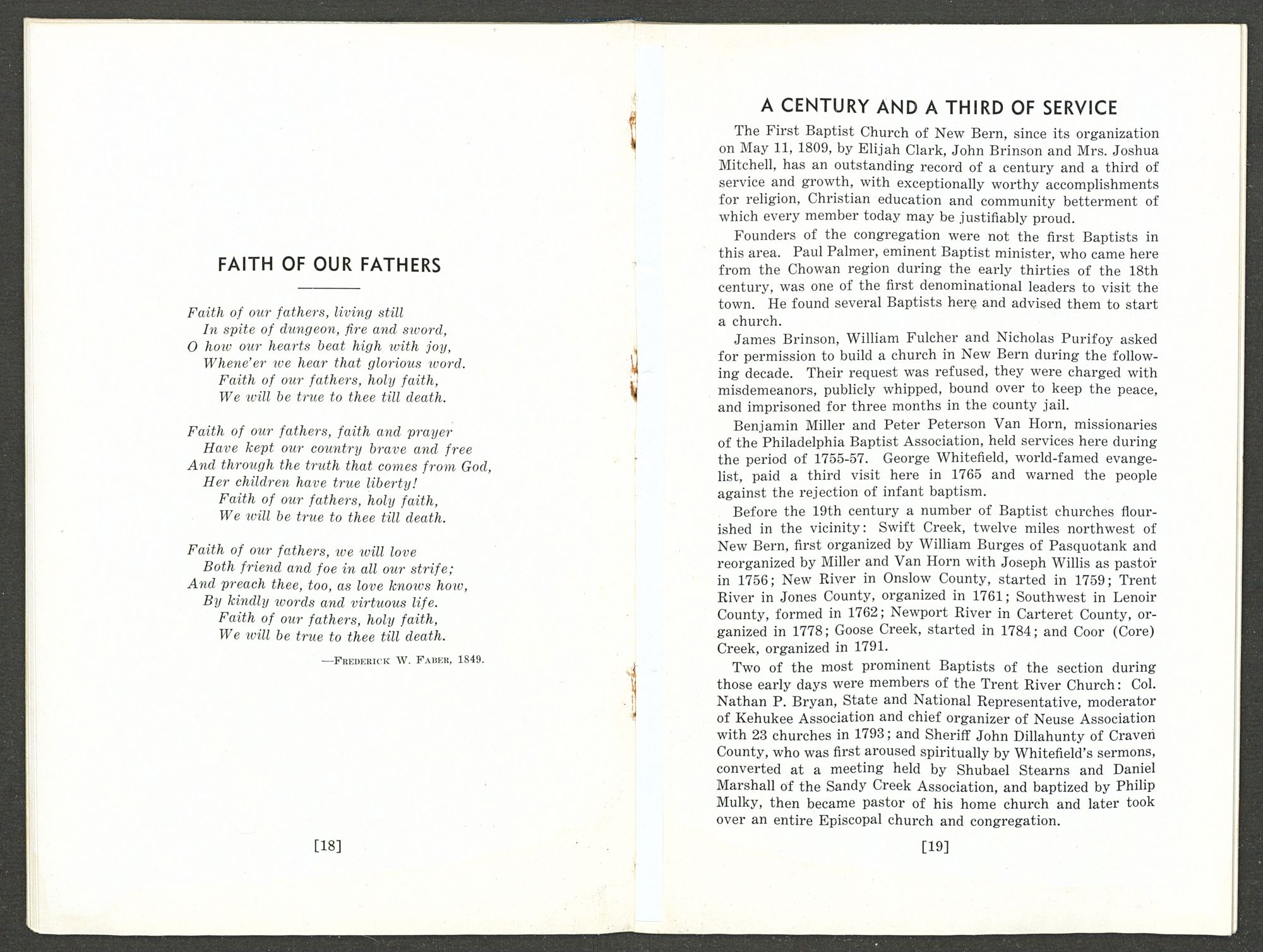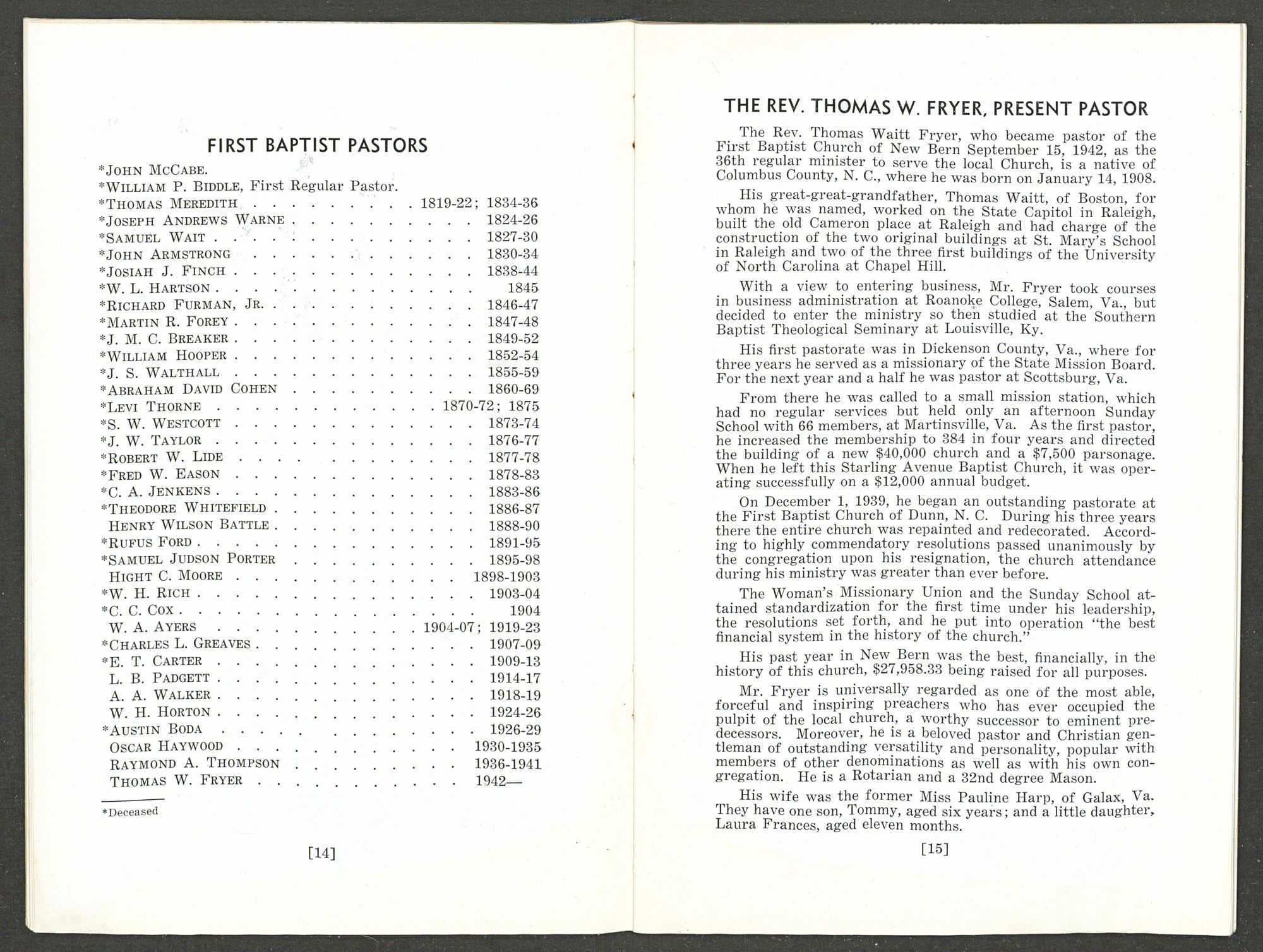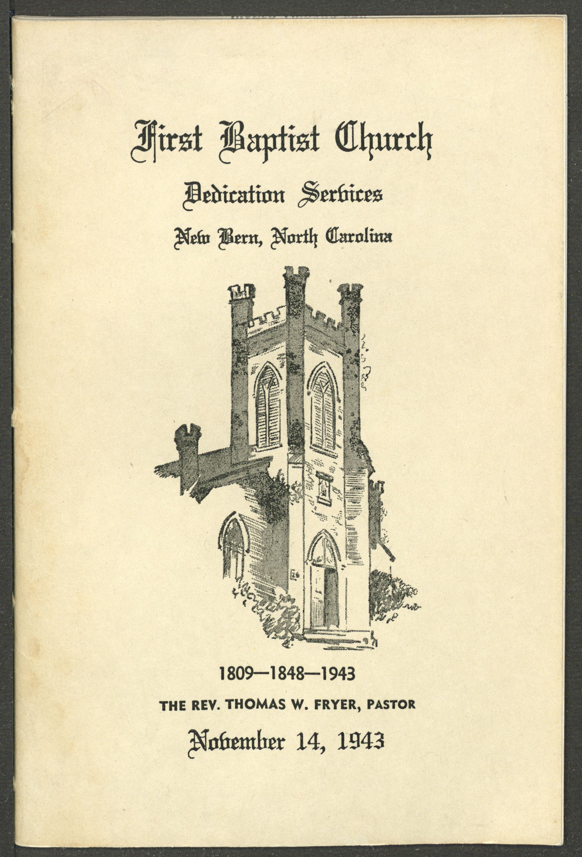 First Baptist Church dedication services : New Bern, North Carolina, 1809-1848-1943, the Rev. Thomas W. Fryer, Pastor, November 14, 1943. [New Bern, N.C. : First Baptist Church, 1943] 36 p. : ill. ; 23 cm. Cover title.