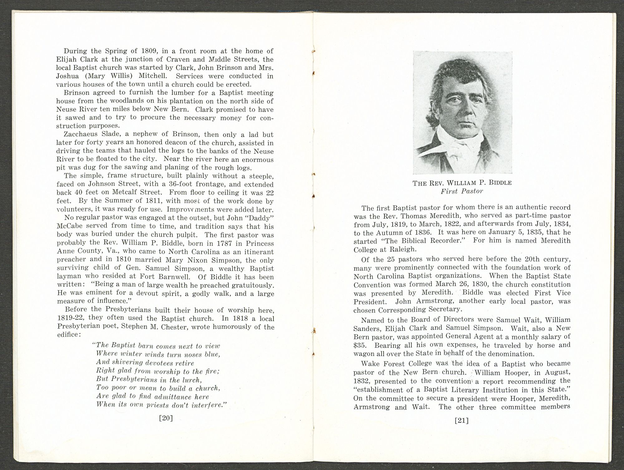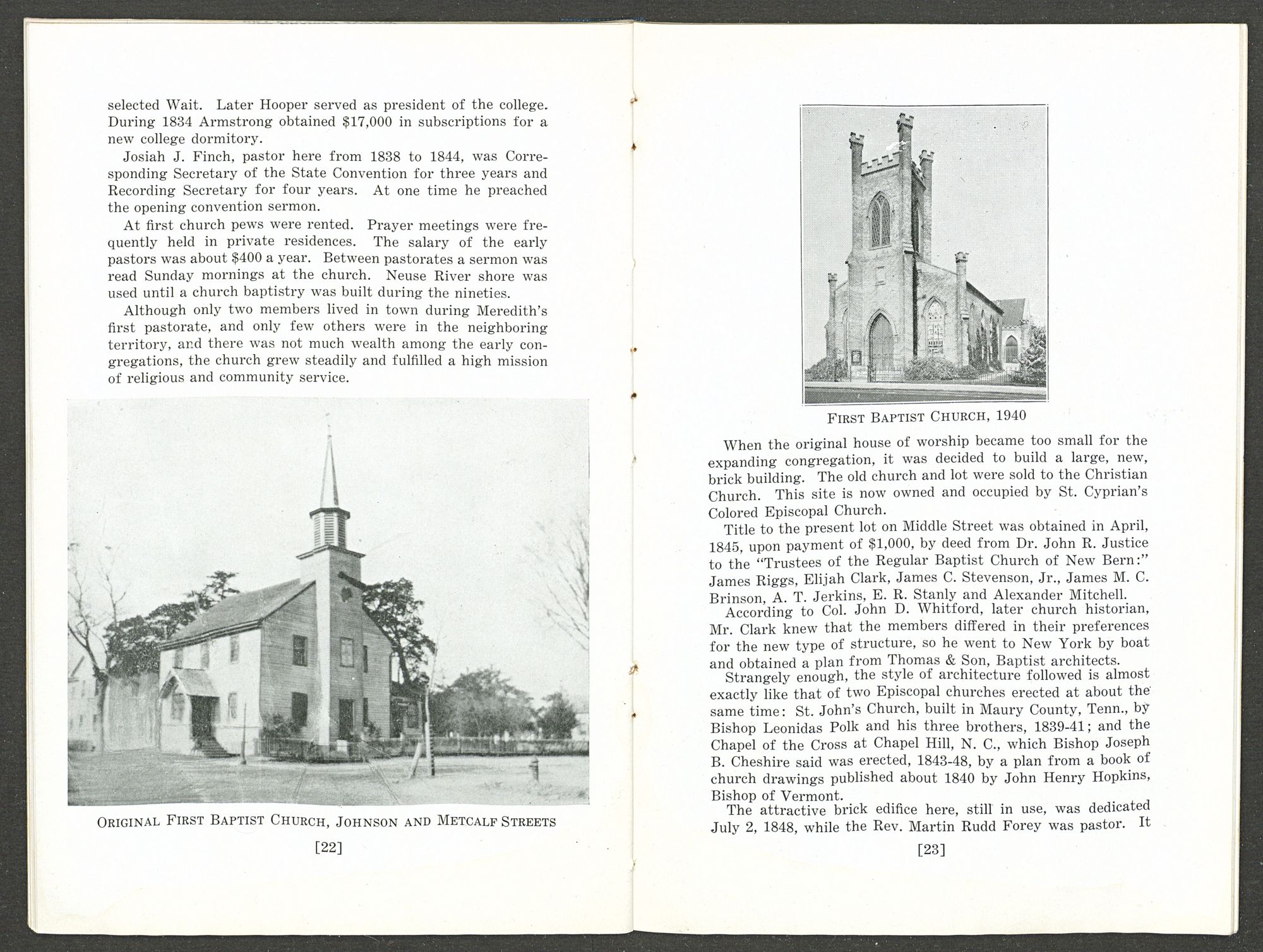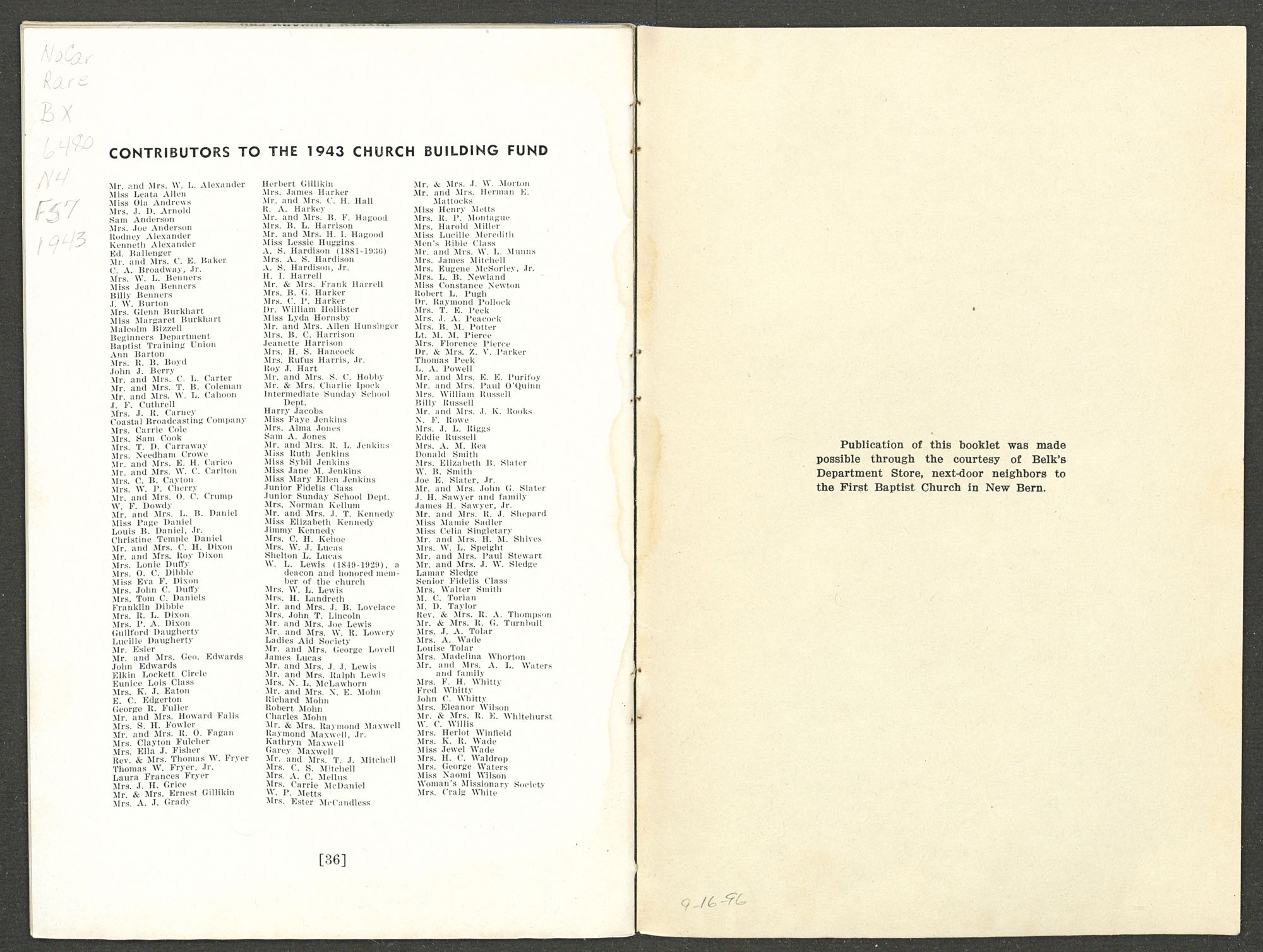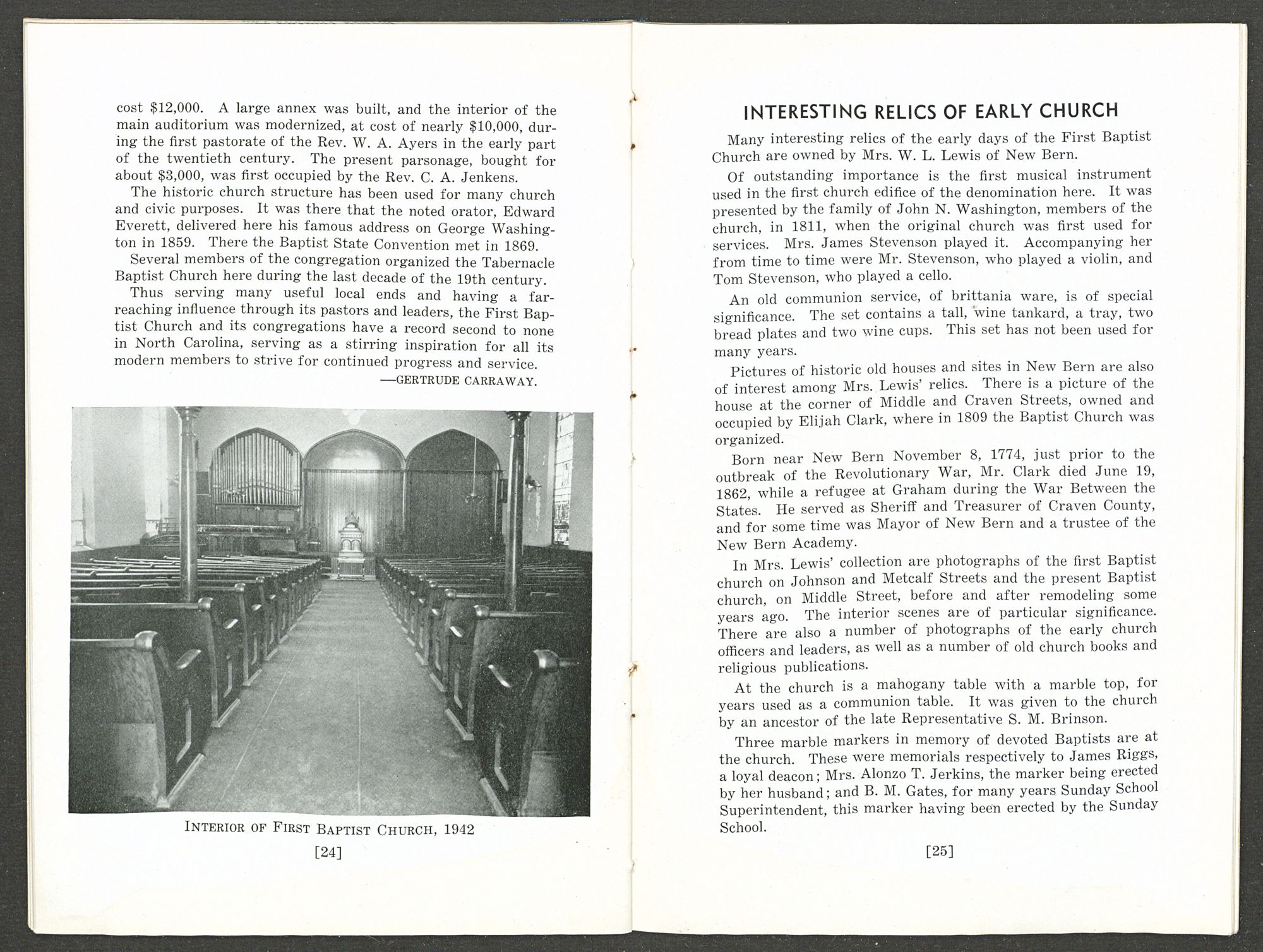 First Baptist Church dedication services : New Bern, North Carolina, 1809-1848-1943, the Rev. Thomas W. Fryer, Pastor, November 14, 1943. [New Bern, N.C. : First Baptist Church, 1943] 36 p. : ill. ; 23 cm. Cover title.