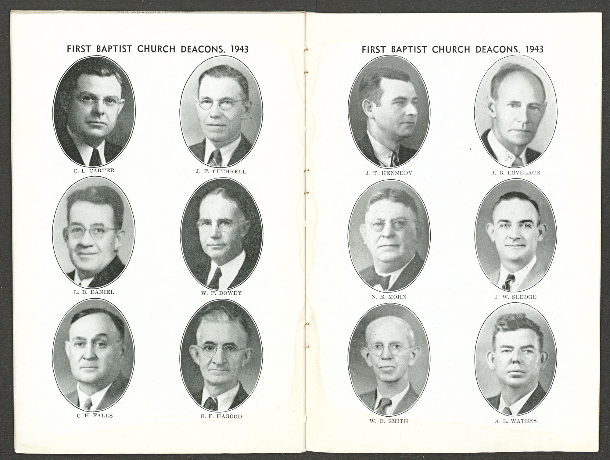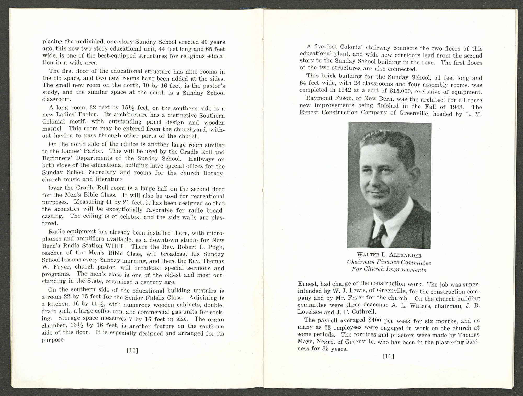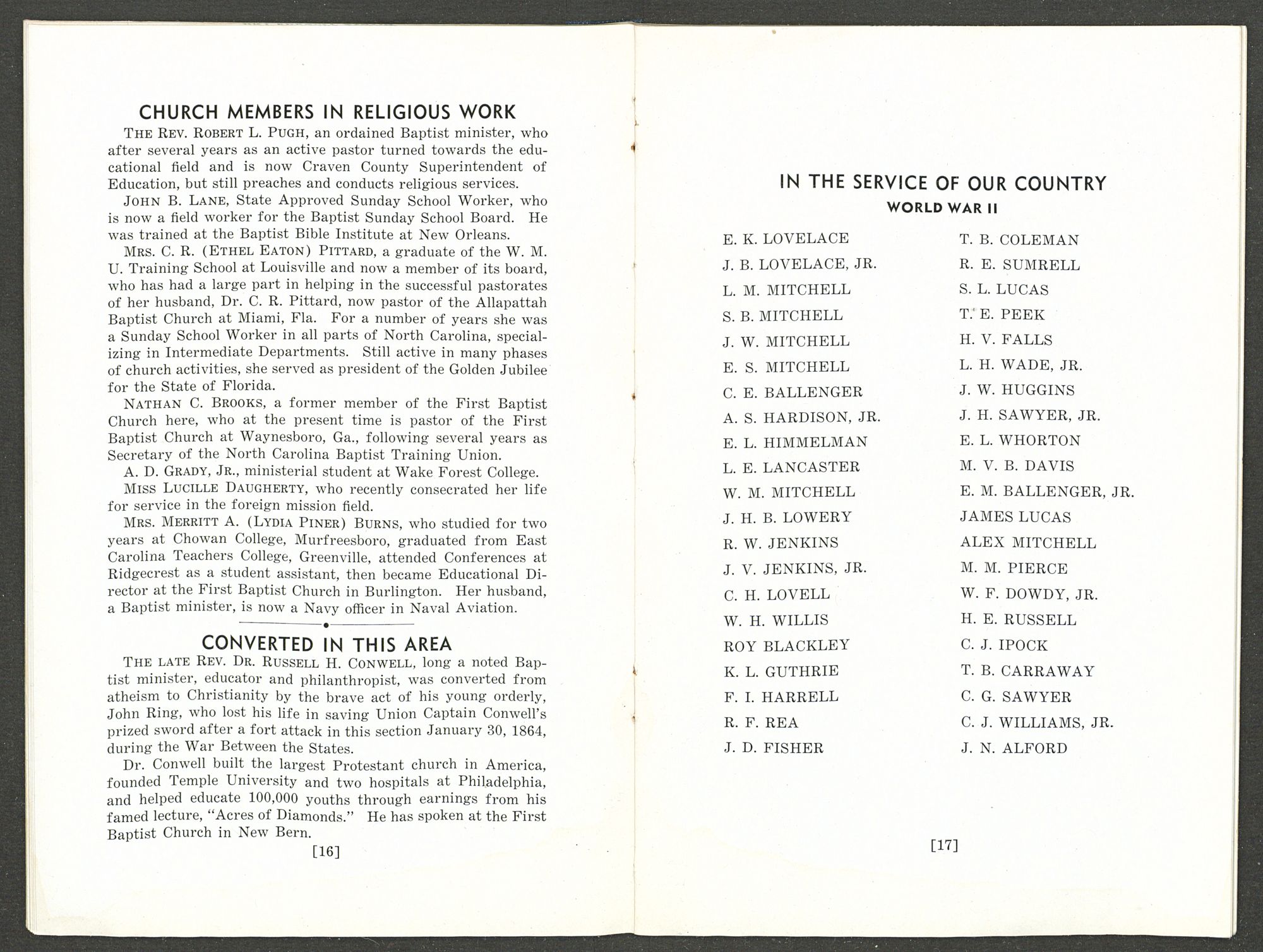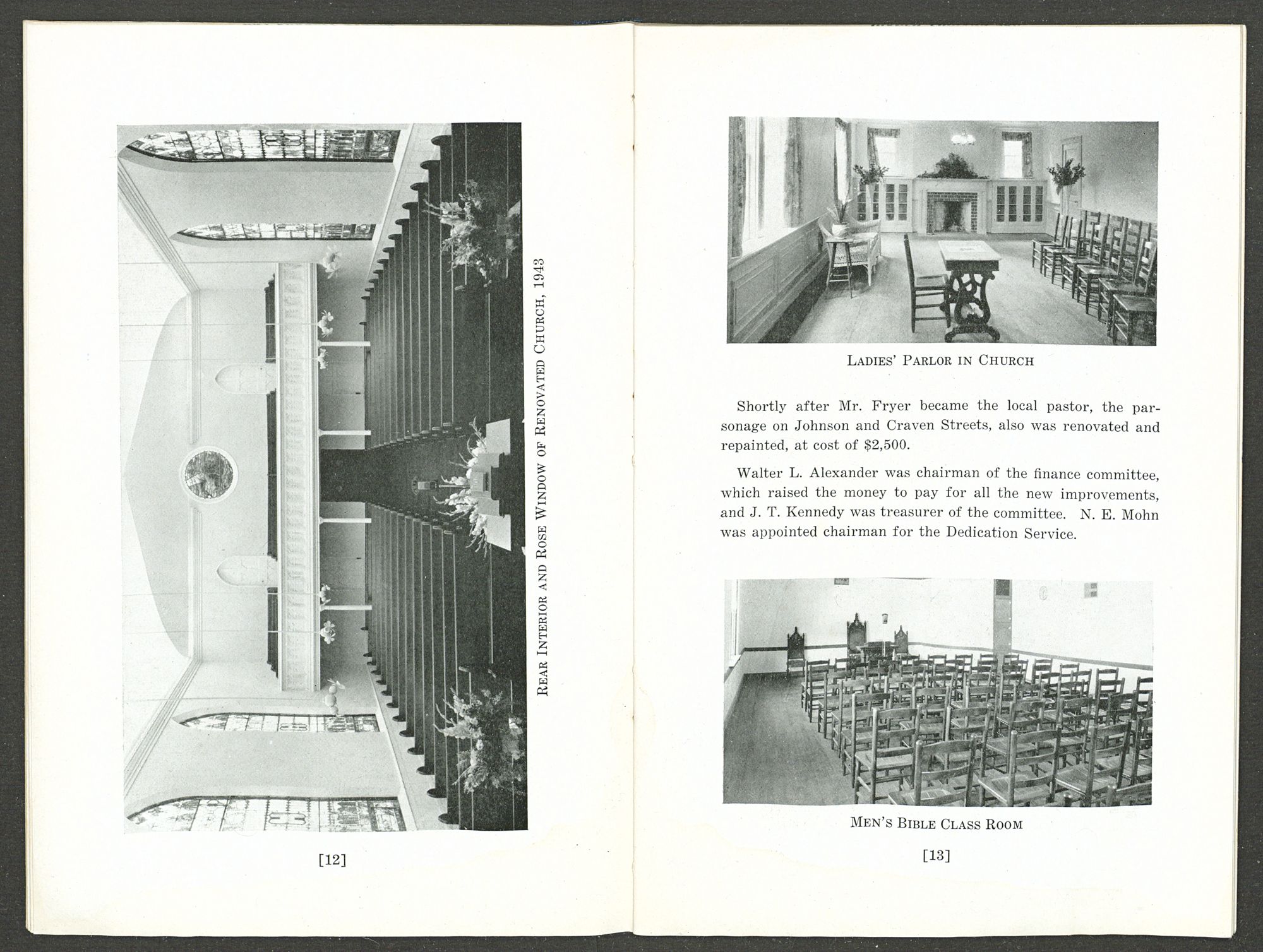 First Baptist Church dedication services : New Bern, North Carolina, 1809-1848-1943, the Rev. Thomas W. Fryer, Pastor, November 14, 1943. [New Bern, N.C. : First Baptist Church, 1943] 36 p. : ill. ; 23 cm. Cover title.
