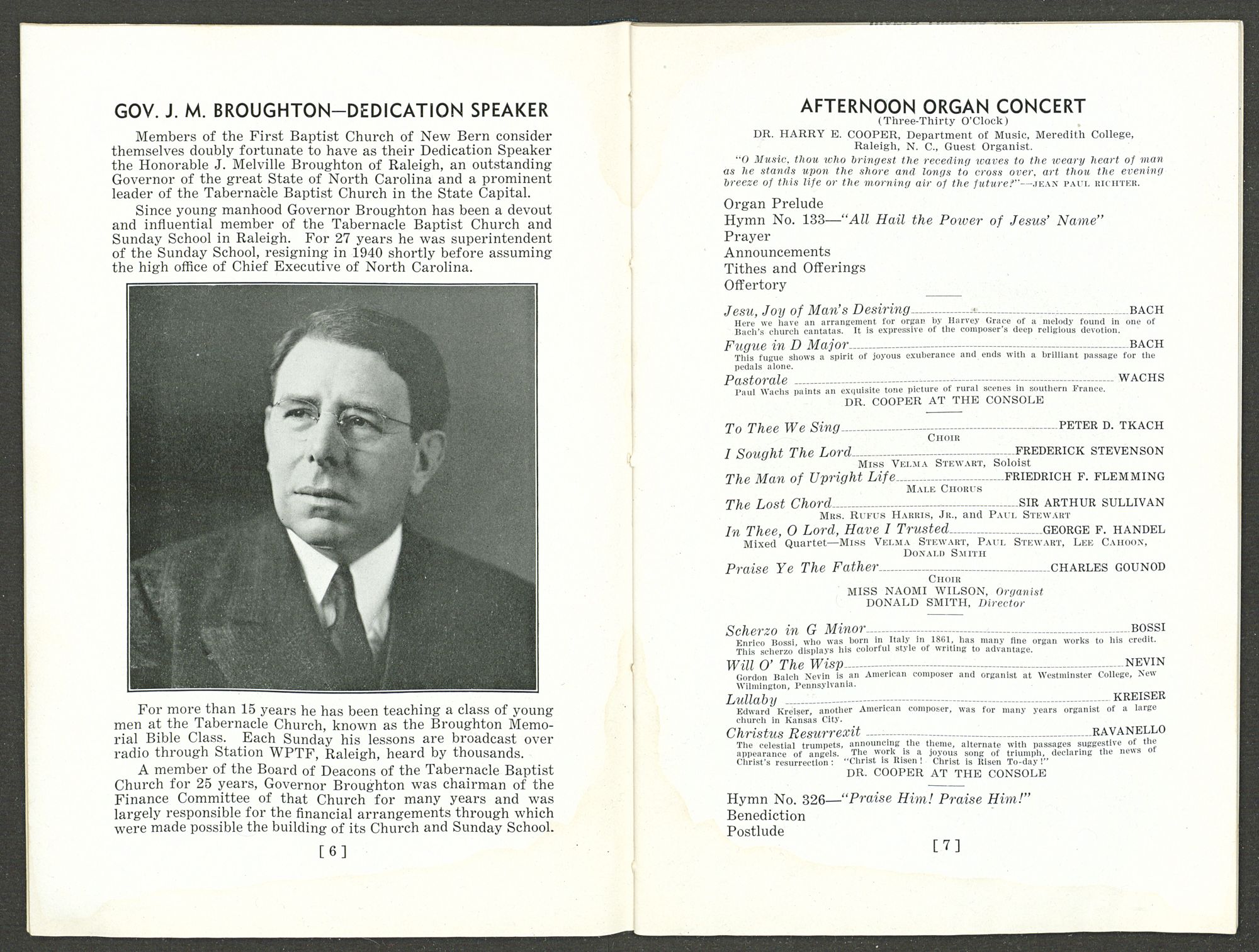 Members of the First Baptist Church of New Bern consider themselves doubly fortunate to have as their Dedication Speaker the Honorable J. Melville Broughton of Raleigh, an outstanding Governor of the great State of North Carolina and a prominent leader of the Tabernacle Baptist Church in the State Capital.