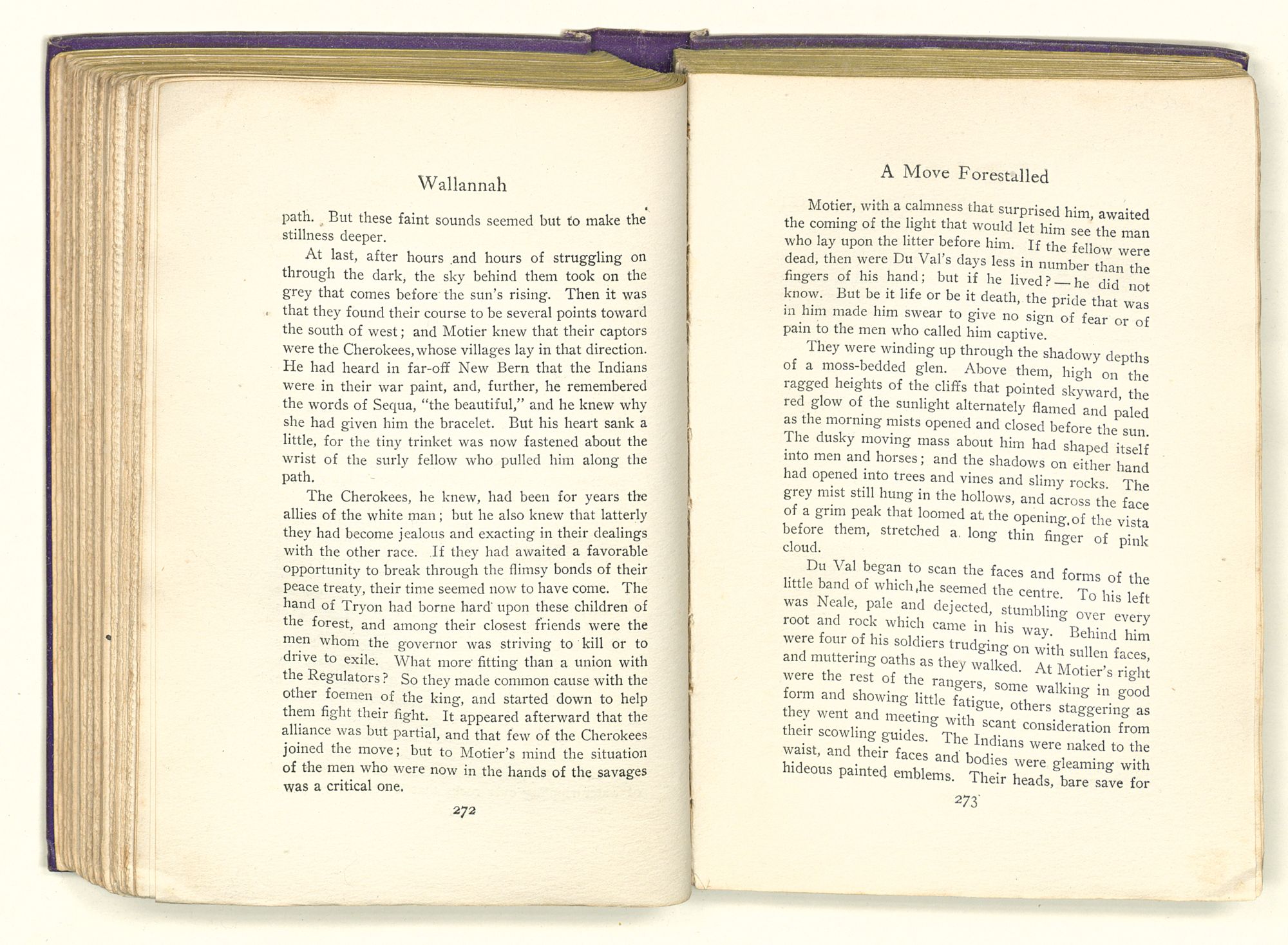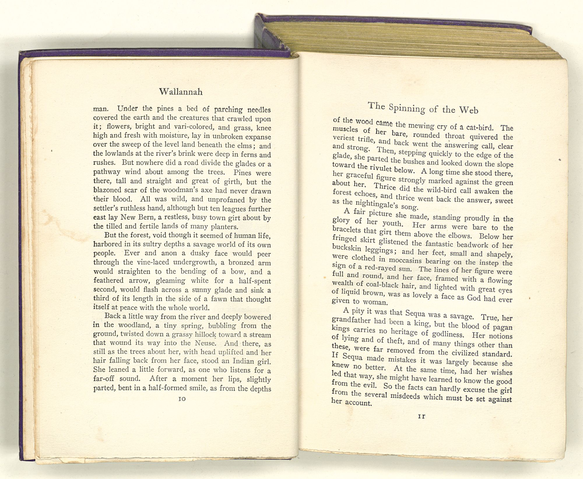 Back a little way from the river and deeply bowered in the woodland, a tiny spring, bubbling from the ground, twisted down a grassy hillock toward a stream that wound its way into the Neuse. And there, as still as the trees about her, with head uplifted and her hair falling back from her face, stood an Indian girl. She leaned a little forward, as one who listens for a far-off sound. After a moment her lips, slightly parted, bent in a half-formed smile, as from the depths