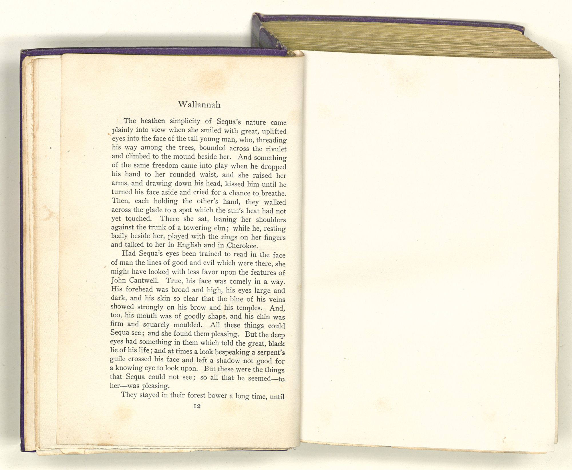 The heathen simplicity of Sequa's nature came plainly into view when she smiled with great, uplifted eyes into the face of the tall young man, who, threading his way among the trees, bounded across the rivulet and climbed to the mound beside her. And something of the same freedom came into play when he dropped his hand to her rounded waist, and she raised her arms, and drawing down his head, kissed him until he turned his face aside and cried for a chance to breathe. Then, each holding the other's hand, they walked across the glade to a spot which the sun's heat had not yet touched. There she sat, leaning her shoulders against the trunk of a towering elm; while he, resting lazily beside her, played with the rings on her fingers and talked to her in English and in Cherokee.