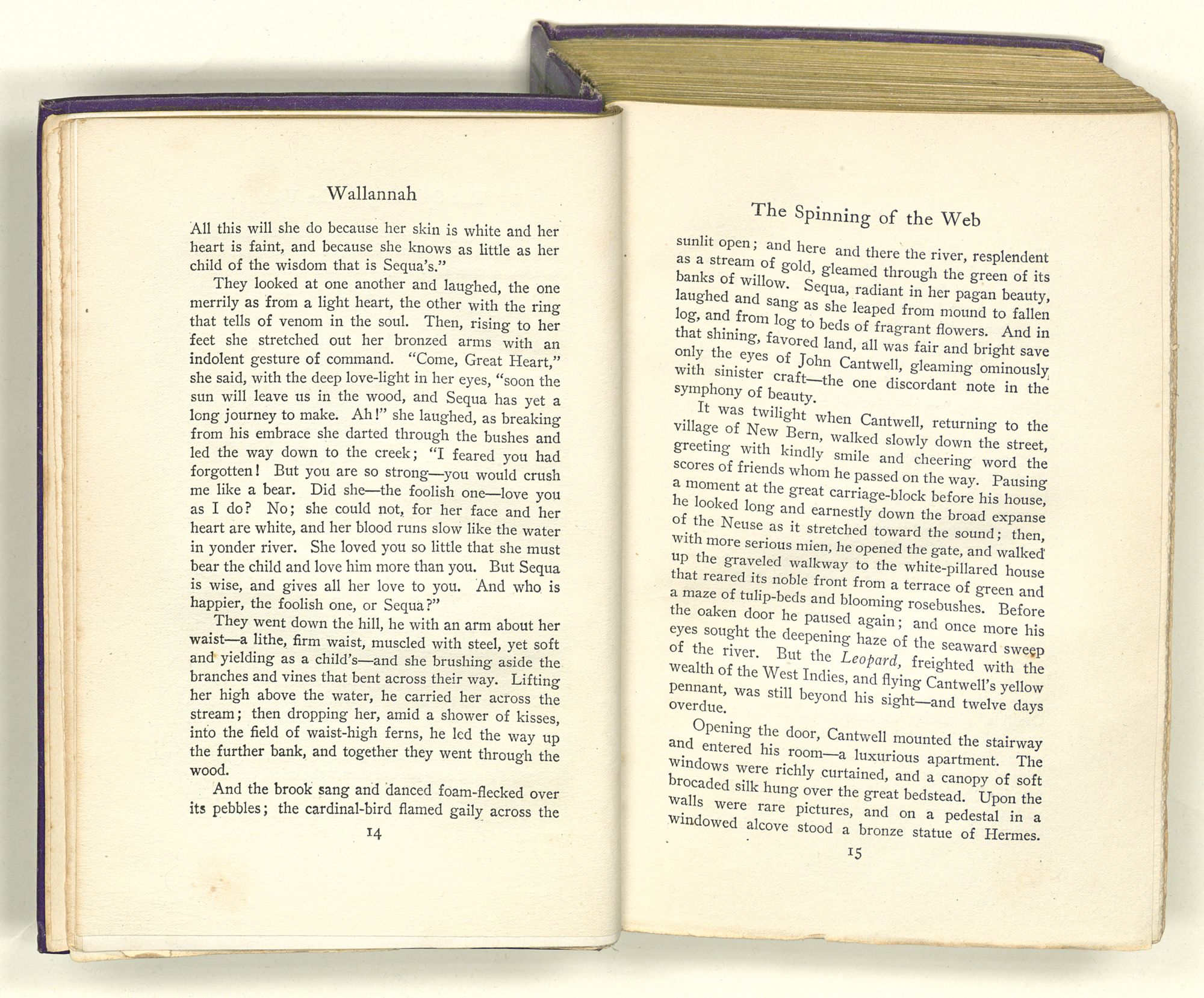 sunlit open; and here and there the river, resplendent as a stream of gold, gleamed through the green of its banks of willow. Sequa, radiant in her pagan beauty, laughed and sang as she leaped from mound to fallen log, and from log to beds of fragrant flowers. And in that shining, favored land, all was fair and bright save only the eyes of John Cantwell, gleaming ominously with sinister craft—the one discordant note in the symphony of beauty.