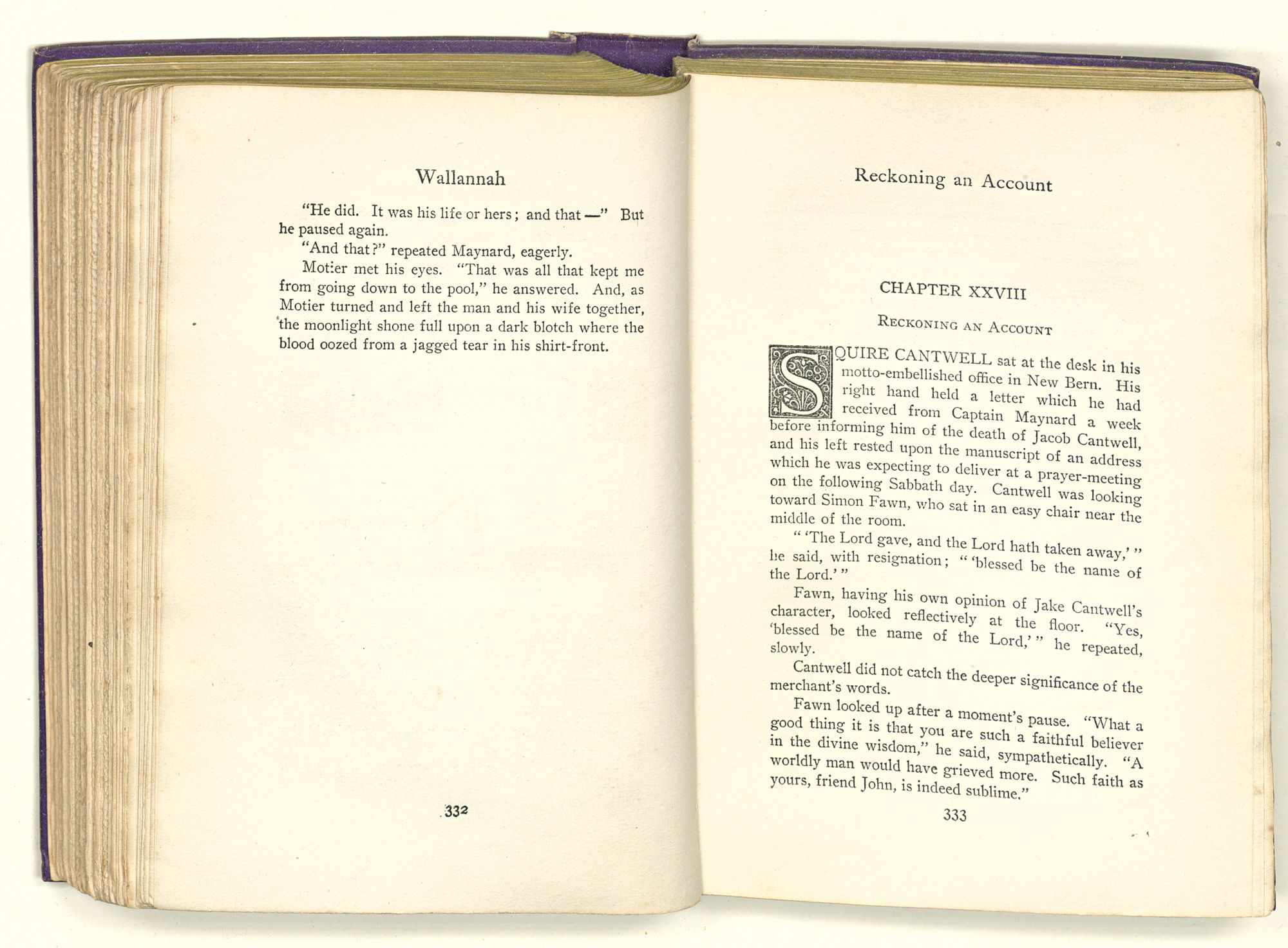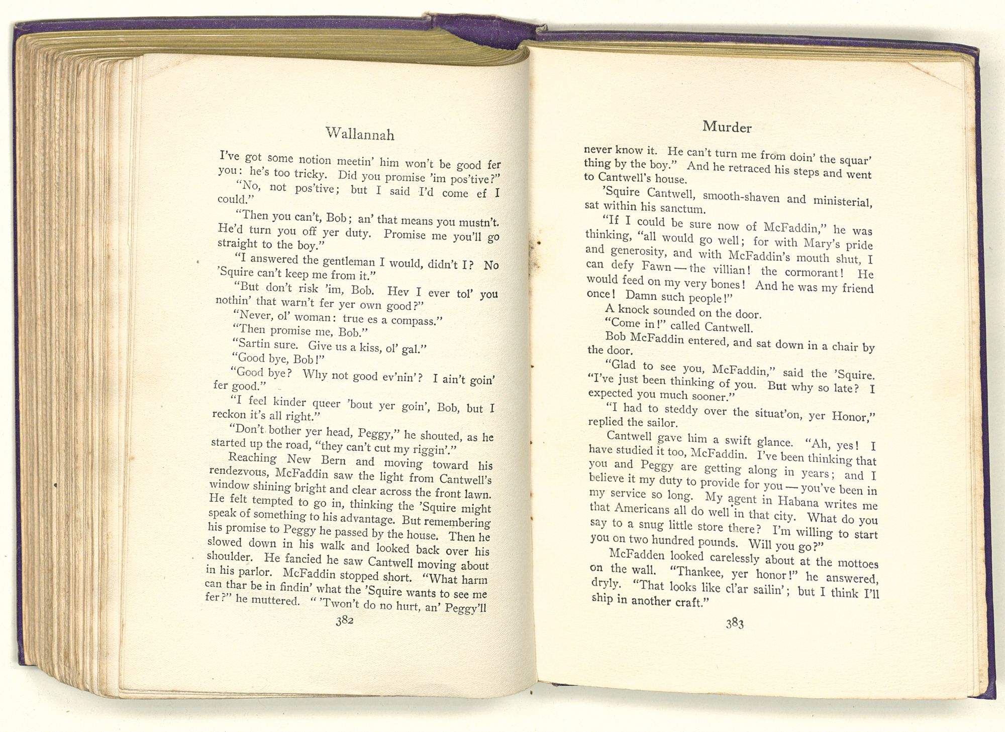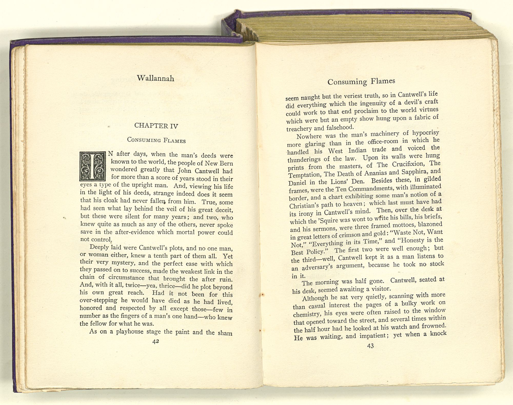 Surrounded by these marks of wealth and of power, Cantwell dropped into his great rocking-chair, while his negro valet, having lighted the candles in the sconces, brought out a velvet suit of garnet, lined with pea-green satin and touched here and there with silver embroidery. After this, Cantwell, whose dark eyes had followed his servant hither and thither about the room, called for wine and asked that he be left alone. Then, although it was close to the hour of supper, he lay back in his chair and gave himself over to deep thought.