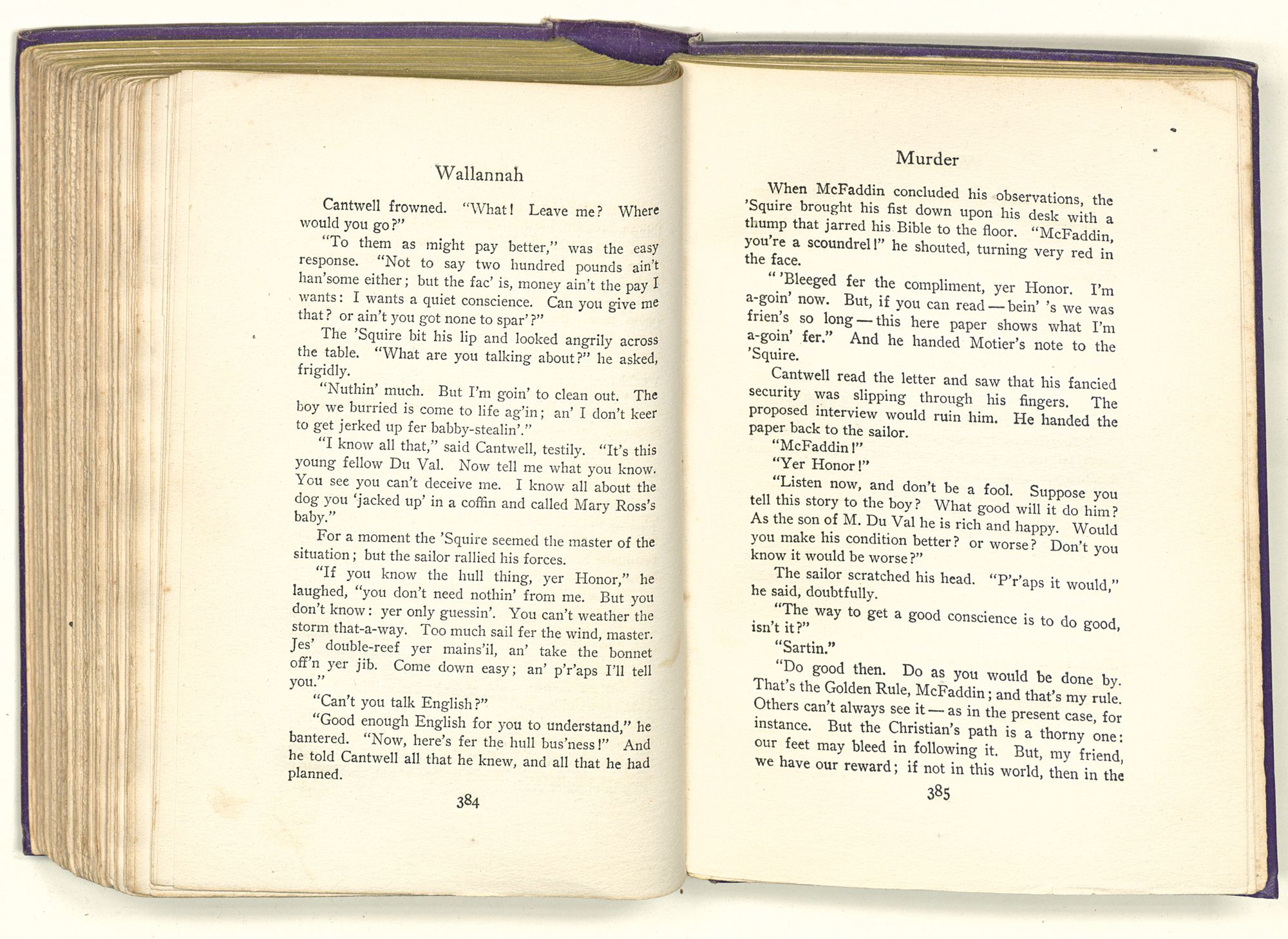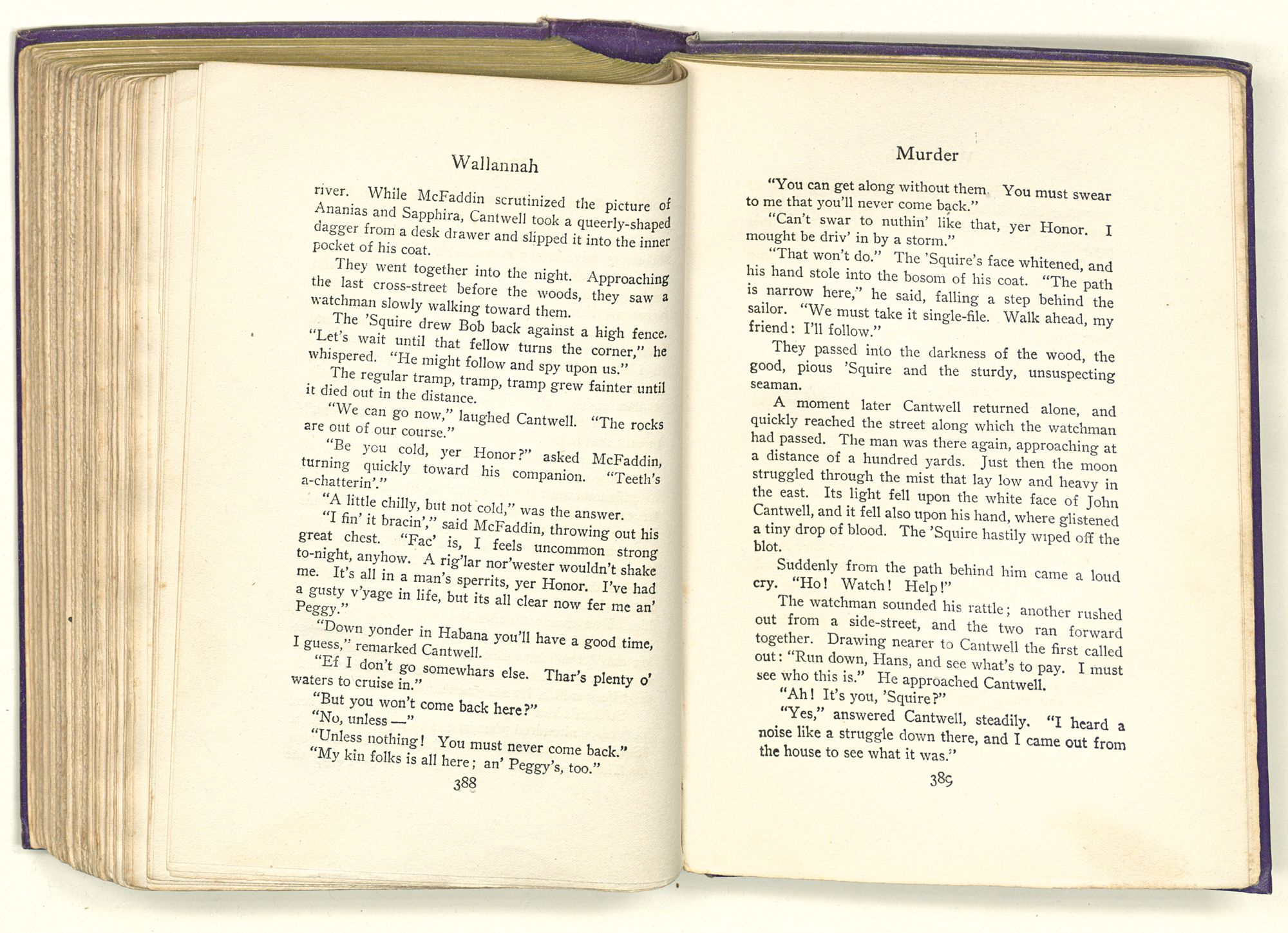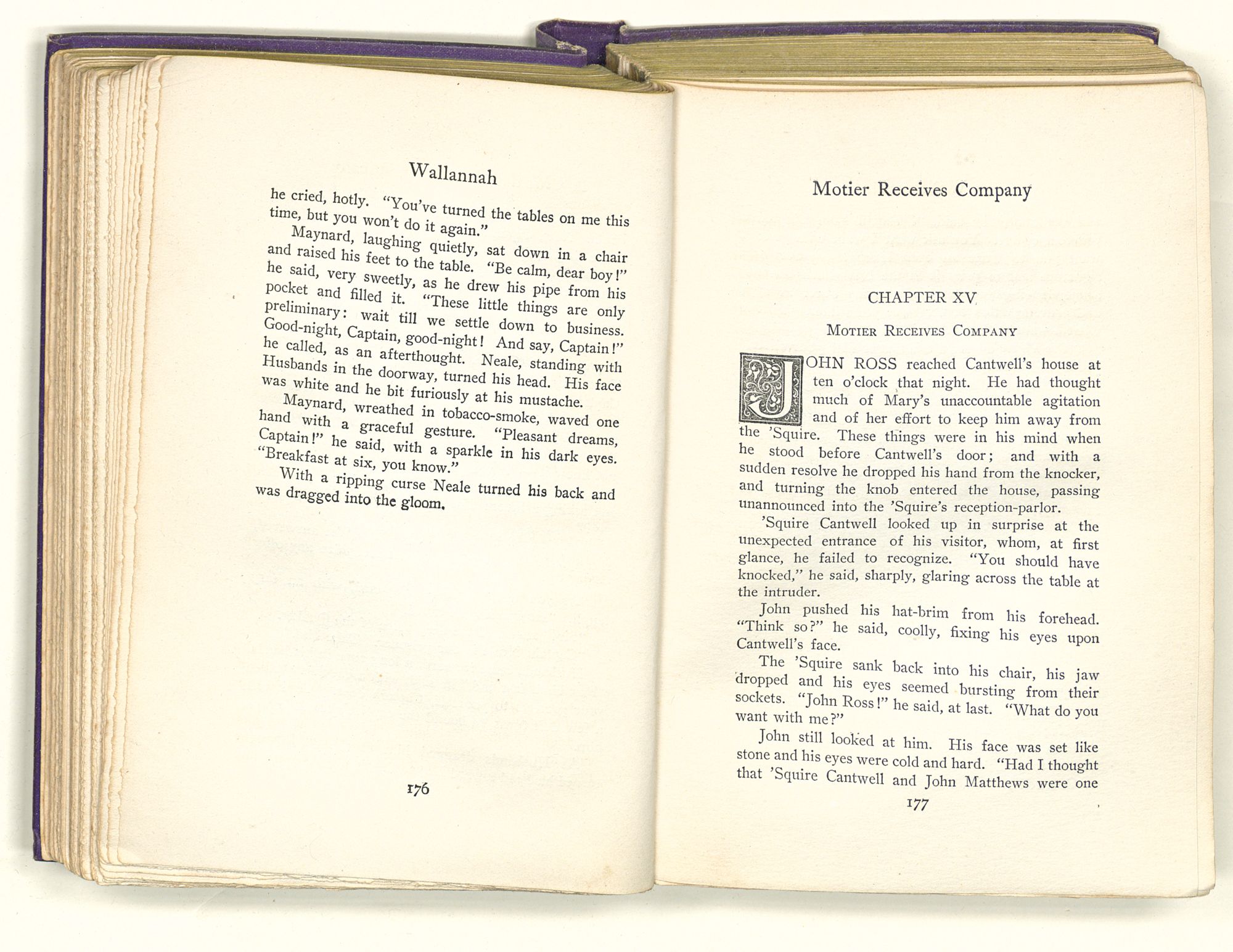 Surrounded by these marks of wealth and of power, Cantwell dropped into his great rocking-chair, while his negro valet, having lighted the candles in the sconces, brought out a velvet suit of garnet, lined with pea-green satin and touched here and there with silver embroidery. After this, Cantwell, whose dark eyes had followed his servant hither and thither about the room, called for wine and asked that he be left alone. Then, although it was close to the hour of supper, he lay back in his chair and gave himself over to deep thought.