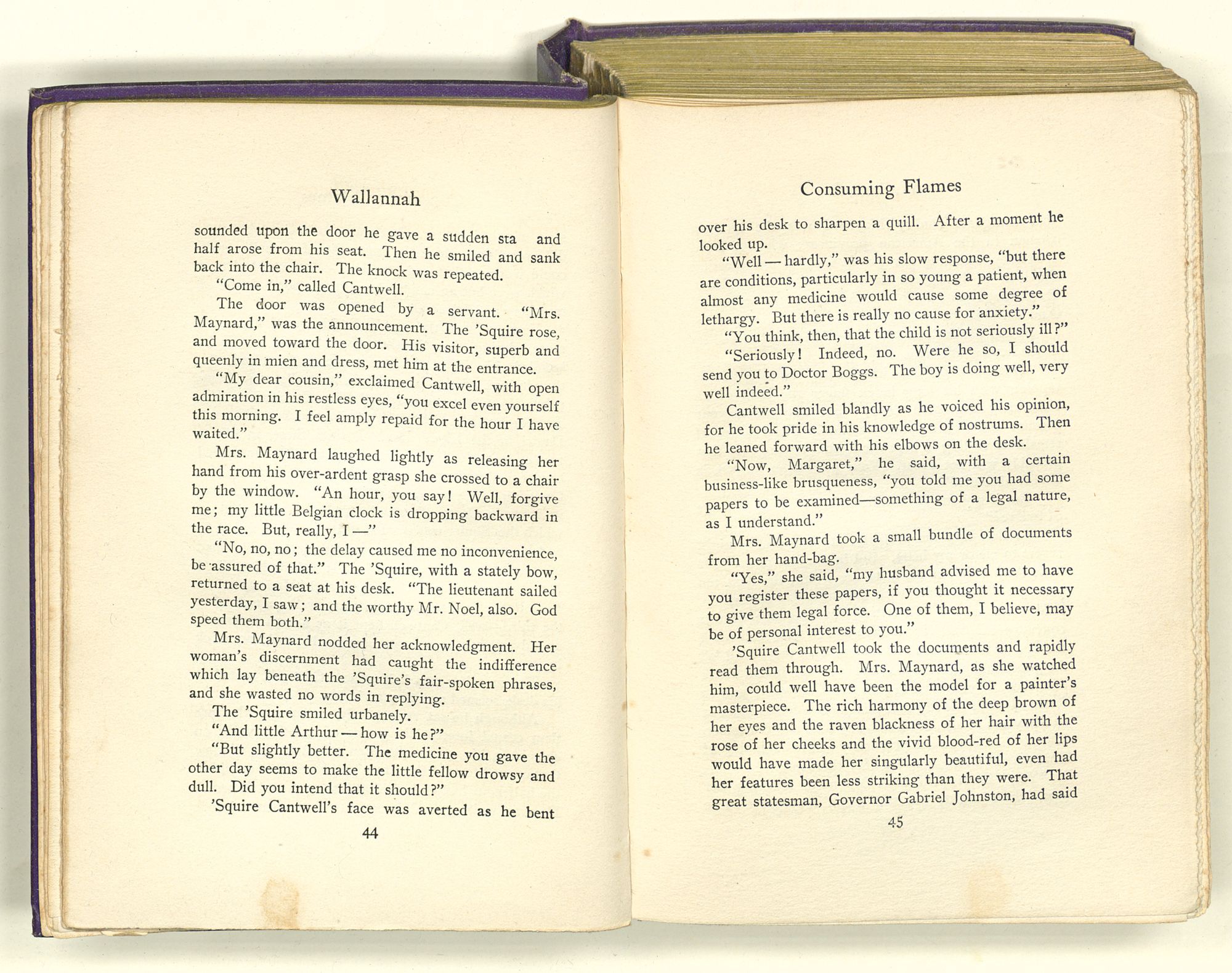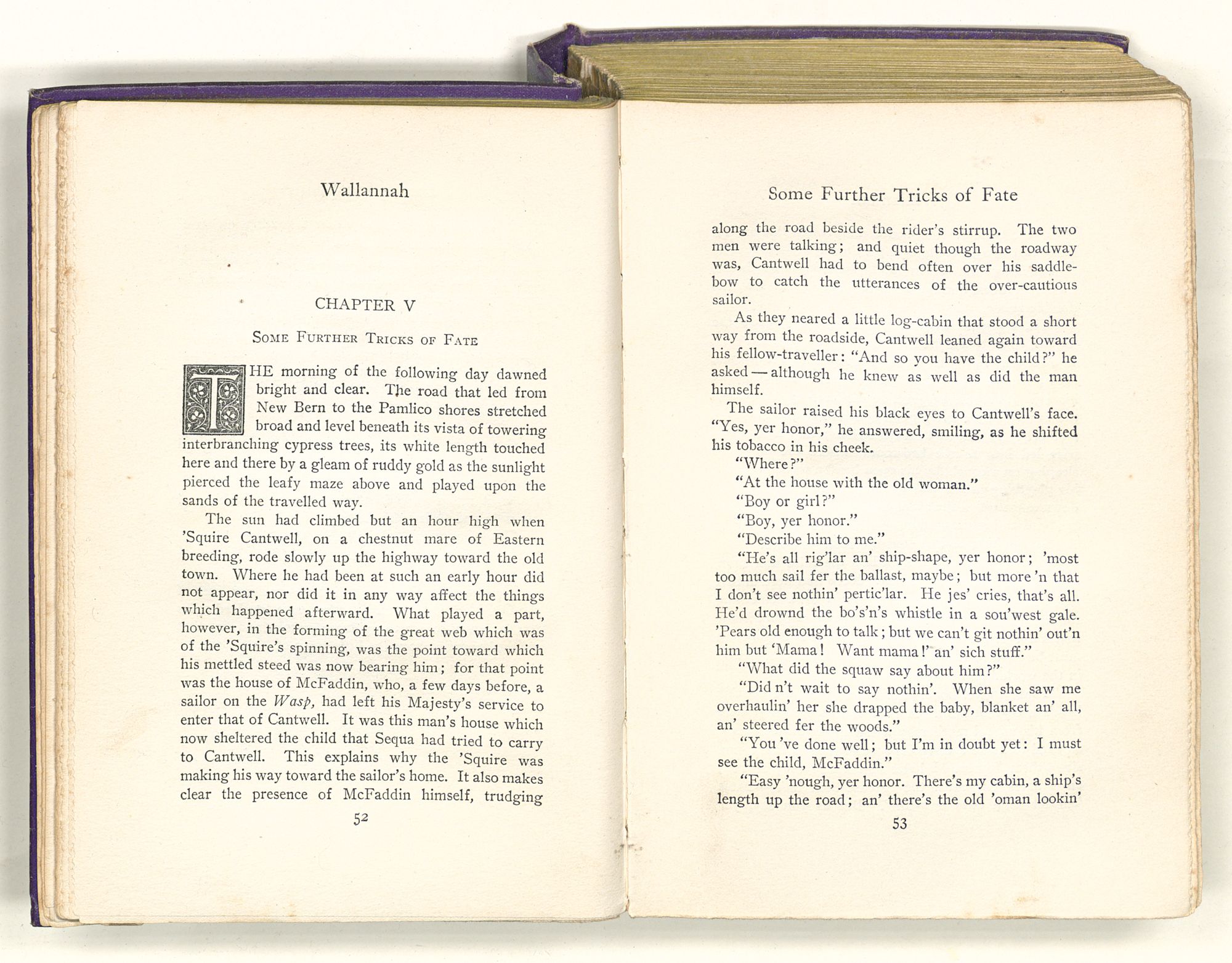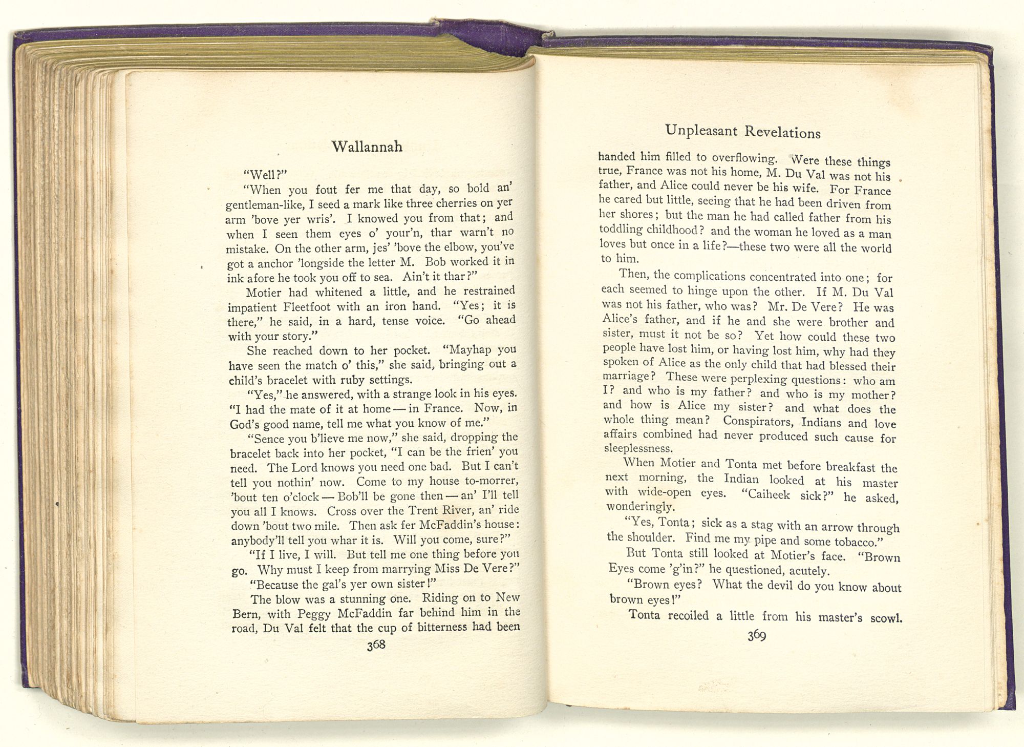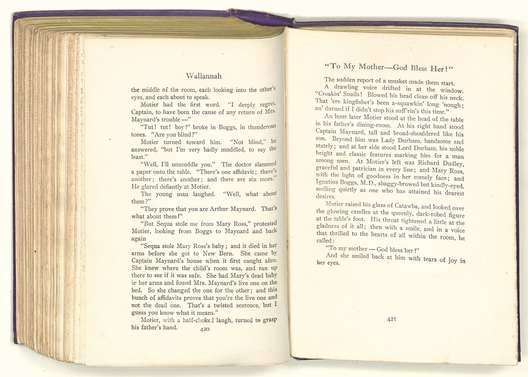 “Sequa stole Mary Ross's baby; and it died in her arms before she got to New Bern. She came by Captain Maynard's house when it first caught afire. She knew where the child's room was, and ran up there to see if it was safe. She had Mary's dead baby in her arms and found Mrs. Maynard's live one on the bed. So she changed the one for the other; and this bunch of affidavits proves that you're the live one and not the dead one. That's a twisted sentence, but I guess you know what it means.”