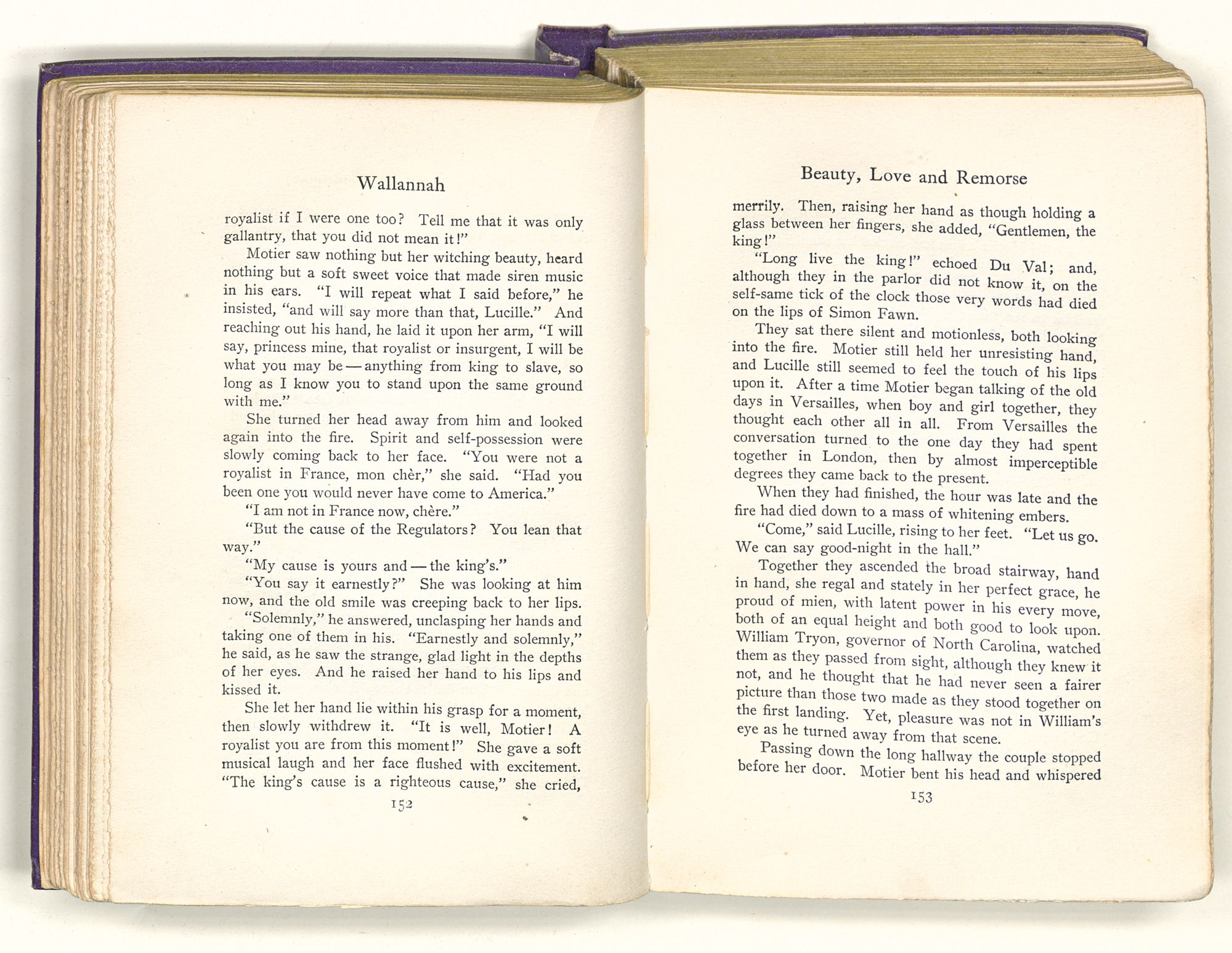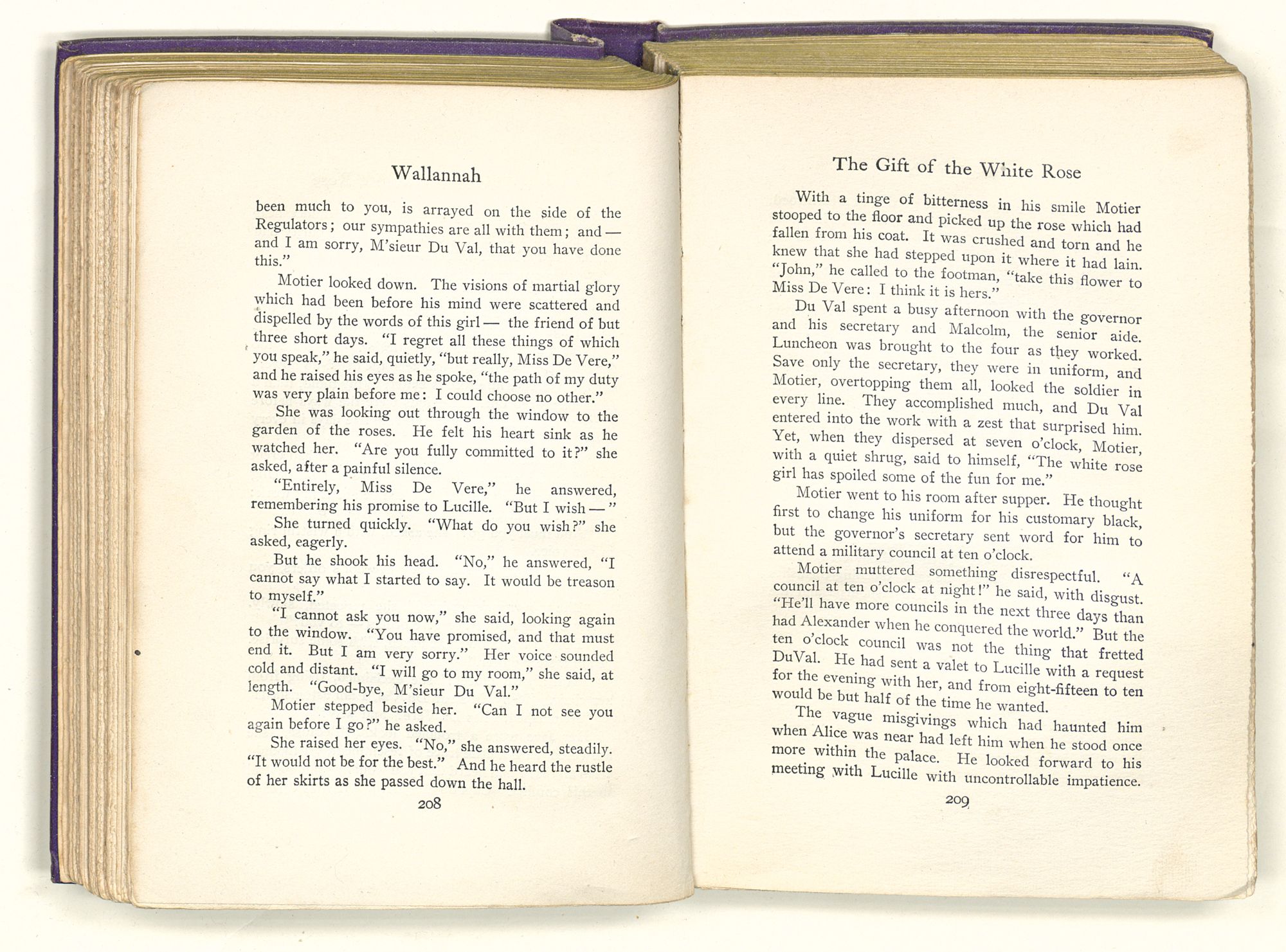 AFTER supper Motier, leaving the guests in the parlor, stole through the back door and went down the lane toward the stable. The moon was still below the forests, but its light was in the sky; and Motier, pausing for a moment on his way, could see in clear-cut silhouette the familiar shapes of the mansions round about the town. There were the great trees that guarded the governor's palace — the princely house whose halls now rang with the steps of strangers, but whose every niche and alcove teemed with the whitening bones of its dead memories. And there, so far away that his eyes could scarcely pierce the gloom, were the elms that lined the graveled walkways of Beechwood. Under the elms had been the roses — roses white as her own pure brow — but all of that had been years and years before. The roses, perhaps, were dead; and she — he knew not where she was.
