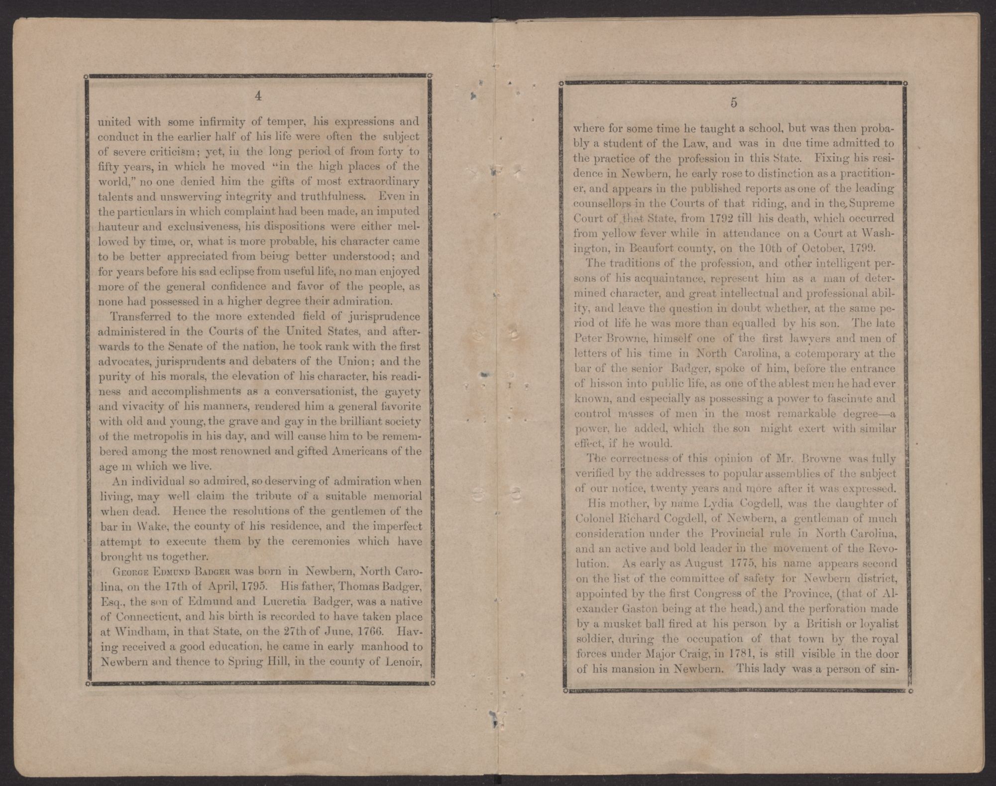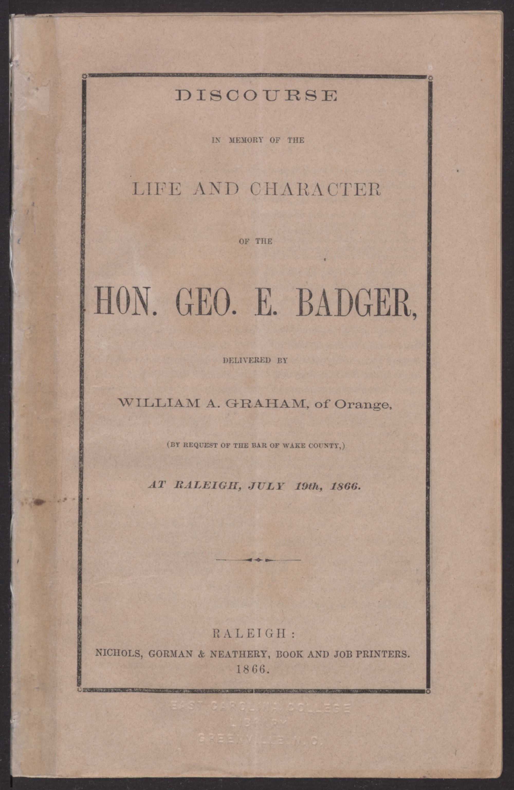 DISCOURSE IN MEMORY OF THE LIFE AND CHARACTER OF THE HON. GEO. E. BADGER,DELIVERED BY WILLIAM A. GRAHAM, of Orange.(BY REQUEST OF THE BAR OF WAKE COUNTY,) AT RALEIGH, JULY 19th, 1866.RALEIGH:NICHOLS, GORMAN & NEATHERY, BOOK AND JOB PRINTERS.1866.