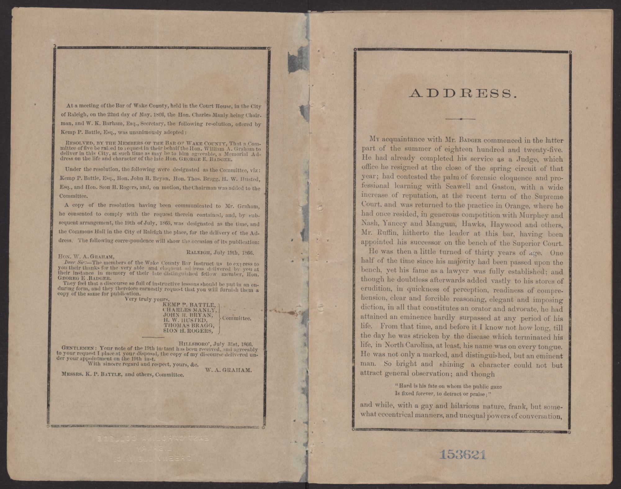 RESOLVED, BY THE MEMBERS OF THE BAR OF WAKE COUNTY, That a Committee of five be raised to request in their behalf the Hon. William A. Graham to deliver in this City, at such time as may be to him agreeable, a Memorial Address on the life and character of the late Hon. GEORGE E. BADGER.