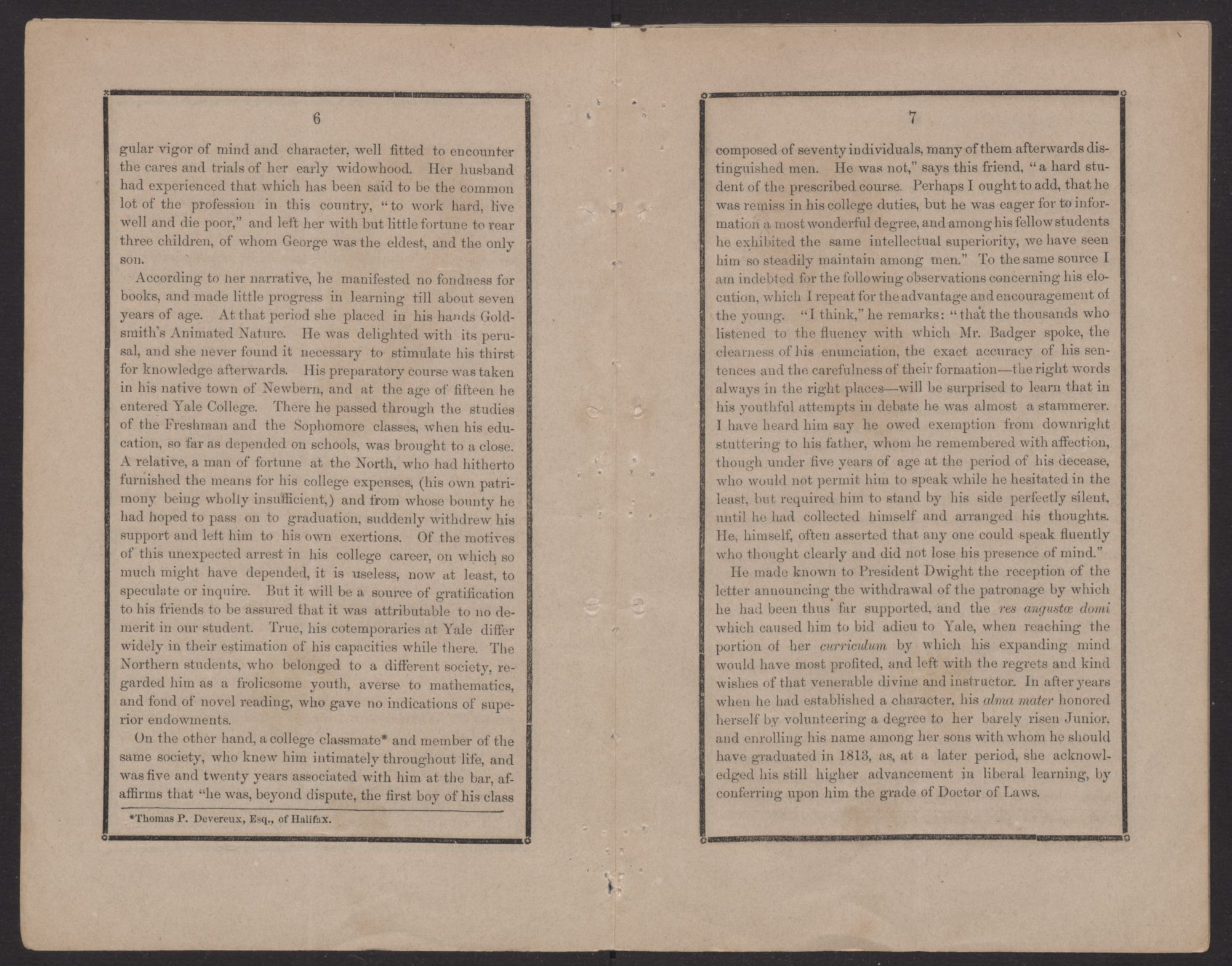 * Thomas P. Devereux, Esq., of Halifax.composed of seventy individuals, many of them afterwards distinguished men. He was not,” says this friend, “a hard student of the prescribed course. Perhaps I ought to add, that he was remiss in his college duties, but he was eager for to information a most wonderful degree, and among his fellow students he exhibited the same intellectual superiority, we have seen him so steadily maintain among men.” To the same source I am indebted for the following observations concerning his elocution, which I repeat for the advantage and encouragement of the young. “I think,” he remarks: “that the thousands who listened to the fluency with which Mr. Badger spoke, the clearness of his enunciation, the exact accuracy of his sentences and the carefulness of their formation—the right words always in the right places—will be surprised to learn that in his youthful attempts in debate he was almost a stammerer. I have heard him say he owed exemption from downright stuttering to his father, whom he remembered with affection, though under five years of age at the period of his decease, who would not permit him to speak while he hesitated in the least, but required him to stand by his side perfectly silent, until he had collected himself and arranged his thoughts. He, himself, often asserted that any one could speak fluently who thought clearly and did not lose his presence of mind.”