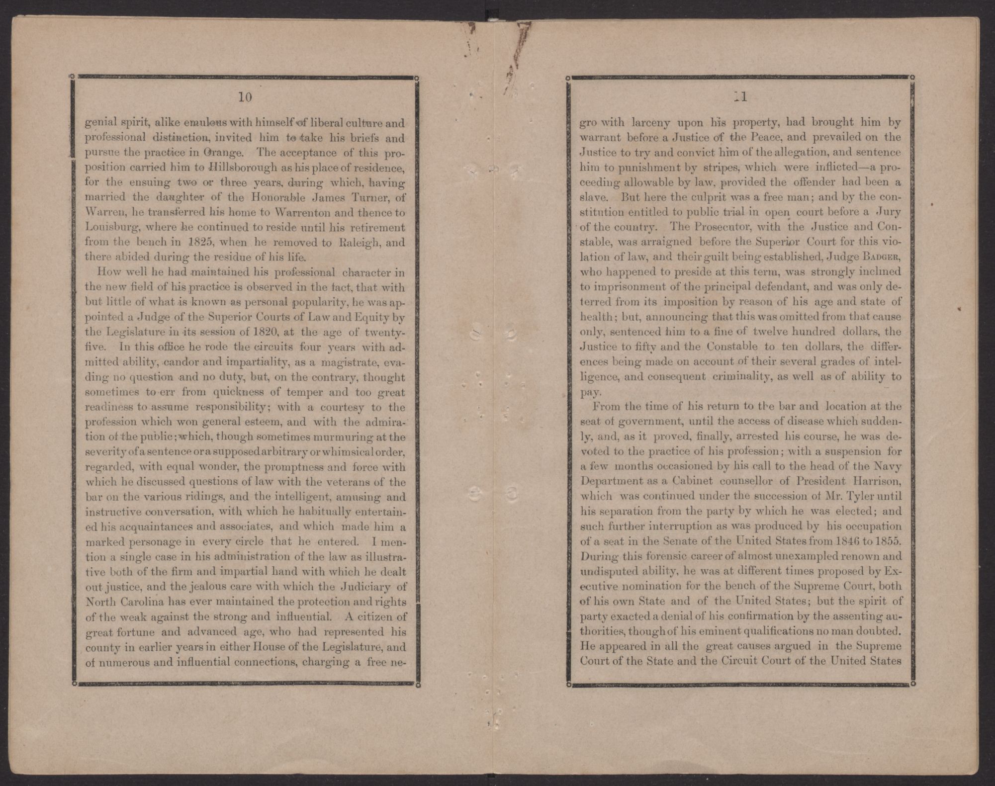 How well he had maintained his professional character in the new field of his practice is observed in the fact, that with but little of what is known as personal popularity, he was appointed a Judge of the Superior Courts of Law and Equity by the Legislature in its session of 1820, at the age of twenty-five. In this office he rode the circuits four years with admitted ability, candor and impartiality, as a magistrate, evading no question and no duty, but, on the contrary, thought sometimes to err from quickness of temper and too great readiness to assume responsibility; with a courtesy to the profession which won general esteem, and with the admiration of the public; which, though sometimes murmuring at the severity of a sentence or a supposed arbitrary or whimsical order, regarded, with equal wonder, the promptness and force with which he discussed questions of law with the veterans of the bar on the various ridings, and the intelligent, amusing and instructive conversation, with which he habitually entertained his acquaintances and associates, and which made him a marked personage in every circle that he entered. I mention a single case in his administration of the law as illustrative both of the firm and impartial hand with which he dealt out justice, and the jealous care with which the Judiciary of North Carolina has ever maintained the protection and rights of the weak against the strong and influential. A citizen of great fortune and advanced age, who had represented his county in earlier years in either House of the Legislature, and of numerous and influential connections, charging a free negro