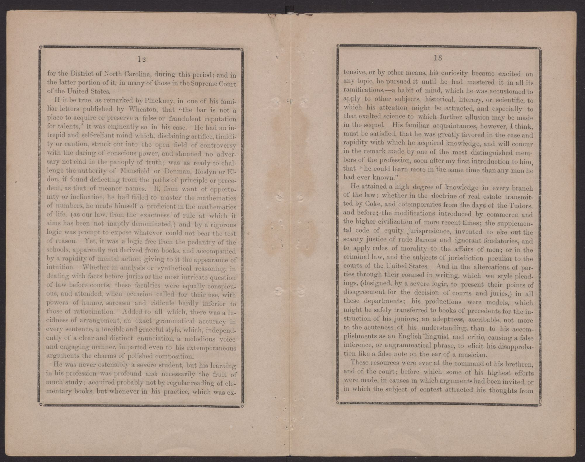 He was then a little turned of thirty years of age. One half of the time since his majority had been passed upon the bench, yet his fame as a lawyer was fully established; and though he doubtless afterwards added vastly to his stores of erudition, in quickness of perception, readiness of comprehension, clear and forcible reasoning, elegant and imposing diction, in all that constitutes an orator and advocate, he had attained an eminence hardly surpassed at any period of his life. From that time, and before it I know not how long, till the day he was stricken by the disease which terminated his life, in North Carolina, at least, his name was on every tongue. He was not only a marked, and distinguished, but an eminent man. So bright and shining a character could not but attract general observation; and though