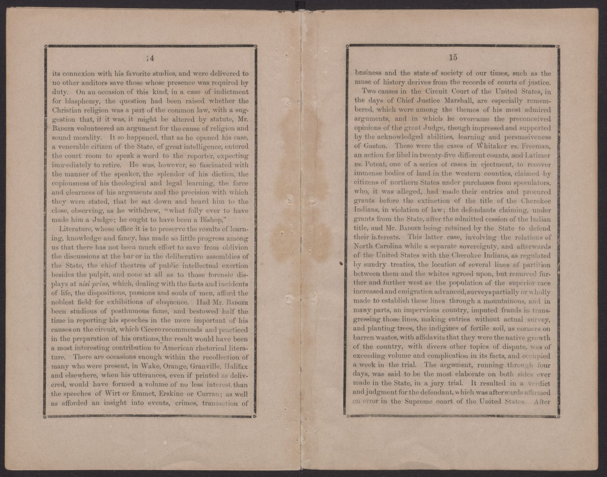 Two causes in the Circuit Court of the United States, in the days of Chief Justice Marshall, are especially remembered, which were among the themes of his most admired arguments, and in which he overcame the preconceived opinions of the great Judge, though impressed and supported by the acknowledged abilities, learning and persuasiveness of Gaston. These were the cases of Whitaker vs. Freeman, an action for libel in twenty-five different counts, and Latimer vs. Poteat, one of a series of cases in ejectment, to recover immense bodies of land in the western counties, claimed by citizens of northern States under purchases from speculators, who, it was alleged, had made their entries and procured grants before the extinction of the title of the Cherokee Indians, in violation of law; the defendants claiming, under grants from the State, after the admitted cession of the Indian title, and Mr. BADGER being retained by the State to defend their interests. This latter case, involving the relations of North Carolina while a separate sovereignty, and afterwards of the United States with the Cherokee Indians, as regulated by sundry treaties, the location of several lines of partition between them and the whites agreed upon, but removed further and further west as the population of the superior race increased and emigration advanced, surveys partially or wholly made to establish these lines through a mountainous, and in many parts, an impervious country, imputed frauds in transgressing those lines, making entries without actual survey, and planting trees, the indigines of fertile soil, as corners on barren wastes, with affidavits that they were the native growth of the country, with divers other topics of dispute, was of exceeding volume and complication in its facts, and occupied a week in the trial. The argument, running through four days, was said to be the most elaborate on both sides ever made in the State, in a jury trial. It resulted in a verdict and judgment for the defendant, which was afterwards affirmed on error in the Supreme court of the United States. After