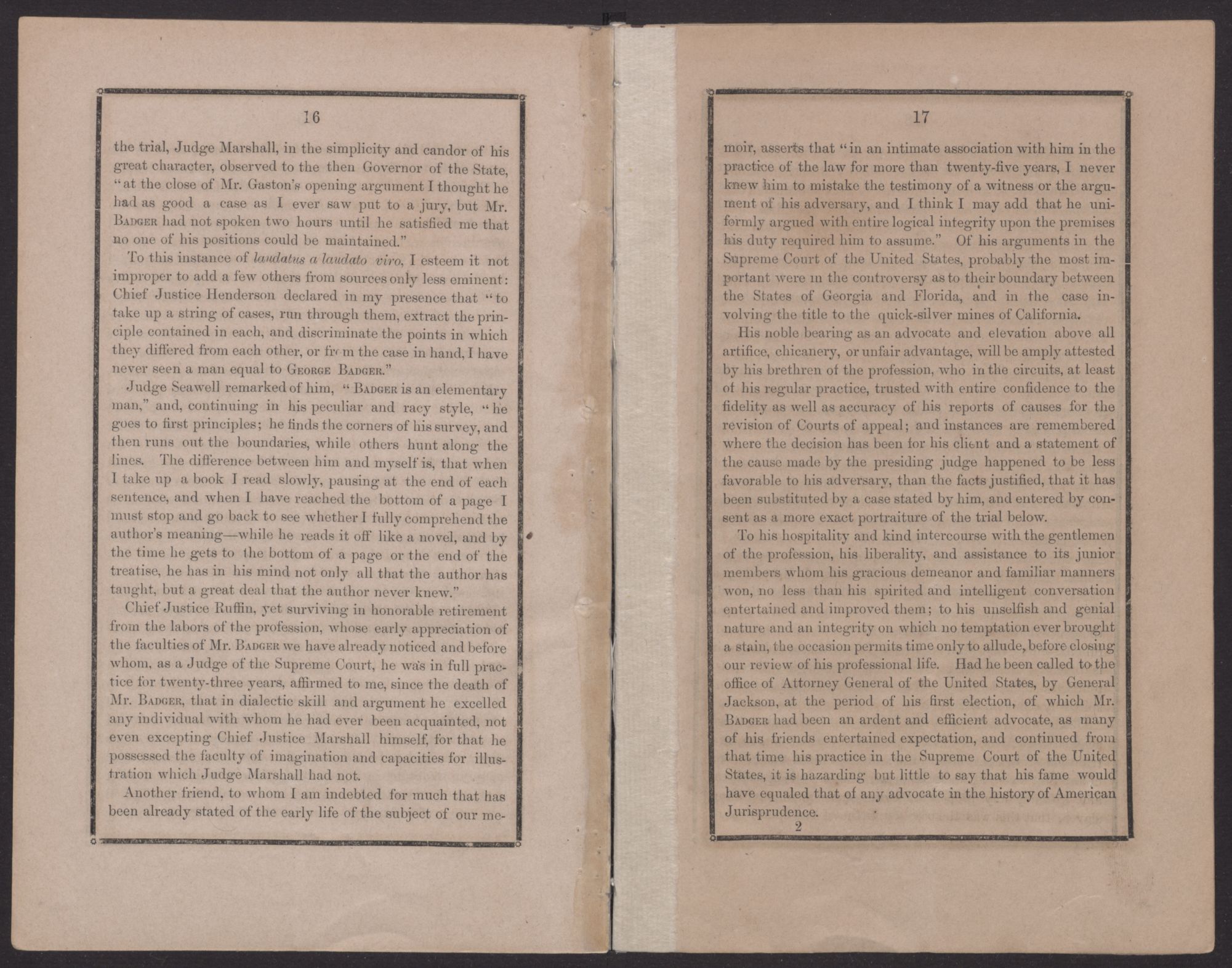 To this instance of laudatus a laudato viro, I esteem it not improper to add a few others from sources only less eminent: Chief Justice Henderson declared in my presence that “to take up a string of cases, run through them, extract the principle contained in each, and discriminate the points in which they differed from each other, or from the case in hand; I have never seen a man equal to GEORGE BADGER.”