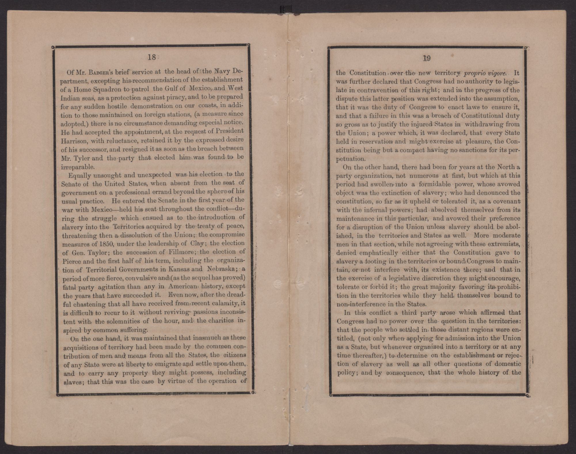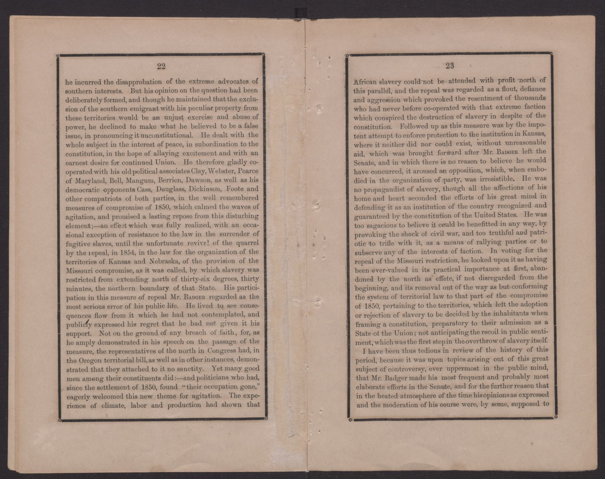 he incurred the disapprobation of the extreme advocates of southern interests. But his opinion on the question had been deliberately formed, and though he maintained that the exclusion of the southern emigrant with his peculiar property from these territories would be an unjust exercise and abuse of power, he declined to make what he believed to be a false issue, in pronouncing it unconstitutional. He dealt with the whole subject in the interest of peace, in subordination to the constitution, in the hope of allaying excitement and with an earnest desire for continued Union. He therefore gladly cooperated with his old political associates Clay, Webster, Pearce of Maryland, Bell, Mangum, Berrien, Dawson, as well as his democratic opponents Cass, Douglass, Dickinson, Foote and other compatriots of both parties, in the well remembered measures of compromise of 1850, which calmed the waves of agitation, and promised a lasting repose from this disturbing element;—an effect which was fully realized, with an occasional exception of resistance to the law in the surrender of fugitive slaves, until the unfortunate revival of the quarrel by the repeal, in 1854, in the law for the organization of the territories of Kansas and Nebraska, of the provision of the Missouri compromise, as it was called, by which slavery was restricted from extending north of thirty-six degrees, thirty minutes, the northern boundary of that State. His participation in this measure of repeal Mr. BADGER regarded as the most serious error of his public life. He lived to see consequences flow from it which he had not contemplated, and publicly expressed his regret that he had not given it his support. Not on the ground of any breach of faith, for, as he amply demonstrated in his speech on the passage of the measure, the representatives of the north in Congress had, in the Oregon territorial bill, as well as in other instances, demonstrated that they attached to it no sanctity. Yet many good men among their constituents did:—and politicians who had, since the settlement of 1850, found “their occupation gone,” eagerly welcomed this new theme for agitation. The experience of climate, labor and production had shown that