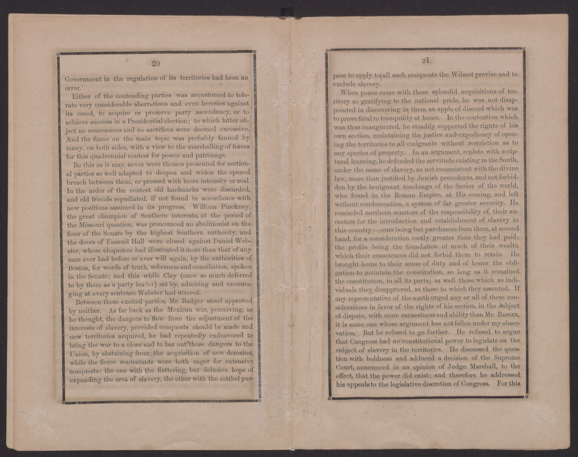 When peace came with those splendid acquisitions of territory so gratifying to the national pride, he was not disappointed in discovering in them an apple of discord which was to prove fatal to tranquility at home. In the contention which was thus inaugurated, he steadily supported the rights of his own section, maintaining the justice and expediency of opening the territories to all emigrants without restriction as to any species of property. In an argument, replete with scriptural learning, he defended the servitude existing in the South, under the name of slavery, as not inconsistent with the divine law, more than justified by Jewish precedents, and not forbidden by the benignant teachings of the Savior of the world, who found in the Roman Empire, at His coming, and left without condemnation, a system of far greater severity. He reminded northern senators of the responsibility of their ancestors for the introduction and establishment of slavery in this country:—ours being but purchasers from them, at second hand, for a consideration vastly greater than they had paid; the profits being the foundation of much of their wealth which their consciences did not forbid them to retain. He brought home to their sense of duty and of honor the obligation to maintain the constitution, so long as it remained the constitution, in all its parts; as well those which as individuals they disapproved, as those to which they assented. If any representative of the south urged any or all of these considerations in favor of the rights of his section, in the subject of dispute, with more earnestness and ability than Mr. BADGER, it is some one whose argument has not fallen under my observation. But he refused to go further. He refused to argue that Congress had no constitutional power to legislate on the subject of slavery in the territories. He discussed the question with boldness and adduced a decision of the Supreme Court, announced in an opinion of Judge Marshall, to the effect, that the power did exist; and therefore he addressed his appeals to the legislative discretion of Congress. For this