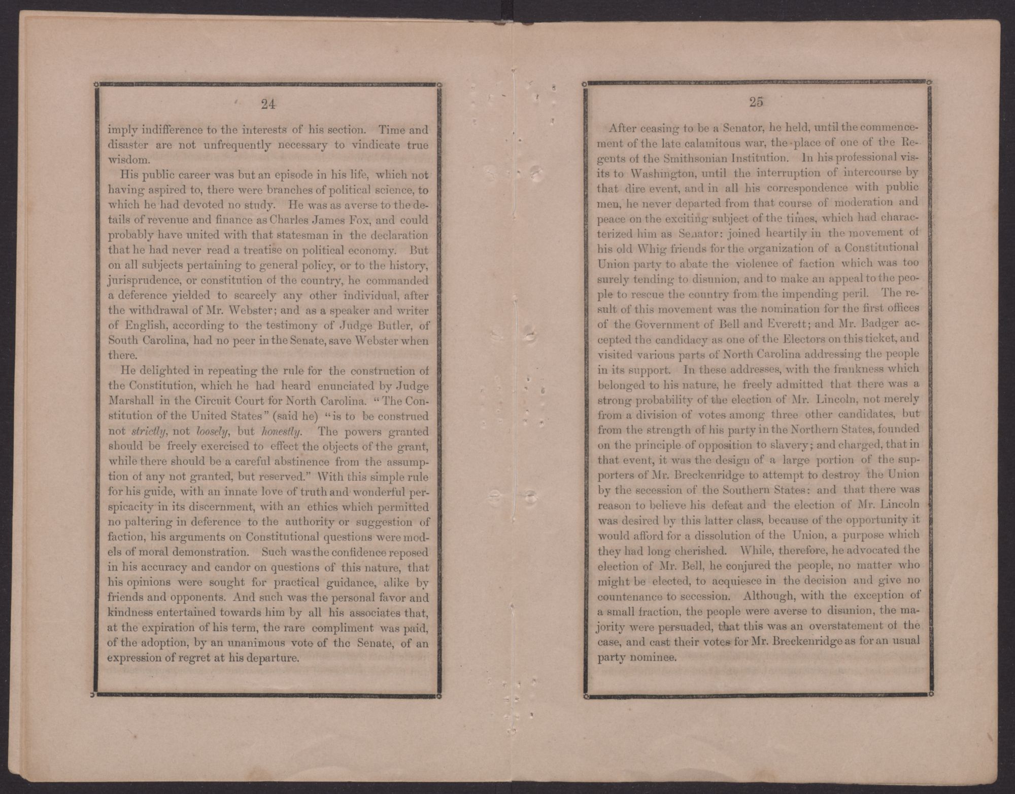 After ceasing to be a Senator, he held, until the commencement of the late calamitous war, the place of one of the Regents of the Smithsonian Institution. In his professional visits to Washington, until the interruption of intercourse by that dire event, and in all his correspondence with public men, he never departed from that course of moderation and peace on the exciting subject of the times, which had characterized him as Senator: joined heartily in the movement of his old Whig friends for the organization of a Constitutional Union party to abate the violence of faction which was too surely tending to disunion, and to make an appeal to the people to rescue the country from the impending peril. The result of this movement was the nomination for the first offices of the Government of Bell and Everett; and Mr. Badger accepted the candidacy as one of the Electors on this ticket, and visited various parts of North Carolina addressing the people in its support. In these addresses, with the frankness which belonged to his nature, he freely admitted that there was a strong probability of the election of Mr. Lincoln, not merely from a division of votes among three other candidates, but from the strength of his party in the Northern States, founded on the principle of opposition to slavery; and charged, that in that event, it was the design of a large portion of the supporters of Mr. Breckenridge to attempt to destroy the Union by the secession of the Southern States: and that there was reason to believe his defeat and the election of Mr. Lincoln was desired by this latter class, because of the opportunity it would afford for a dissolution of the Union, a purpose which they had long cherished. While, therefore, he advocated the election of Mr. Bell, he conjured the people, no matter who might be elected, to acquiesce in the decision and give no countenance to secession. Although, with the exception of a small fraction, the people were averse to disunion, the majority were persuaded, that this was an overstatement of the case, and cast their votes for Mr. Breckenridge as for an usual party nominee.