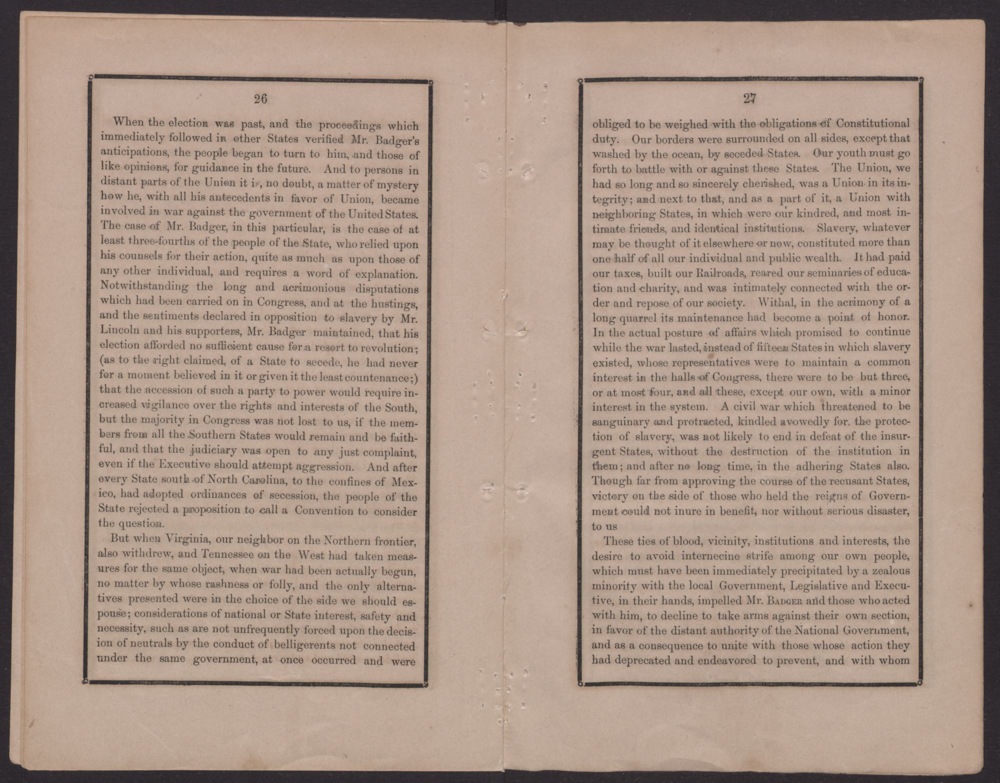When the election was past, and the proceedings which immediately followed in other States verified Mr. Badger's anticipations, the people began to turn to him, and those of like opinions, for guidance in the future. And to persons in distant parts of the Union it is, no doubt, a matter of mystery how he, with all his antecedents in favor of Union, became involved in war against the government of the United States. The case of Mr. Badger, in this particular, is the case of at least three-fourths of the people of the State, who relied upon his counsels for their action, quite as much as upon those of any other individual, and requires a word of explanation. Notwithstanding the long and acrimonious disputations which had been carried on in Congress, and at the hustings, and the sentiments declared in opposition to slavery by Mr. Lincoln and his supporters, Mr. Badger maintained, that his election afforded no sufficient cause for a resort to revolution; (as to the right claimed, of a State to secede, he had never for a moment believed in it or given it the least countenance;) that the accession of such a party to power would require increased vigilance over the rights and interests of the South, but the majority in Congress was not lost to us, if the members from all the Southern States would remain and be faithful, and that the judiciary was open to any just complaint, even if the Executive should attempt aggression. And after every State south of North Carolina, to the confines of Mexico, had adopted ordinances of secession, the people of the State rejected a proposition to call a Convention to consider the question.