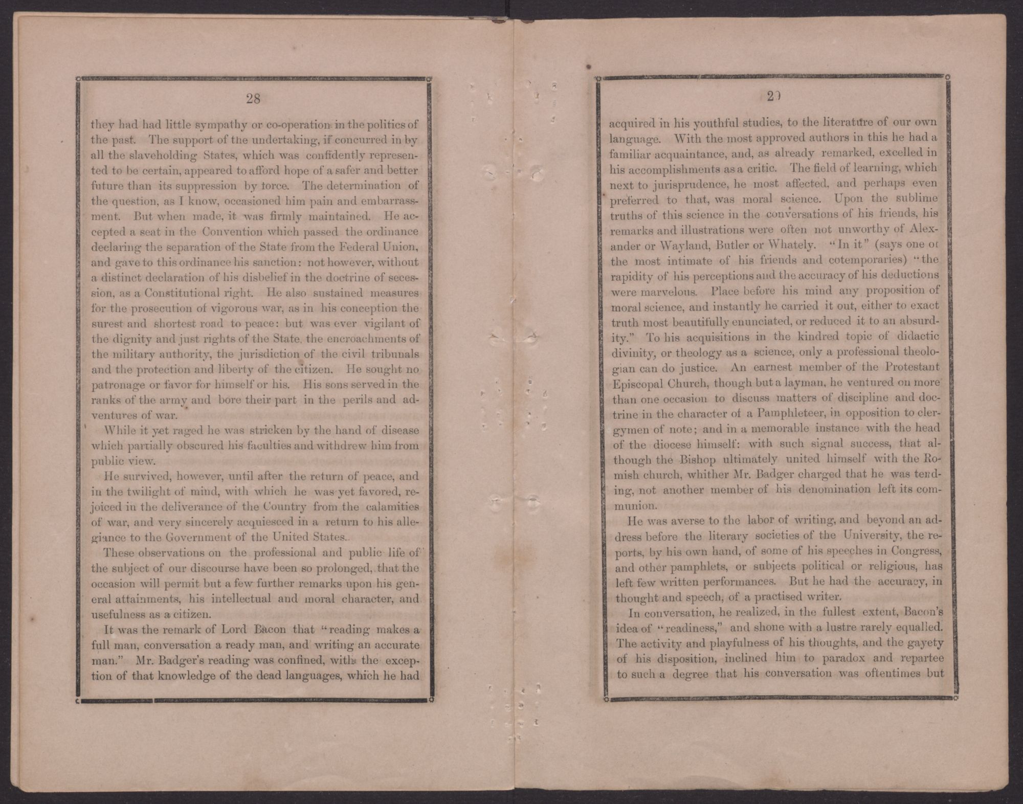 acquired in his youthful studies, to the literature of our own language. With the most approved authors in this he had a familiar acquaintance, and, as already remarked, excelled in his accomplishments as a critic. The field of learning, which next to jurisprudence, he most affected, and perhaps even preferred to that, was moral science. Upon the sublime truths of this science in the conversations of his friends, his remarks and illustrations were often not unworthy of Alexander or Wayland, Butler or Whately. “In it” (says one or the most intimate of his friends and cotemporaries) “the rapidity of his perceptions and the accuracy of his deductions were marvelous. Place before his mind any proposition of moral science, and instantly he carried it out, either to exact truth most beautifully enunciated, or reduced it to an absurdity.” To his acquisitions in the kindred topic of didactic divinity, or theology as a science, only a professional theologian can do justice. An earnest member of the Protestant Episcopal Church, though but a layman, he ventured on more than one occasion to discuss matters of discipline and doctrine in the character of a Pamphleteer, in opposition to clergymen of note; and in a memorable instance with the head of the diocese himself: with such signal success, that although the Bishop ultimately united himself with the Romish church, whither Mr. Badger charged that he was tending, not another member of his denomination left its communion.