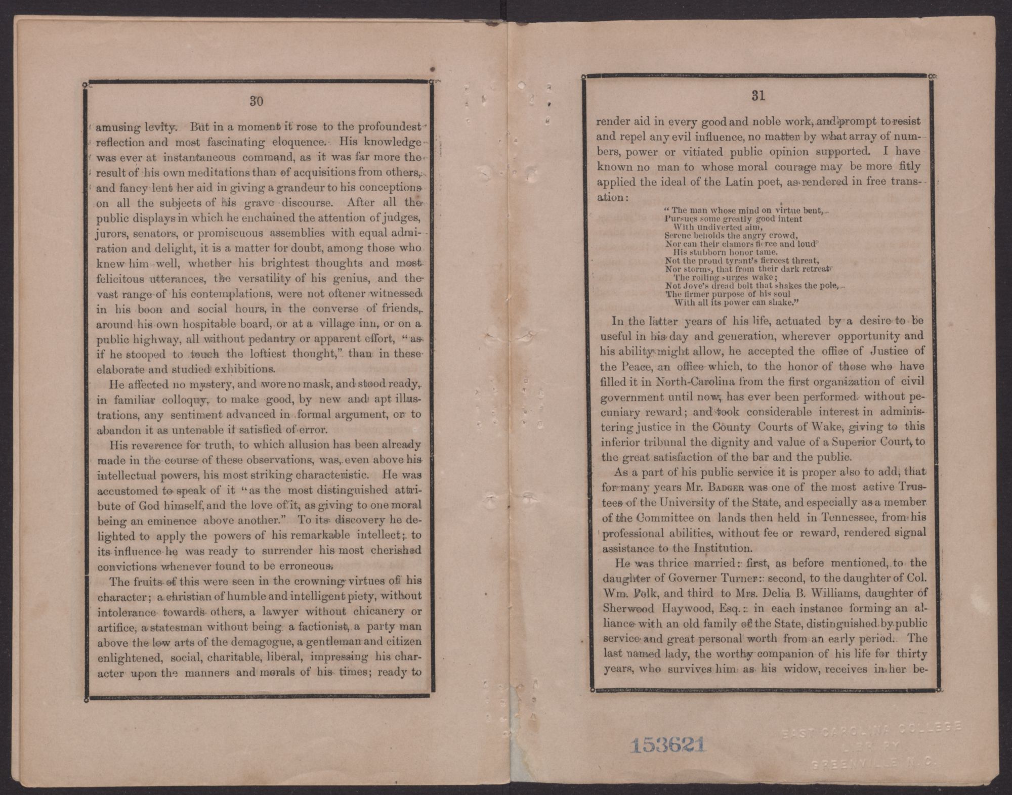 Literature, whose office it is to preserve the results of learning, knowledge and fancy, has made so little progress among us that there has not been much effort to save from oblivion the discussions at the bar or in the deliberative assemblies of the State, the chief theatres of public intellectual exertion besides the pulpit, and none at all as to those forensic displays at nisi prius, which, dealing with the facts and incidents of life, the dispositions, passions and souls of men, afford the noblest field for exhibitions of eloquence. Had Mr. BADGER been studious of posthumous fame, and bestowed half the time in reporting his speeches in the more important of his causes on the circuit, which Cicero recommends and practiced in the preparation of his orations, the result would have been a most interesting contribution to American rhetorical literature. There are occasions enough within the recollection of many who were present, in Wake, Orange, Granville, Halifax and elsewhere, when his utterances, even if printed as delivered, would have formed a volume of no less interest than the speeches of Wirt or Emmet, Erskine or Curran; as well as afforded an insight into events, crimes, transaction of