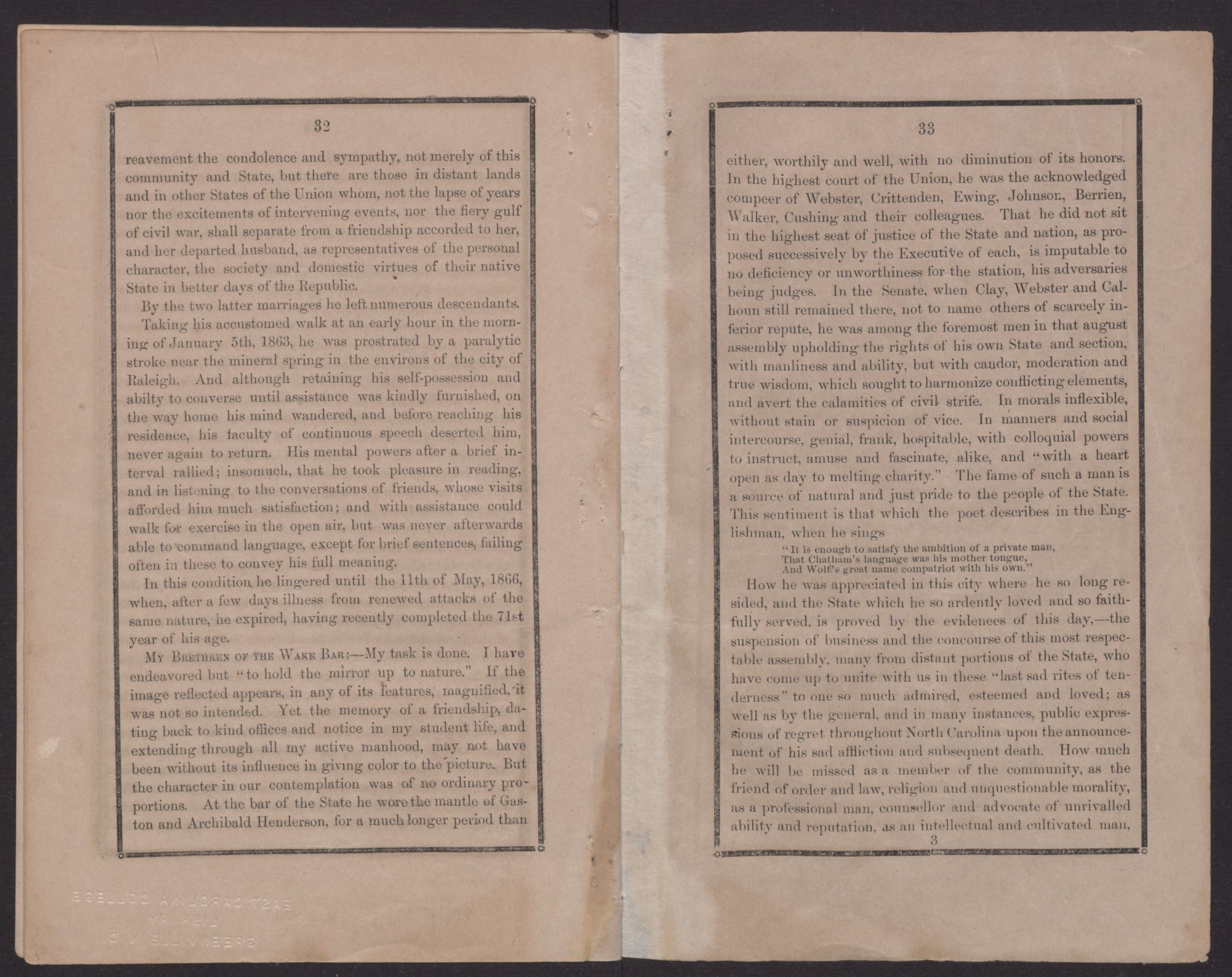 MY BRETHREN OF THE WAKE BAR:—My task is done. I have endeavored but “to hold the mirror up to nature.” If the image reflected appears, in any of its features, magnified, it was not so intended. Yet the memory of a friendship, dating back to kind offices and notice in my student life, and extending through all my active manhood, may not have been without its influence in giving color to the picture. But the character in our contemplation was of no ordinary proportions. At the bar of the State he wore the mantle of Gaston and Archibald Henderson, for a much longer period than