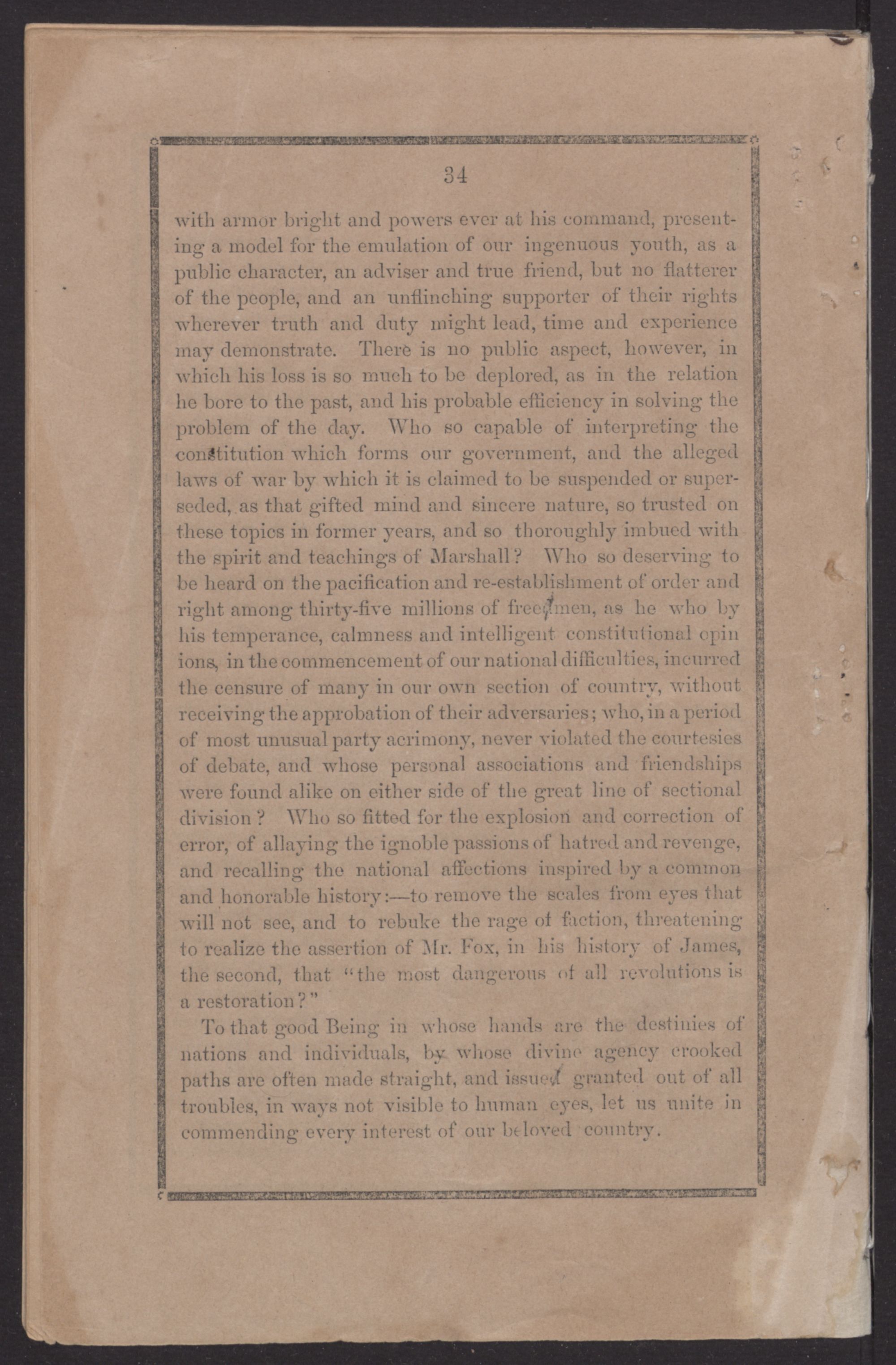 with armor bright and powers ever at his command, presenting a model for the emulation of our ingenuous youth, as a public character, an adviser and true friend, but no flatterer of the people, and an unflinching supporter of their rights wherever truth and duty might lead, time and experience may demonstrate. There is no public aspect, however, in which his loss is so much to be deplored, as in the relation he bore to the past, and his probable efficiency in solving the problem of the day. Who so capable of interpreting the constitution which forms our government, and the alleged laws of war by which it is claimed to be suspended or superseded, as that gifted mind and sincere nature, so trusted on these topics in former years, and so thoroughly imbued with the spirit and teachings of Marshall? Who so deserving to be heard on the pacification and re-establishment of order and right among thirty-five millions of freedmen, as he who by his temperance, calmness and intelligent constitutional opinions, in the commencement of our national difficulties, incurred the censure of many in our own section of country, without receiving the approbation of their adversaries; who, in a period of most unusual party acrimony, never violated the courtesies of debate, and whose personal associations and friendships were found alike on either side of the great line of sectional division? Who so fitted for the explosion and correction of error, of allaying the ignoble passions of hatred and revenge, and recalling the national affections inspired by a common and honorable history:—to remove the scales from eyes that will not see, and to rebuke the rage of faction, threatening to realize the assertion of Mr. Fox, in his history of James, the second, that “the most dangerous of all revolutions is a restoration?”