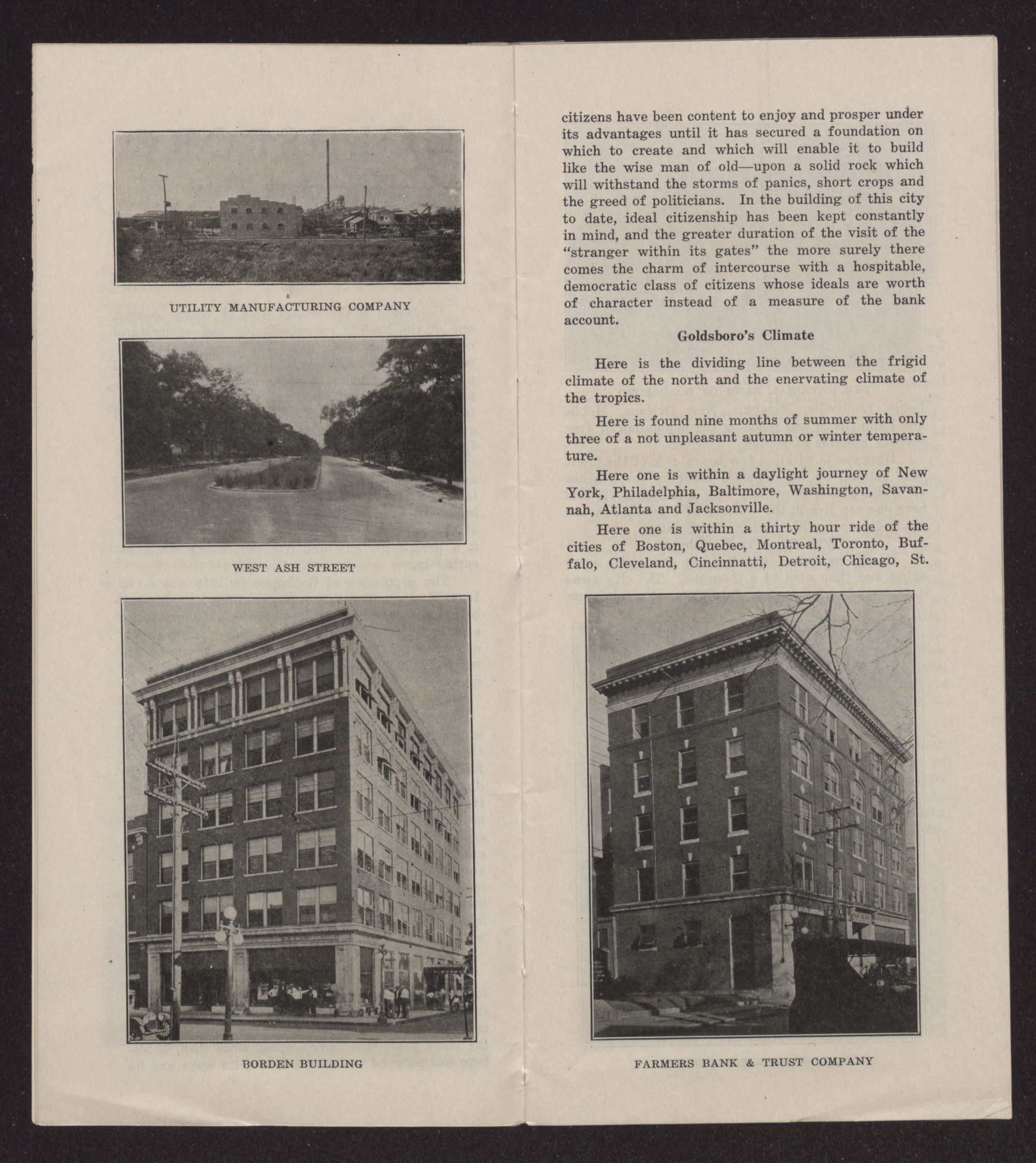 Today Goldsboro is an ideal location for factories. The great number of diversified industries now here are in a flourishing condition and developing to a marked degree each succeeding year; and the combination of climate, contiguity to the live sections of population, transportation, health, economic hospitality and other favorable conditions are
