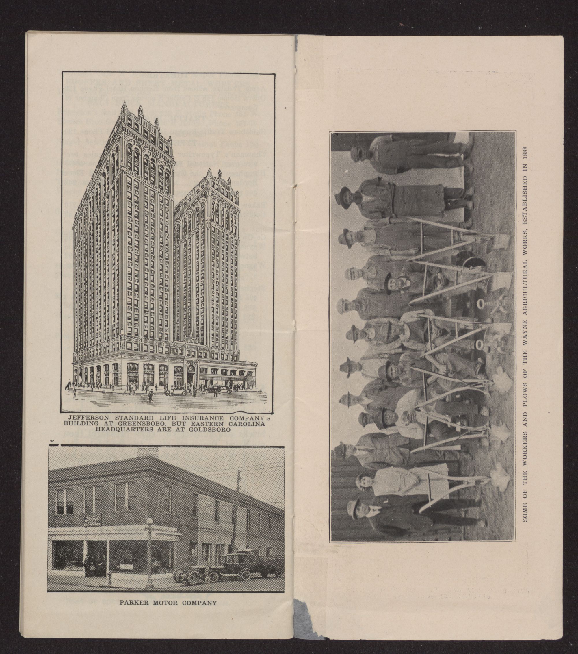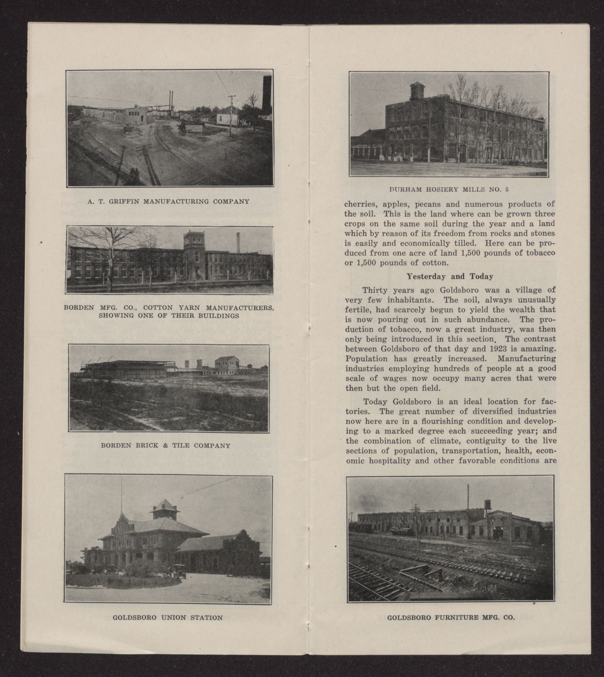 Yesterday and TodayThirty years ago Goldsboro was a village of very few inhabitants. The soil, always unusually fertile, had scarcely begun to yield the wealth that is now pouring out in such abundance. The production of tobacco, now a great industry, was then only being introduced in this section. The contrast between Goldsboro of that day and 1923 is amazing. Population has greatly increased. Manufacturing industries employing hundreds of people at a good scale of wages now occupy many acres that were then but the open field.