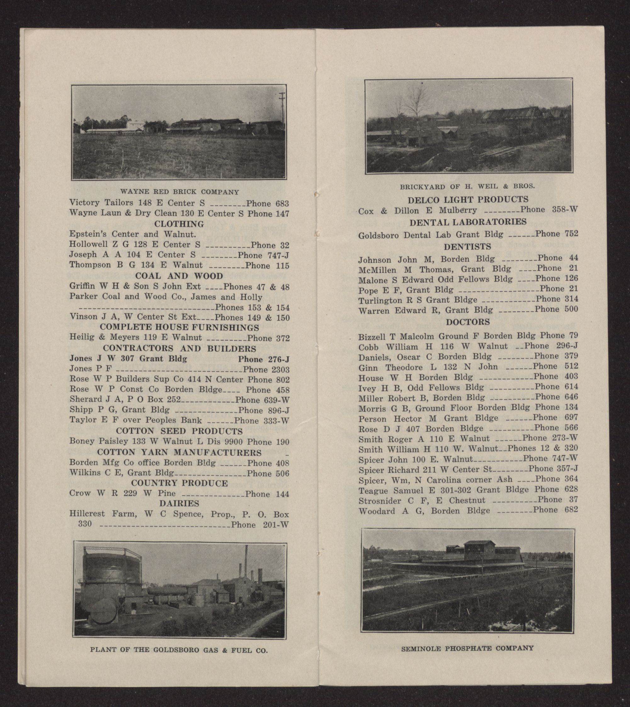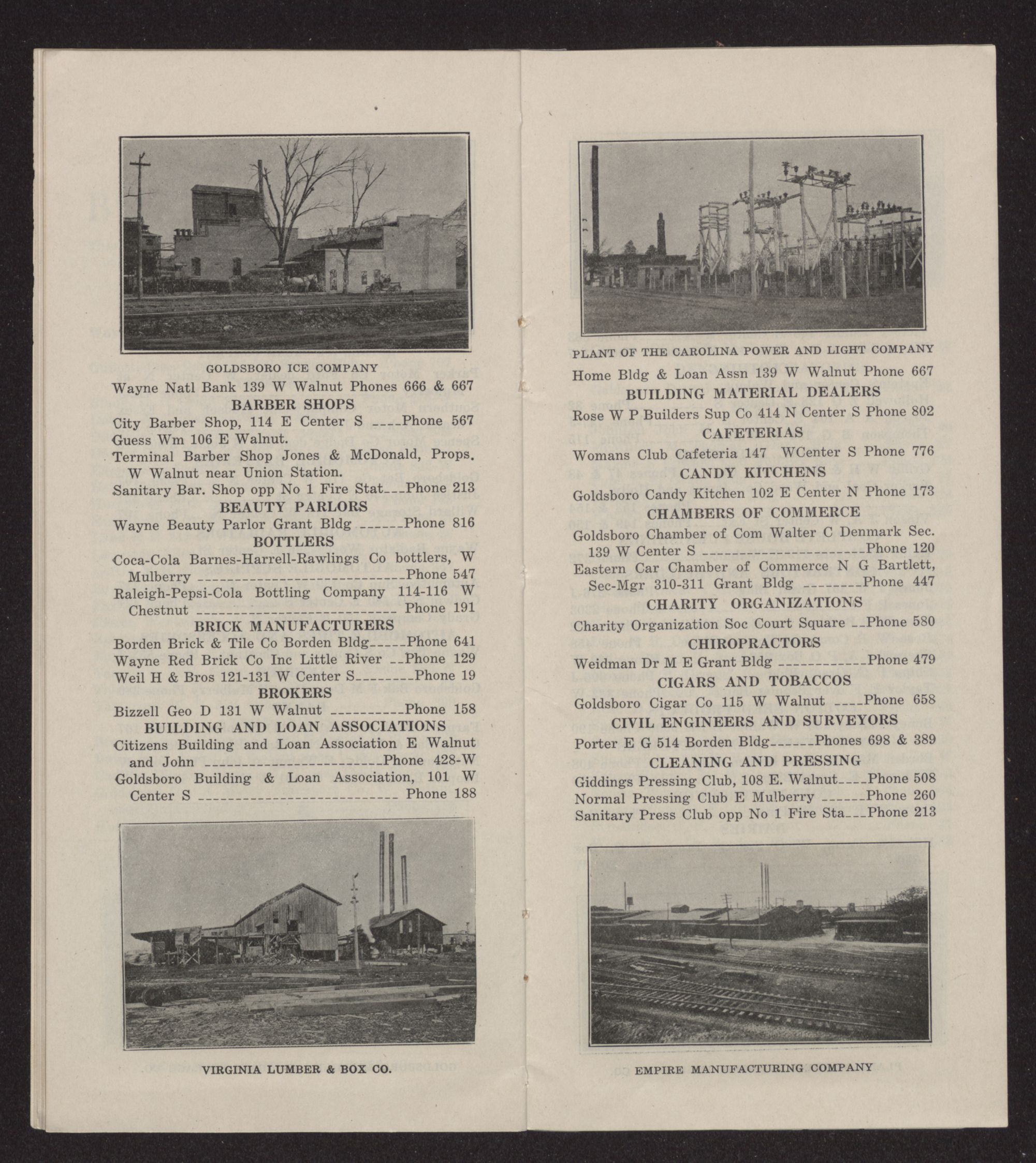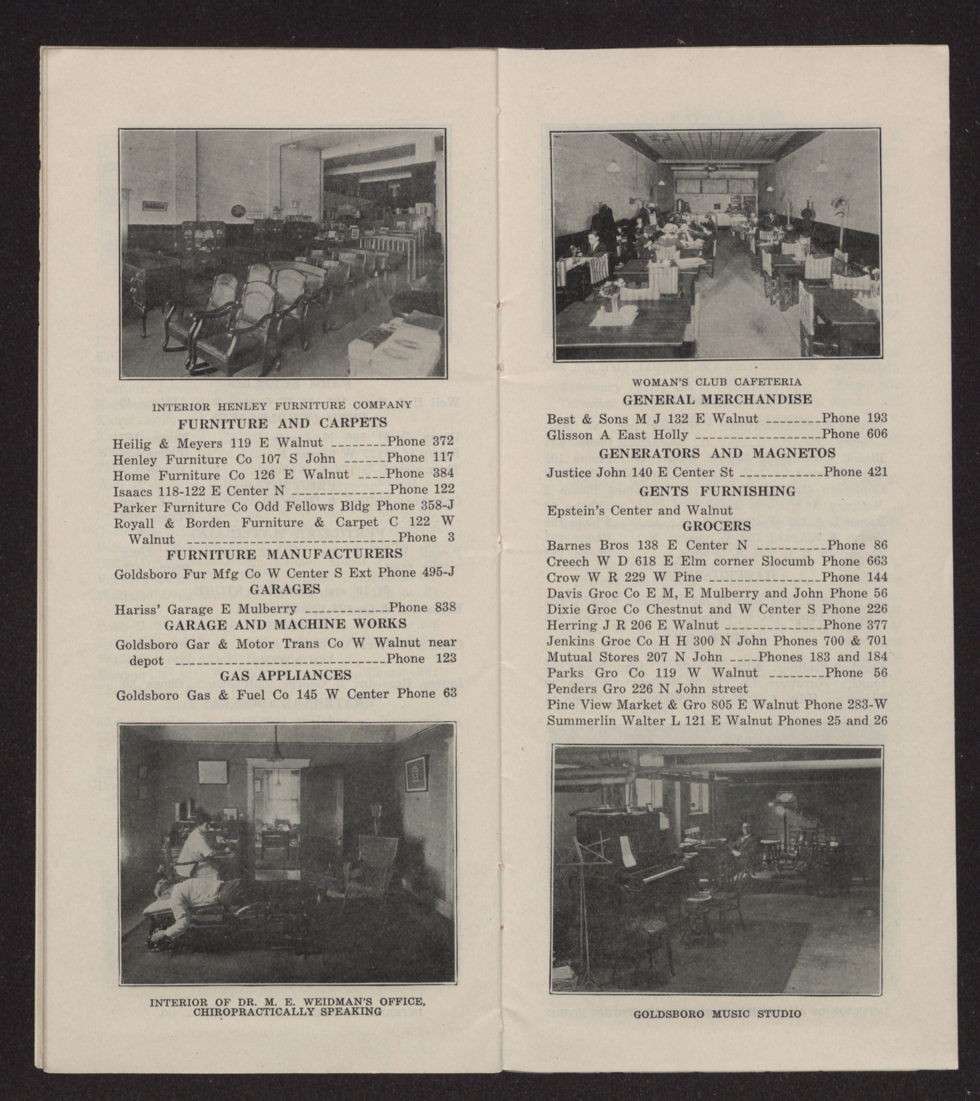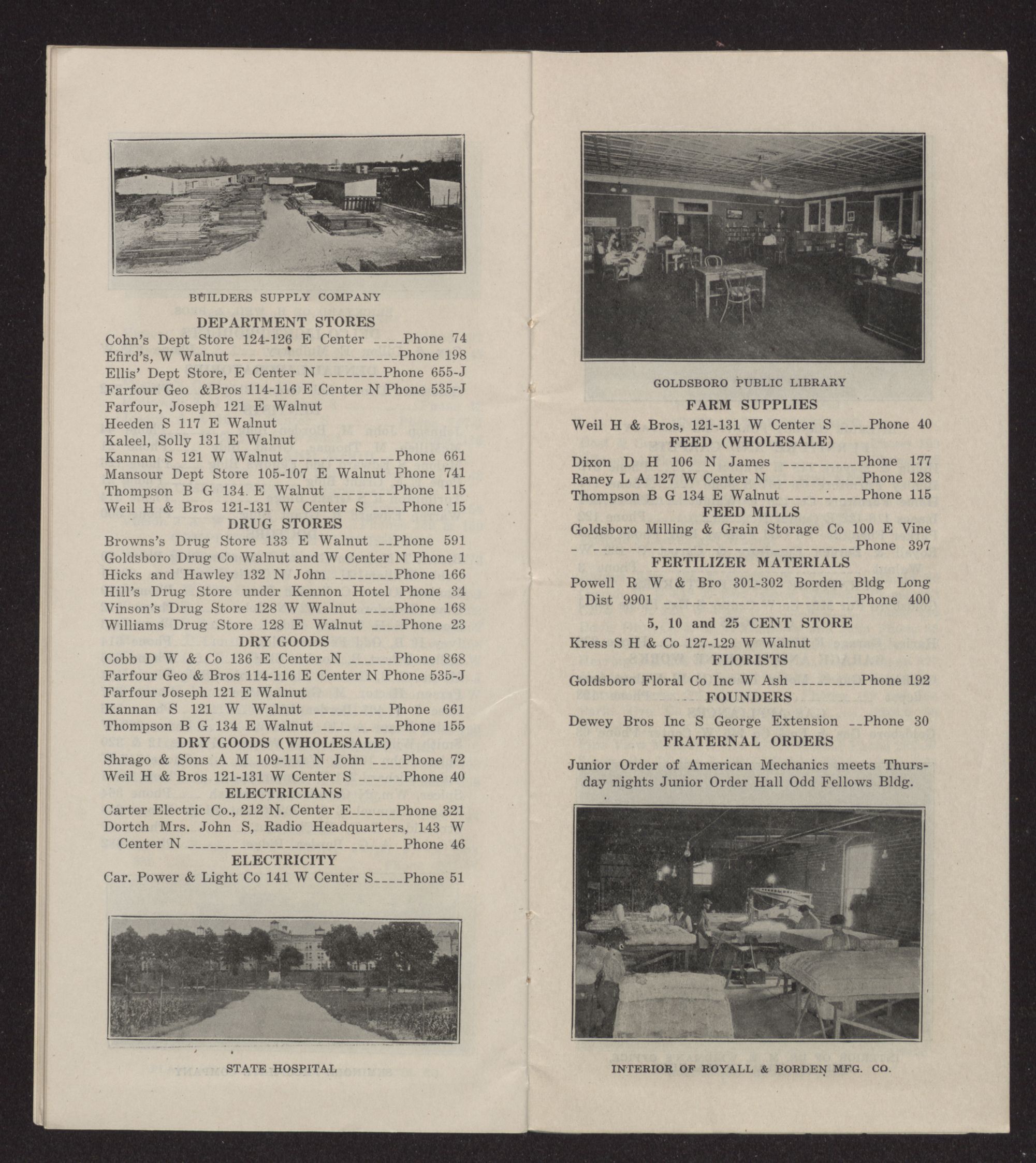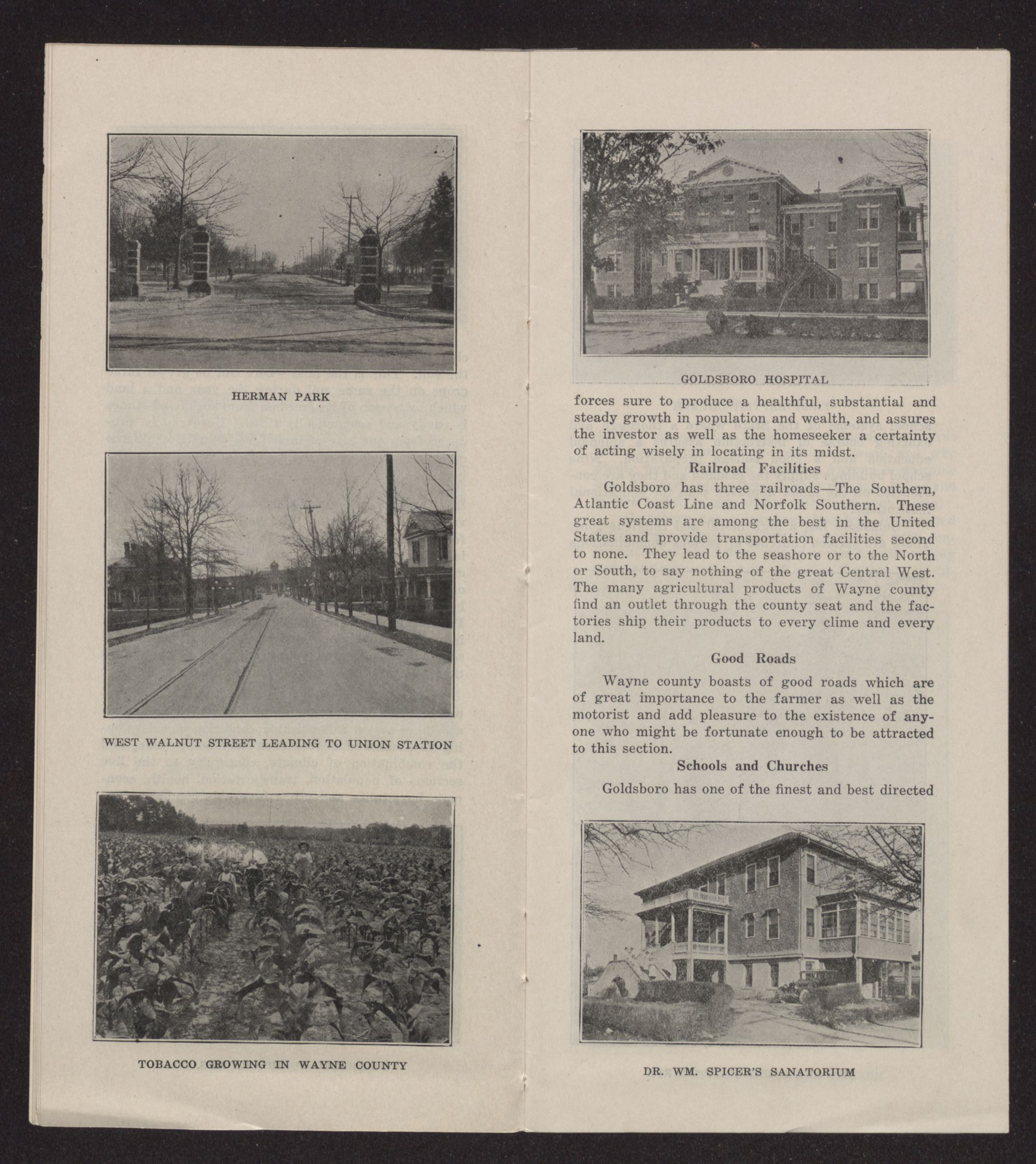 cost the purest of soft, uncontaminated drinking water. Goldsboro has sixteen miles of hard surfaced streets, twenty-eight miles of paved sidewalks, five and one-half miles of electric car line, well equipped parks and playgrounds, permanent health and sanitary officers with efficient staffs, a permanent community center, a nationally known organization of Associated Charities, and one of the best and most active Chambers of Commerce in the south, a wideawake Merchants Association, an efficient Traffic Department, Rotary and Kiwanis Clubs and all of the permanently recognized Fraternal orders have local posts. Living conditions, from a health standpoint are beyond criticism and living conditions from a financial standpoint are within the means of all. Electric power, gas, telephone and water rates are below those of the average city. Being located in an agricultural district, country produce is plentiful and reasonable in price. All roads leading into Goldsboro are in good condition and within a few months most of them will be hard surfaced. Hotel facilities are ample. Board and room in private homes is available.