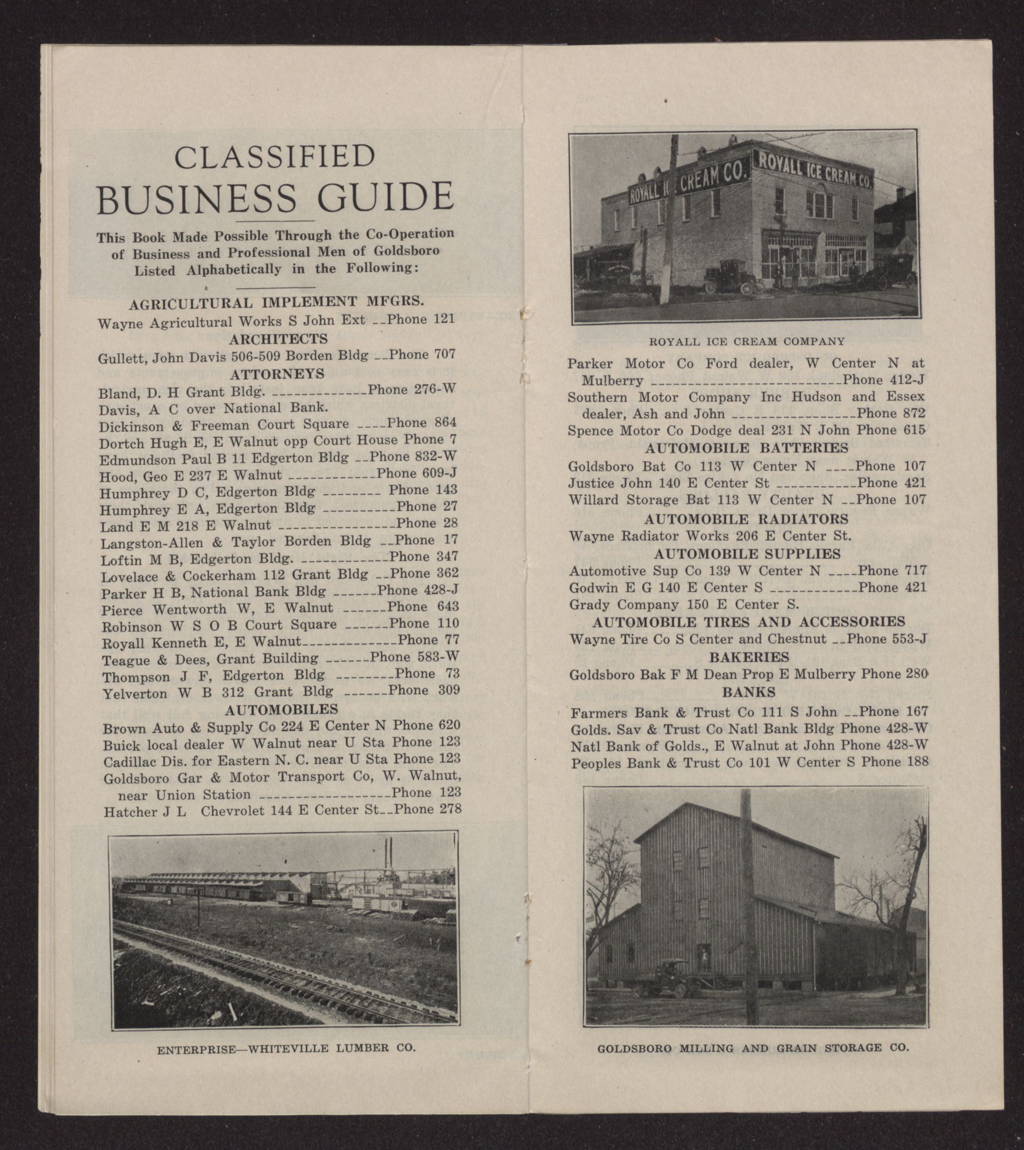 As a Commercial CenterGoldsboro, due to its surrounding territory and its geographical location and its unsurpassed facilties, is rapidly developing into a commercial center. Recently several large manufacturers have located distributing branches here. Thirty-two passenger trains run to and from the city daily which is quite advantageous to the commercial traveler doing business in Eastern North Carolina. Goldsboro is indeed and in fact The Gateway of Eastern North Carolina and as such has a mission to perform. A mission which concerns every man and a mission which means much to mankind, in general, because here in this favored spot is found health, happiness and well being.