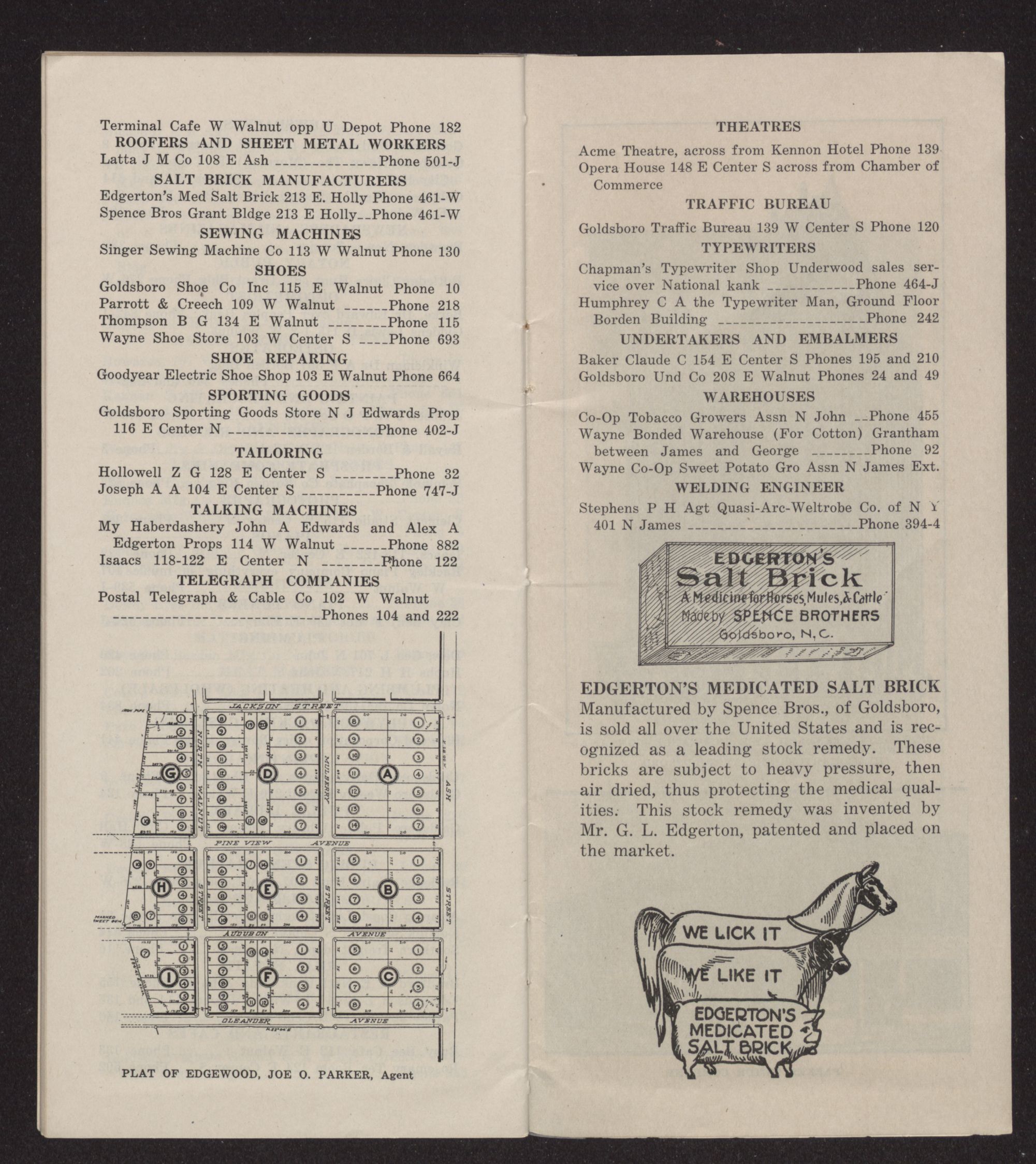 Manufactured by Spence Bros., of Goldsboro, is sold all over the United States and is recognized as a leading stock remedy. These bricks are subject to heavy pressure, then air dried, thus protecting the medical qualities. This stock remedy was invented by Mr. G. L. Edgerton, patented and placed on the market.