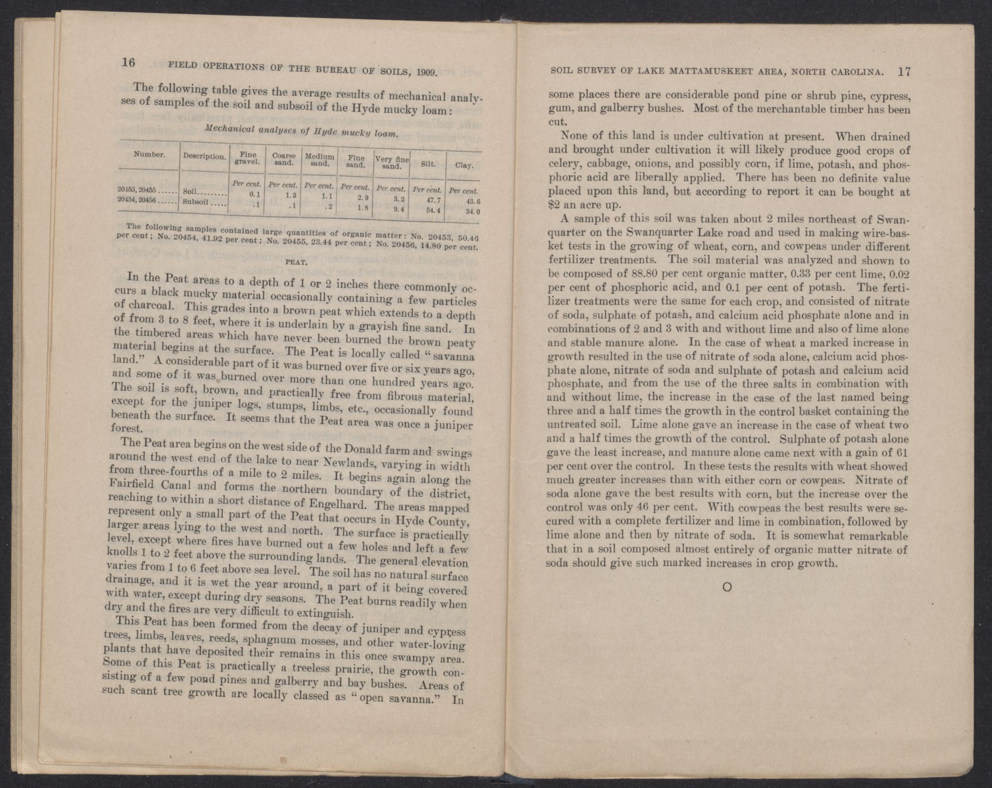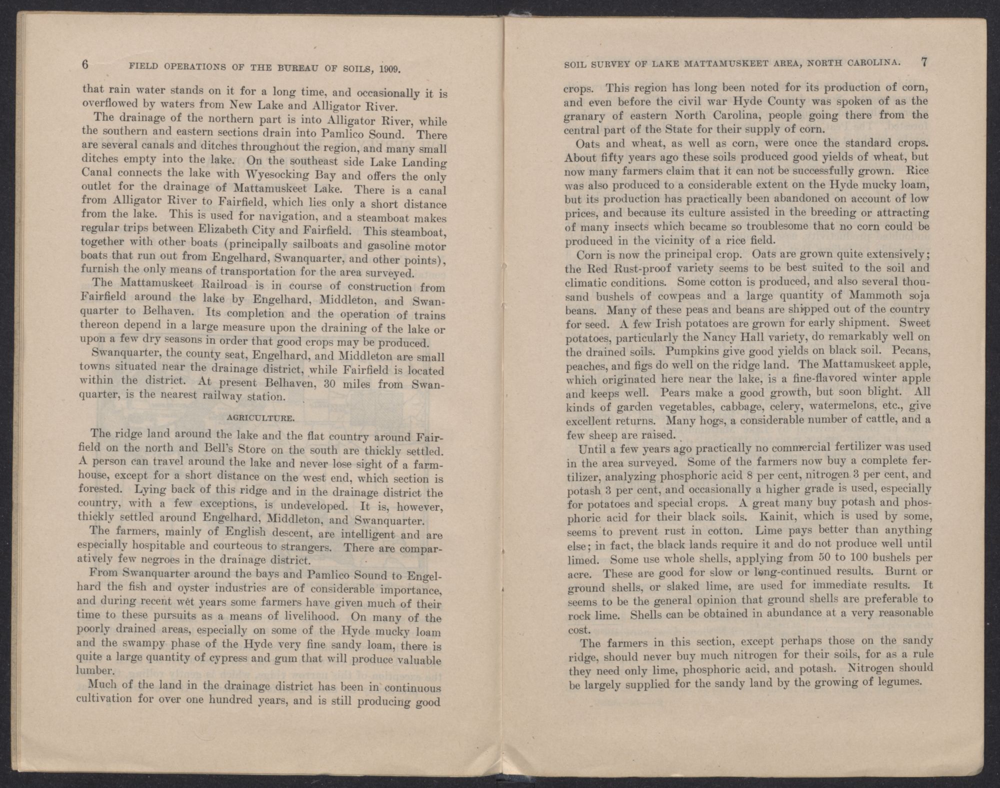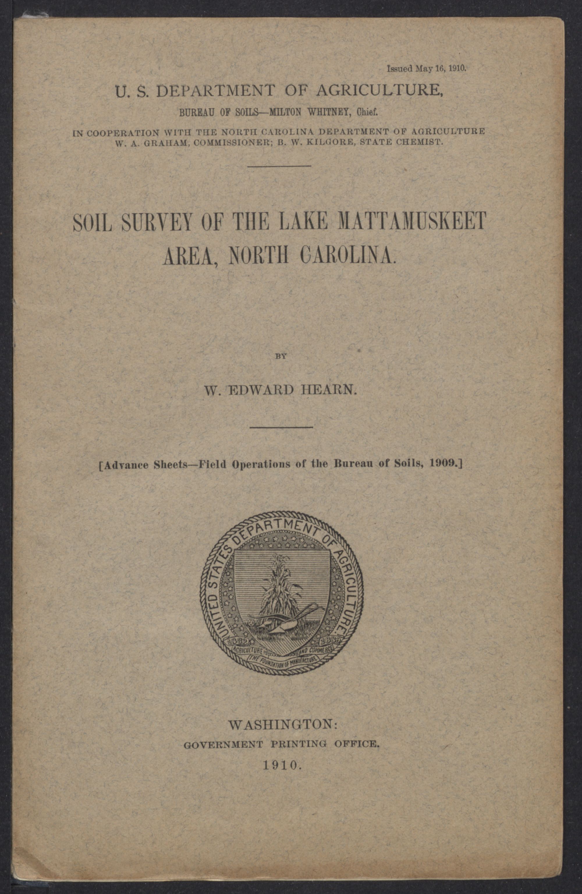 Issued May 16, 1910. U. S. DEPARTMENT OF AGRICULTURE, BUREAU OF SOILS—MILTON WHITNEY, Chief. IN COOPERATION WITH THE NORTH CAROLINA DEPARTMENT OF AGRICULTURE W. A. GRAHAM, COMMISSIONER; B. W. KILGORE, STATE CHEMIST. SOIL SURVEY OF THE LAKE MATTAMUSKEETAREA, NORTH CAROLINA.BYW. EDWARD HEARN. [Advance Sheets—Field Operations of the Bureau of Soils, 1909.]United States Department of Agriculture 1862 Agriculture is the Foundation of Manufacture and Commerce 1889Seal of the United States Department of AgricultureWASHINGTON:GOVERNMENT PRINTING OFFICE.1910.