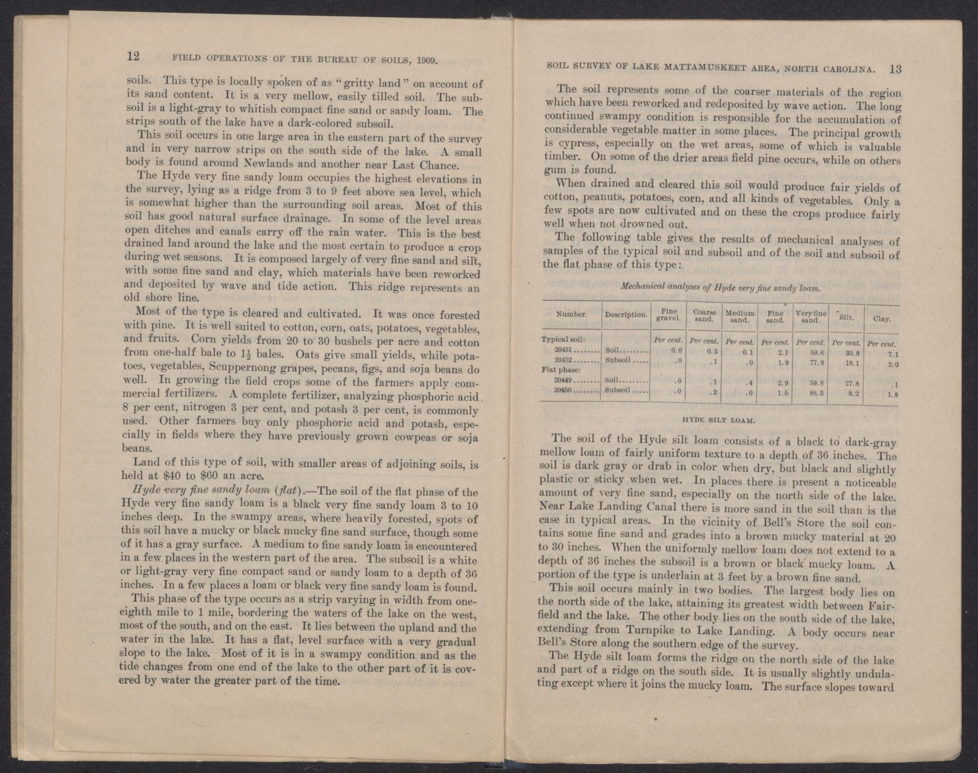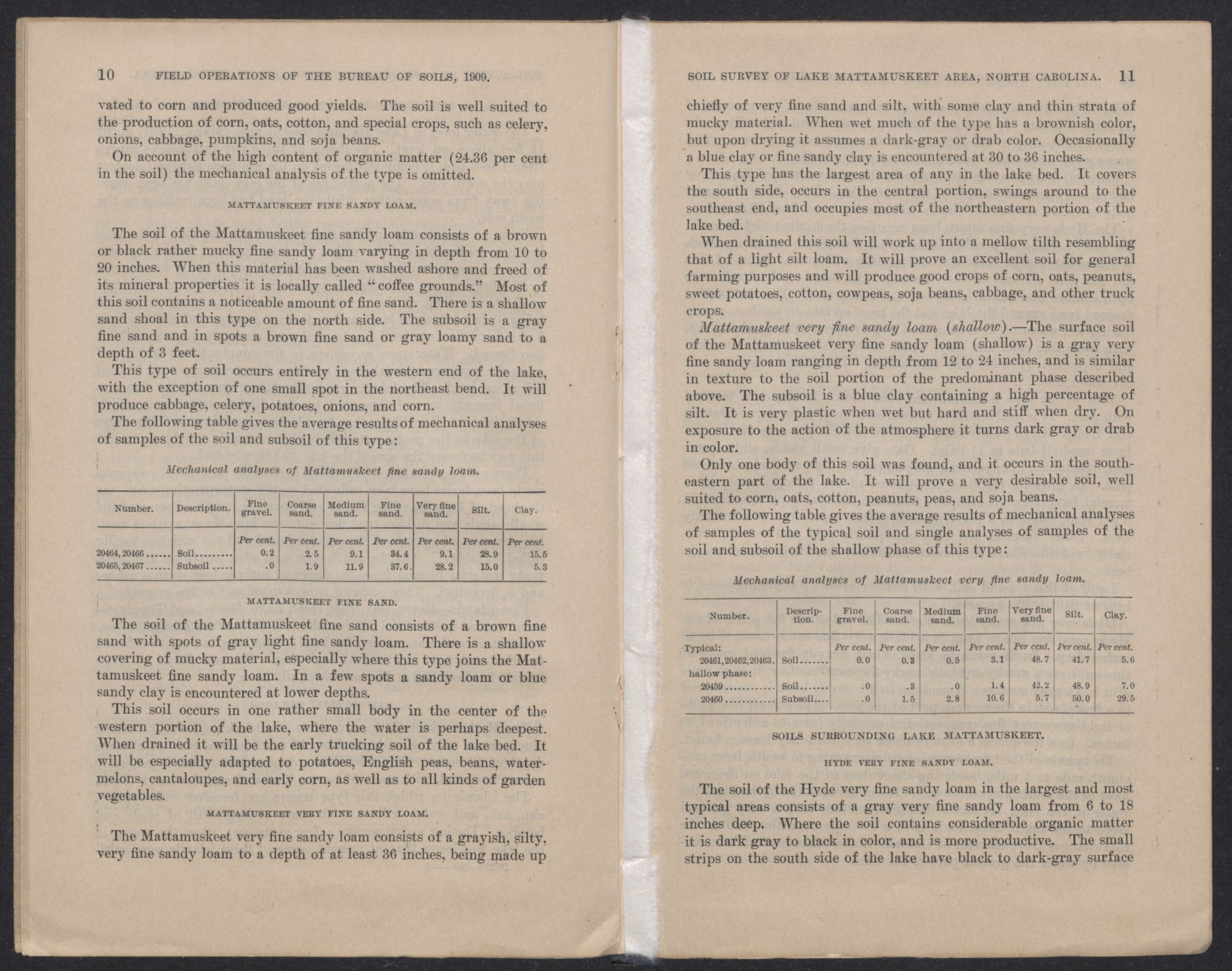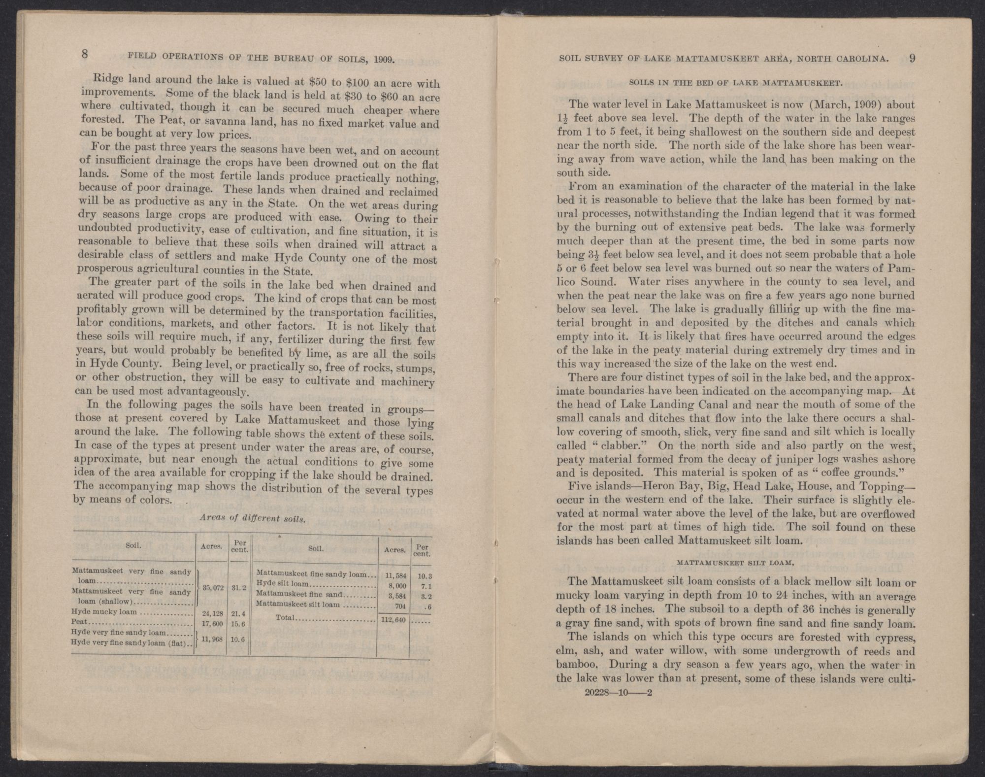 Issued May 16, 1910. U. S. DEPARTMENT OF AGRICULTURE, BUREAU OF SOILS—MILTON WHITNEY, Chief. IN COOPERATION WITH THE NORTH CAROLINA DEPARTMENT OF AGRICULTURE W. A. GRAHAM, COMMISSIONER; B. W. KILGORE, STATE CHEMIST. SOIL SURVEY OF THE LAKE MATTAMUSKEETAREA, NORTH CAROLINA.BYW. EDWARD HEARN. [Advance Sheets—Field Operations of the Bureau of Soils, 1909.]United States Department of Agriculture 1862 Agriculture is the Foundation of Manufacture and Commerce 1889Seal of the United States Department of AgricultureWASHINGTON:GOVERNMENT PRINTING OFFICE.1910.