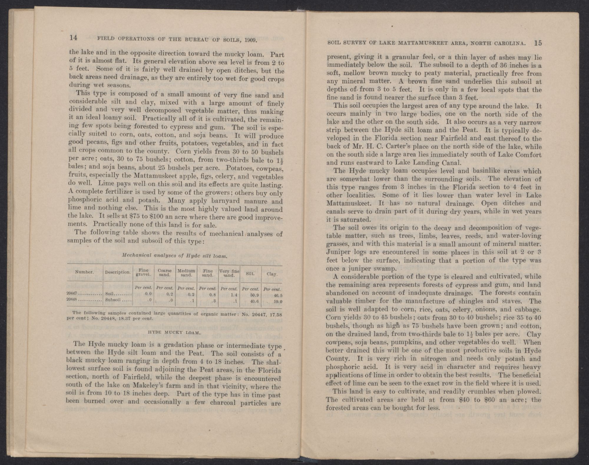 For the past three years the seasons have been wet, and on account of insufficient drainage the crops have been drowned out on the flat lands. Some of the most fertile lands produce practically nothing, because of poor drainage. These lands when drained and reclaimed will be as productive as any in the State. On the wet areas during dry seasons large crops are produced with ease. Owing to their undoubted productivity, ease of cultivation, and fine situation, it is reasonable to believe that these soils when drained will attract a desirable class of settlers and make Hyde County one of the most prosperous agricultural counties in the State.